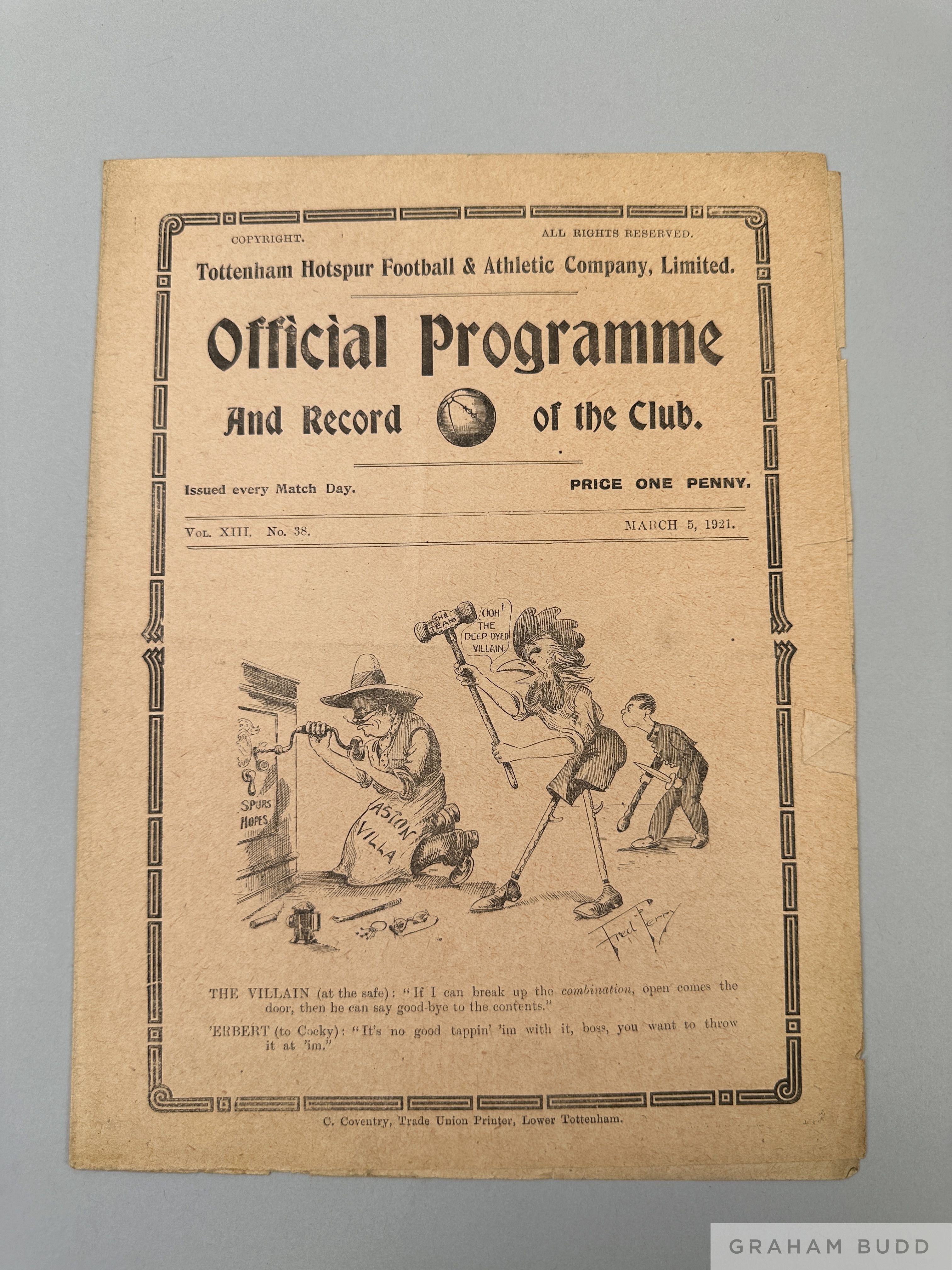 Tottenham Hotspur v. Aston Villa, English Cup 4th Round home match programme, 5th March 1921 Signs of folds, pencil text on team page