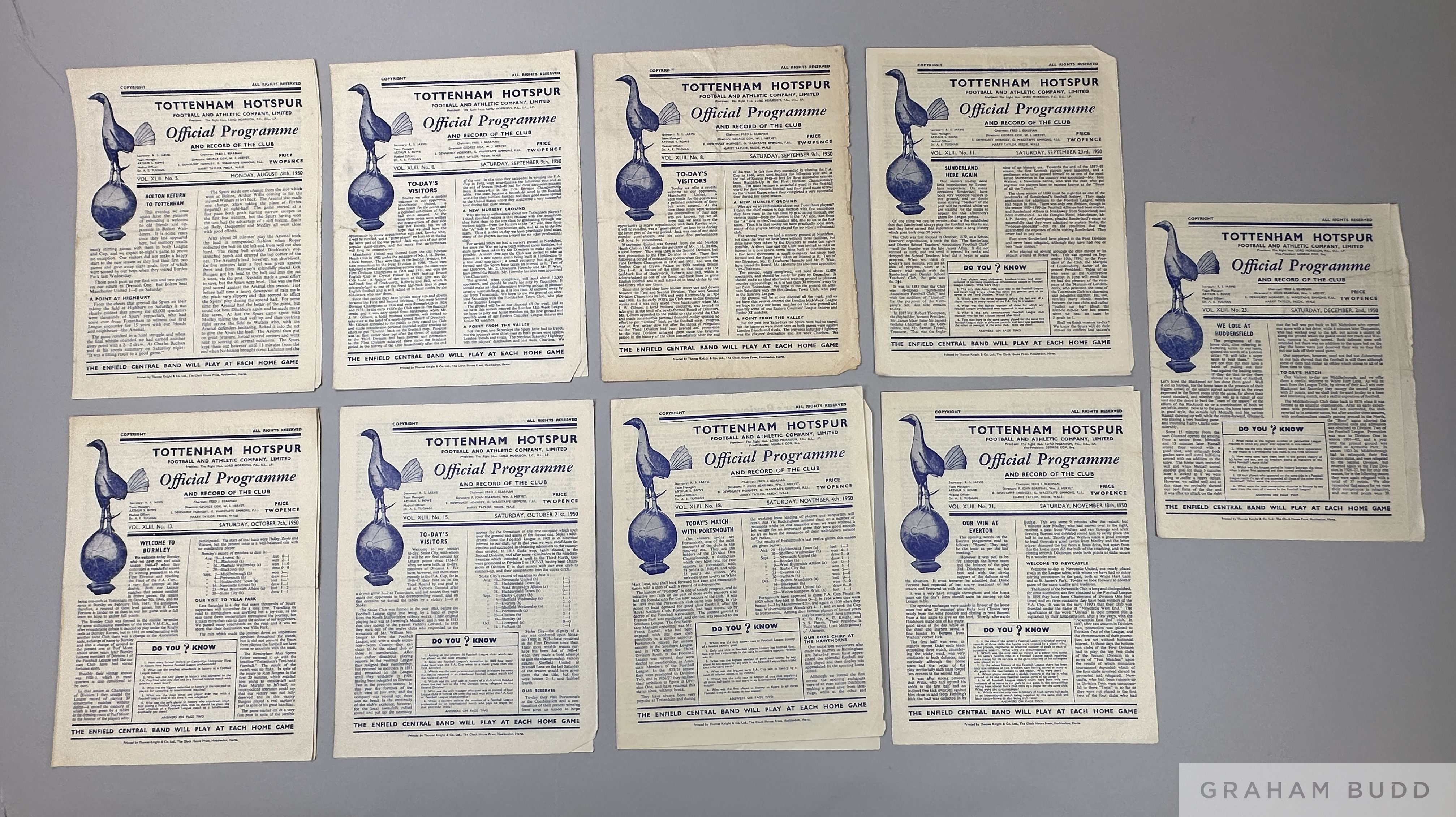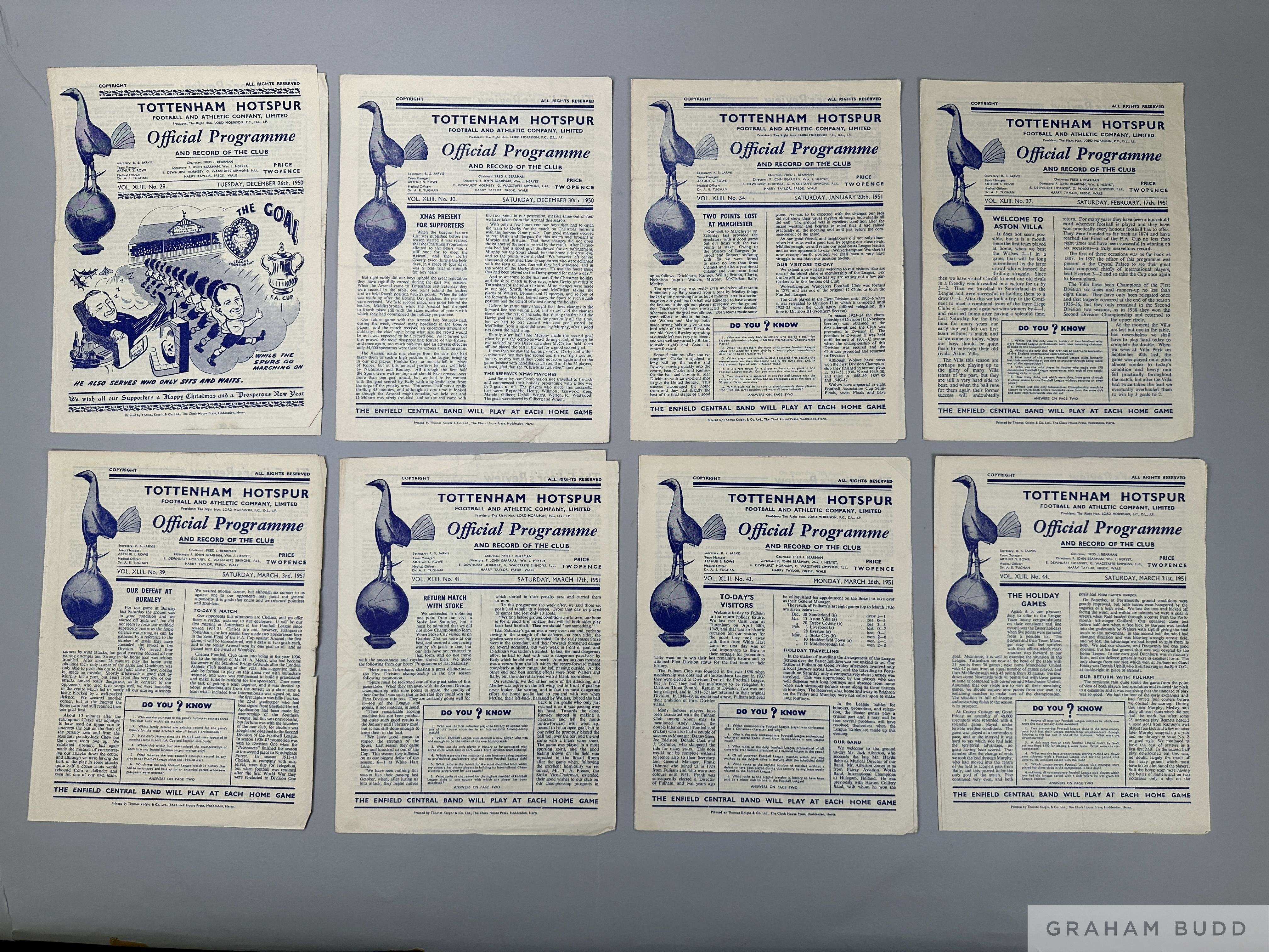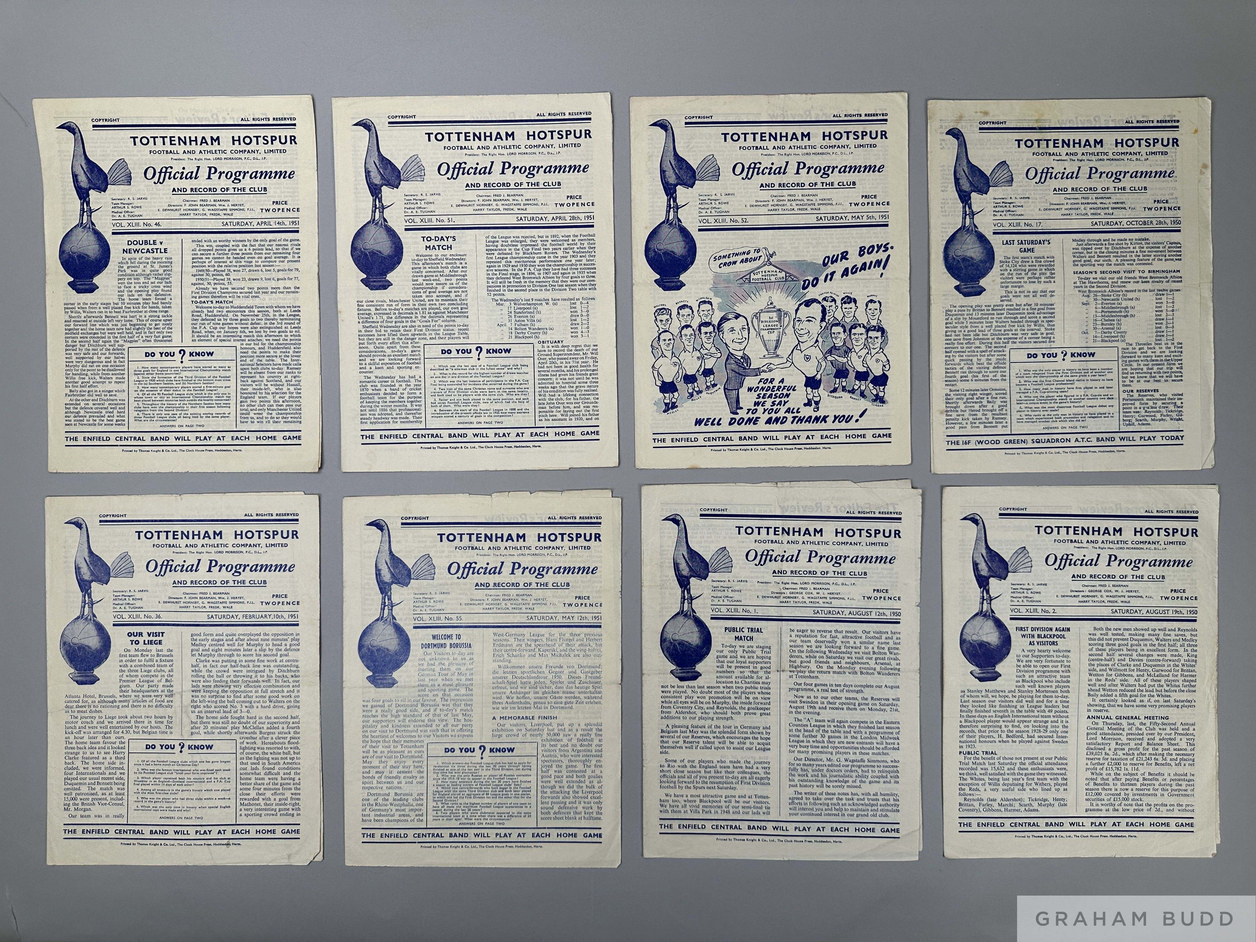 A complete run of Tottenham Hotspur home league match programmes 1950-51 lacking Arsenal 23rd December 1950, including Whites v. Reds, 12th August 1950, Manchester United, 9th September 1950 (two copies), Ipswich Town Reserves, 28th October 1950, Brenford Reserves, 10th February 1951 and Borussia Dortmund, 12th May 1951