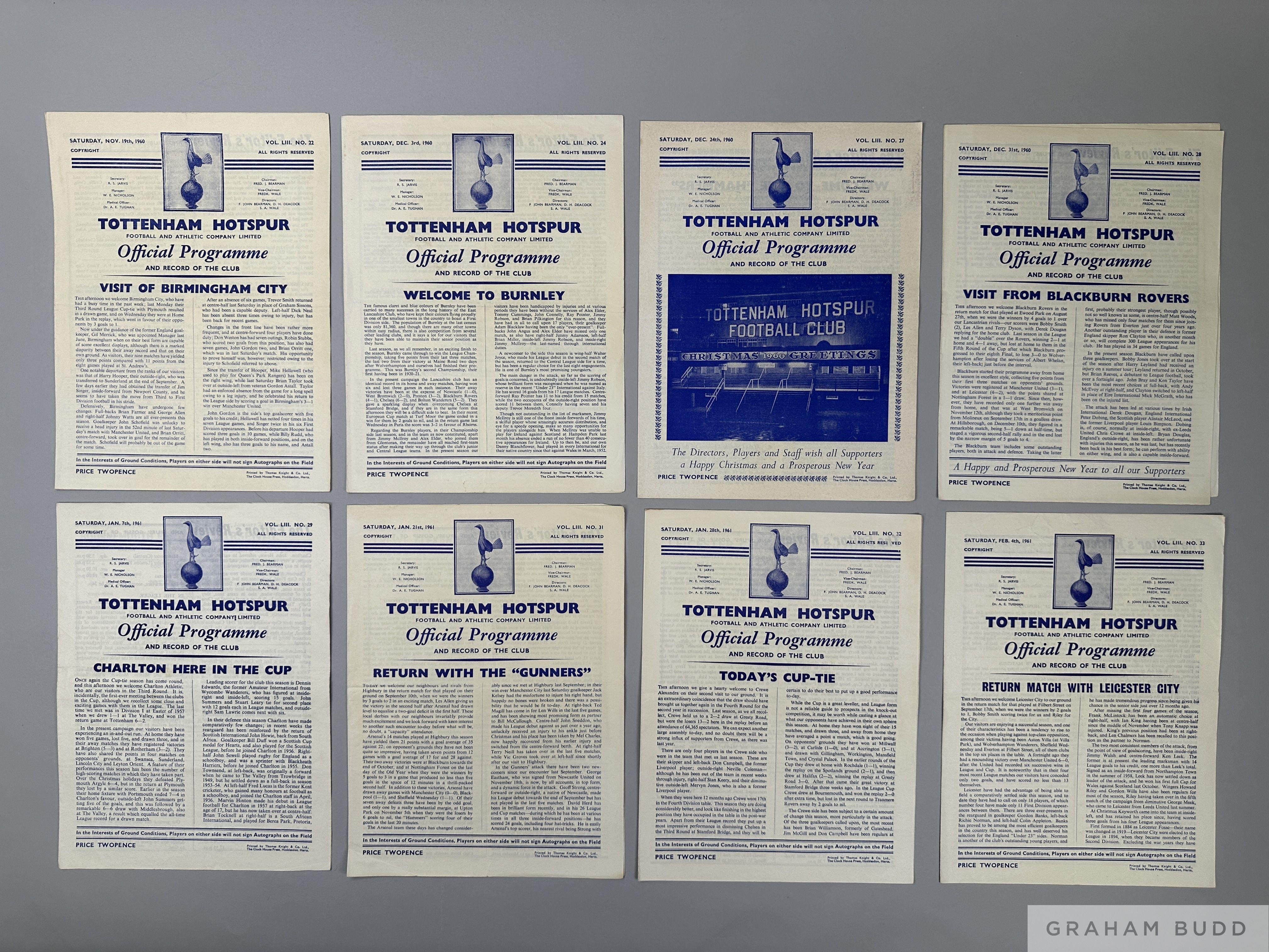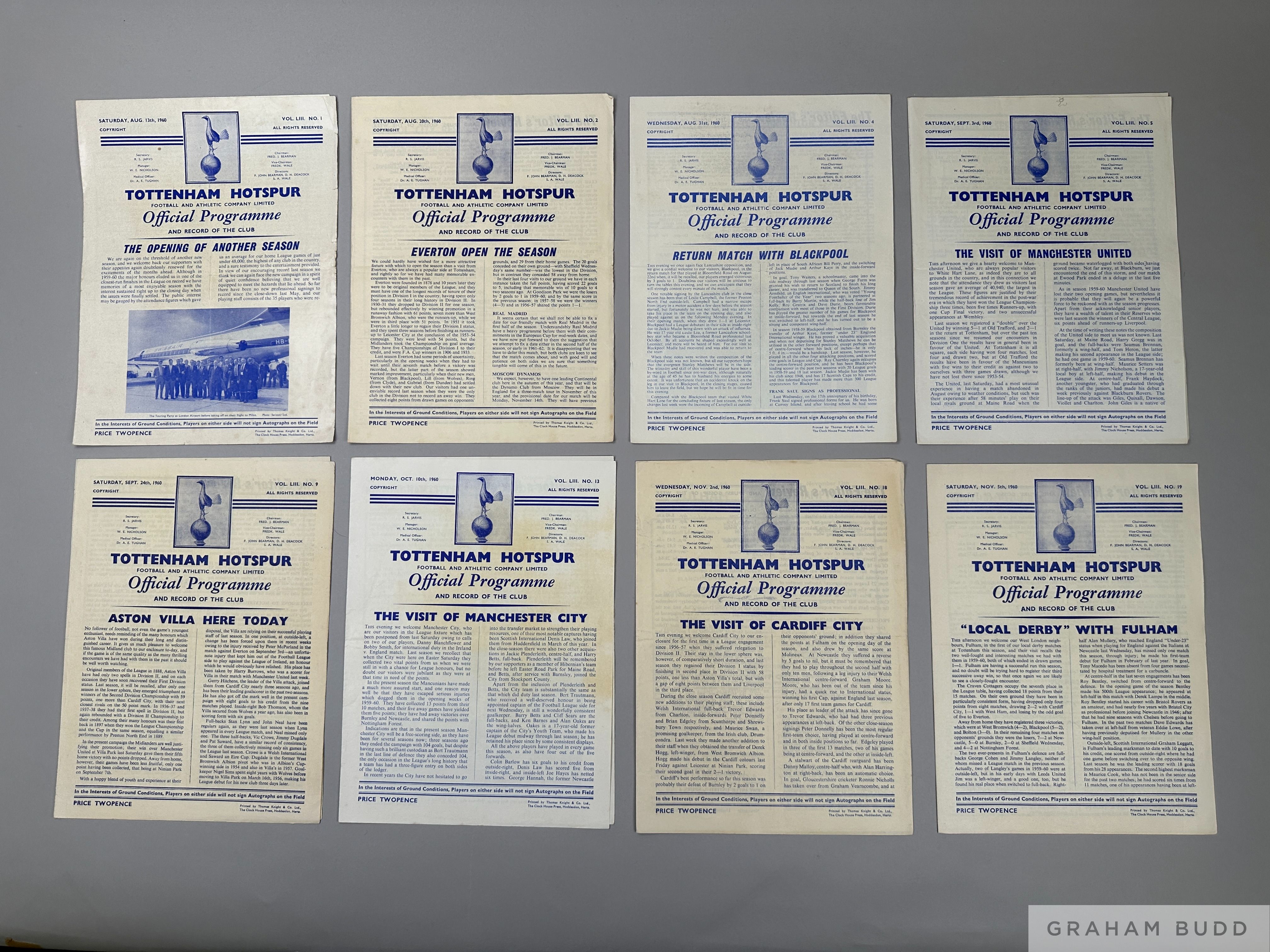 A complete run of Tottenham Hotspur home league and cup match programmes from "Double-Winning" Season 1960-61 lacking Bolton Wanderers, 14th Septembe
