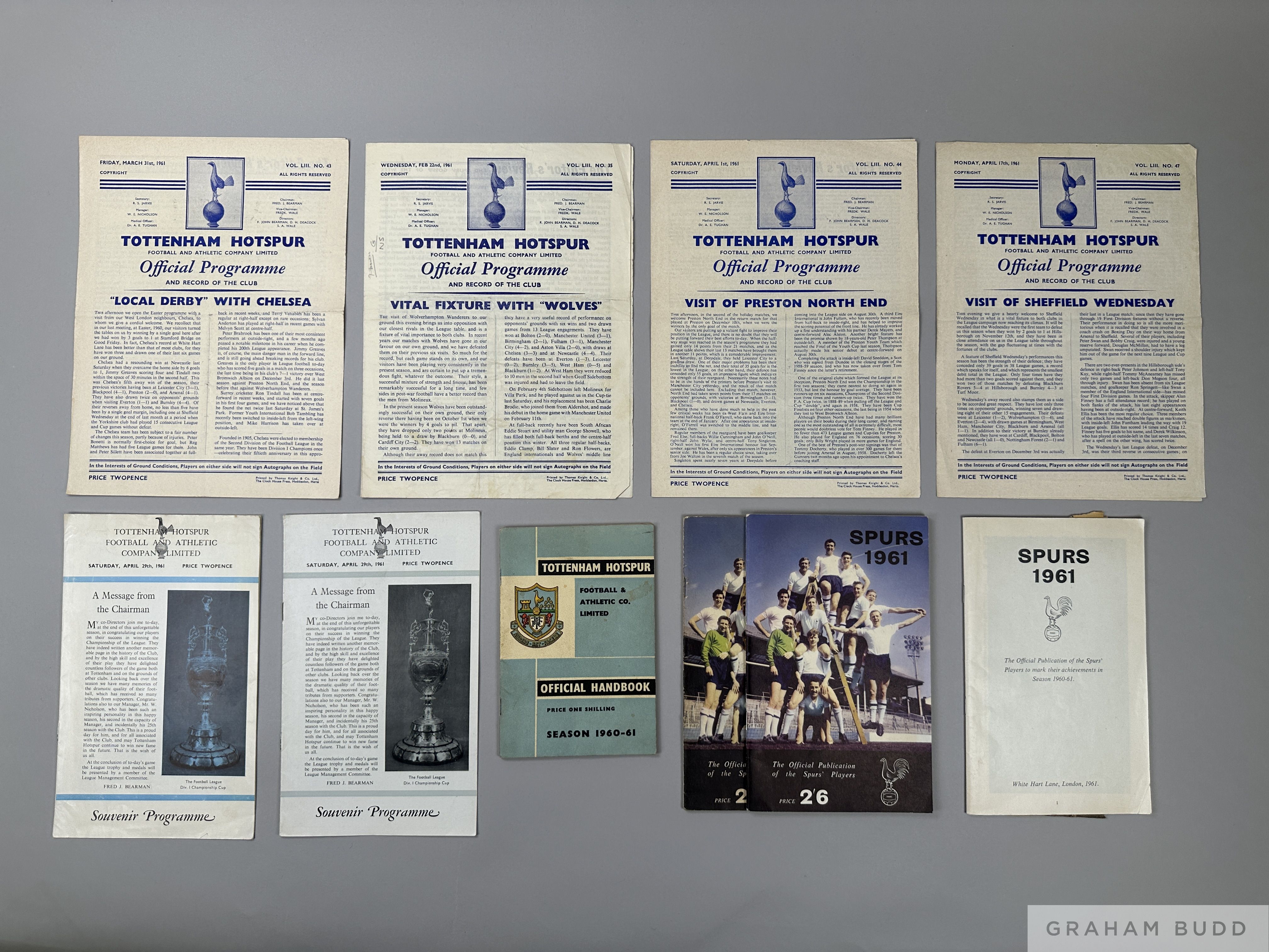 A complete run of Tottenham Hotspur home league and cup match programmes from "Double-Winning" Season 1960-61 lacking Bolton Wanderers, 14th September 1960, Sunderland 6th Round replay, 8th March and Nottingham Forest 20th April 1961, including Whites v. Blues, 13th August 1960 with handbook and Spurs 1961 (26)