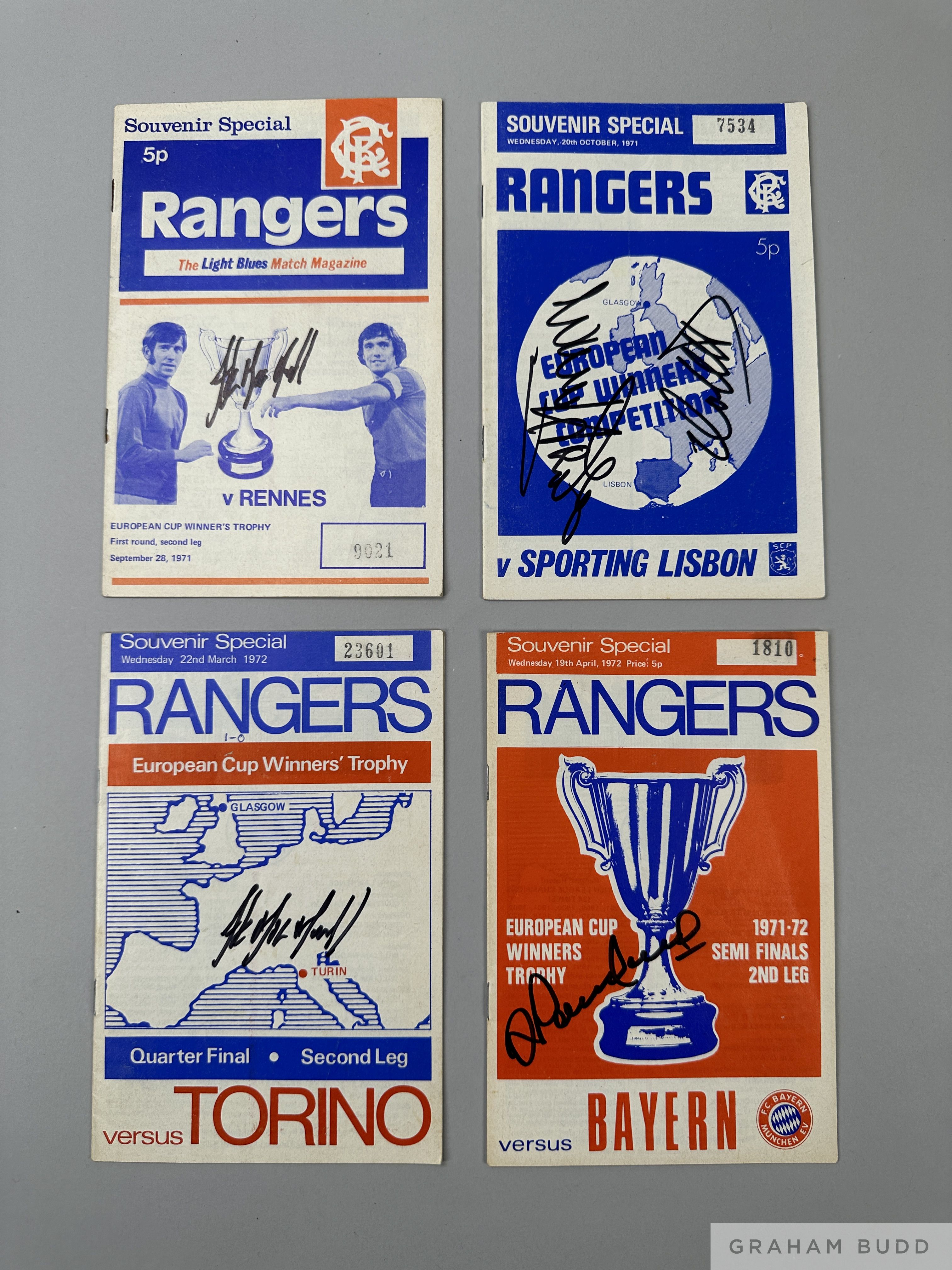 Four Rangers European Cup Winners programmes 1971-72 comprising Rennes, Sporting Lisbon, Torino and Bayern Munich, all signed by the Rangers goalscor