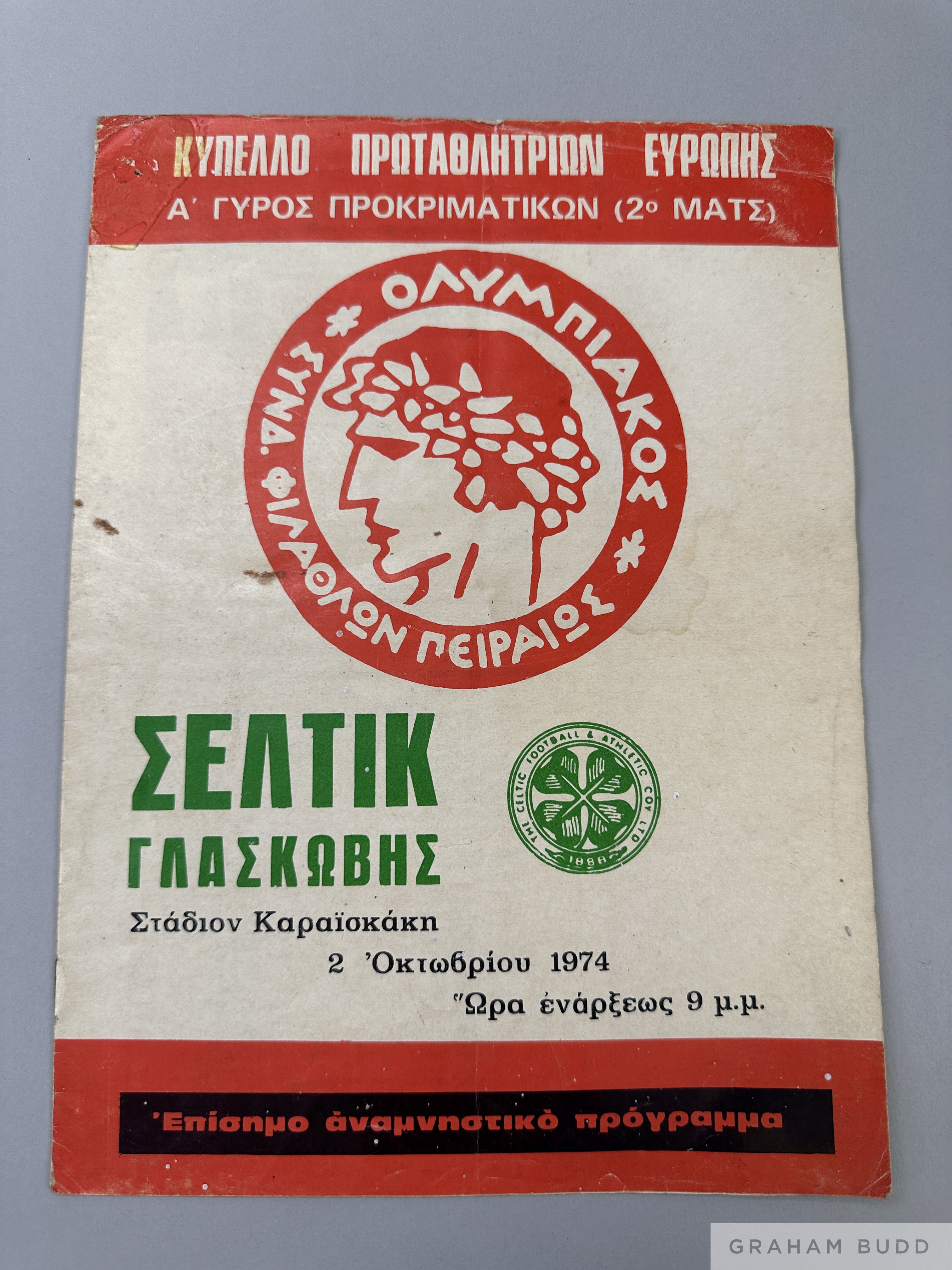 Scarce Olympiakos v. Celtic, European Cup match programme, 2nd October 1974 signs of folds, light creasing, pin holes and some marks, interior littl
