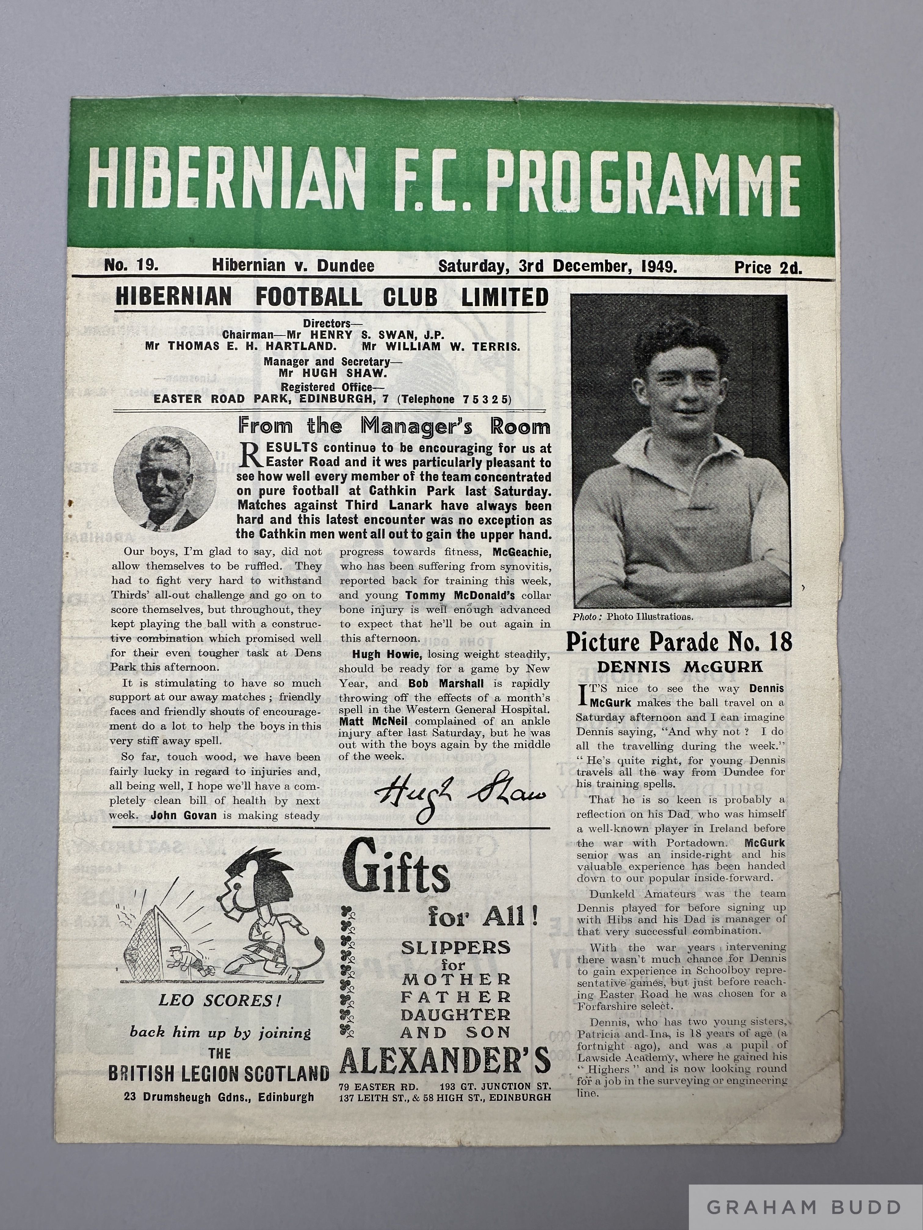 Hibernian v. Dundee Reserve Division C match programme, 3rd December 1949 signs of fold, some creasing, half times scores filled in