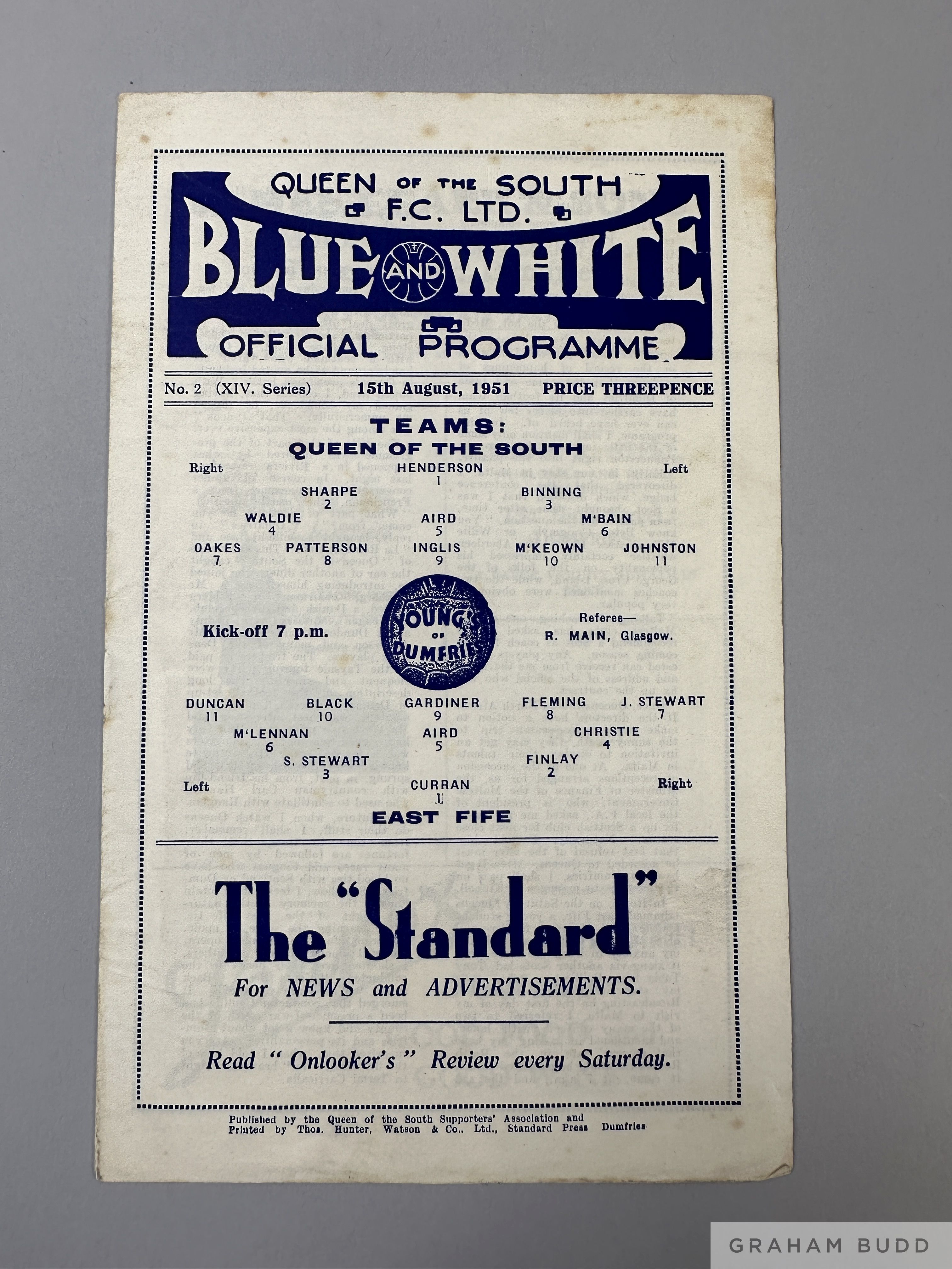 Queen of the South v. East Fife match programme, 15th August 1951 overall good
