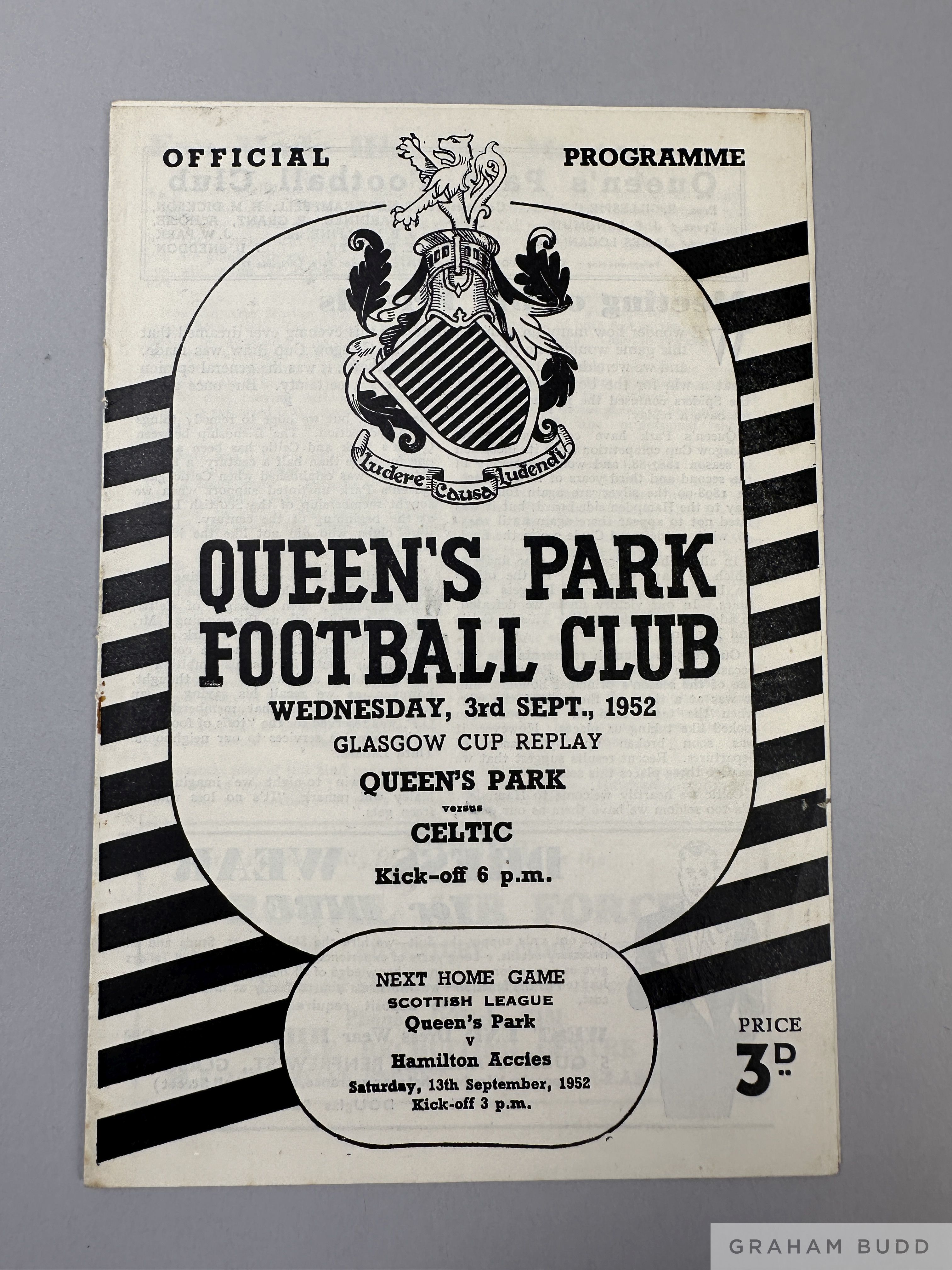 Queen's Park v. Celtic Glasgow Cup 1st Round Replay match programme, 3rd September 1952 staples removed, overall good