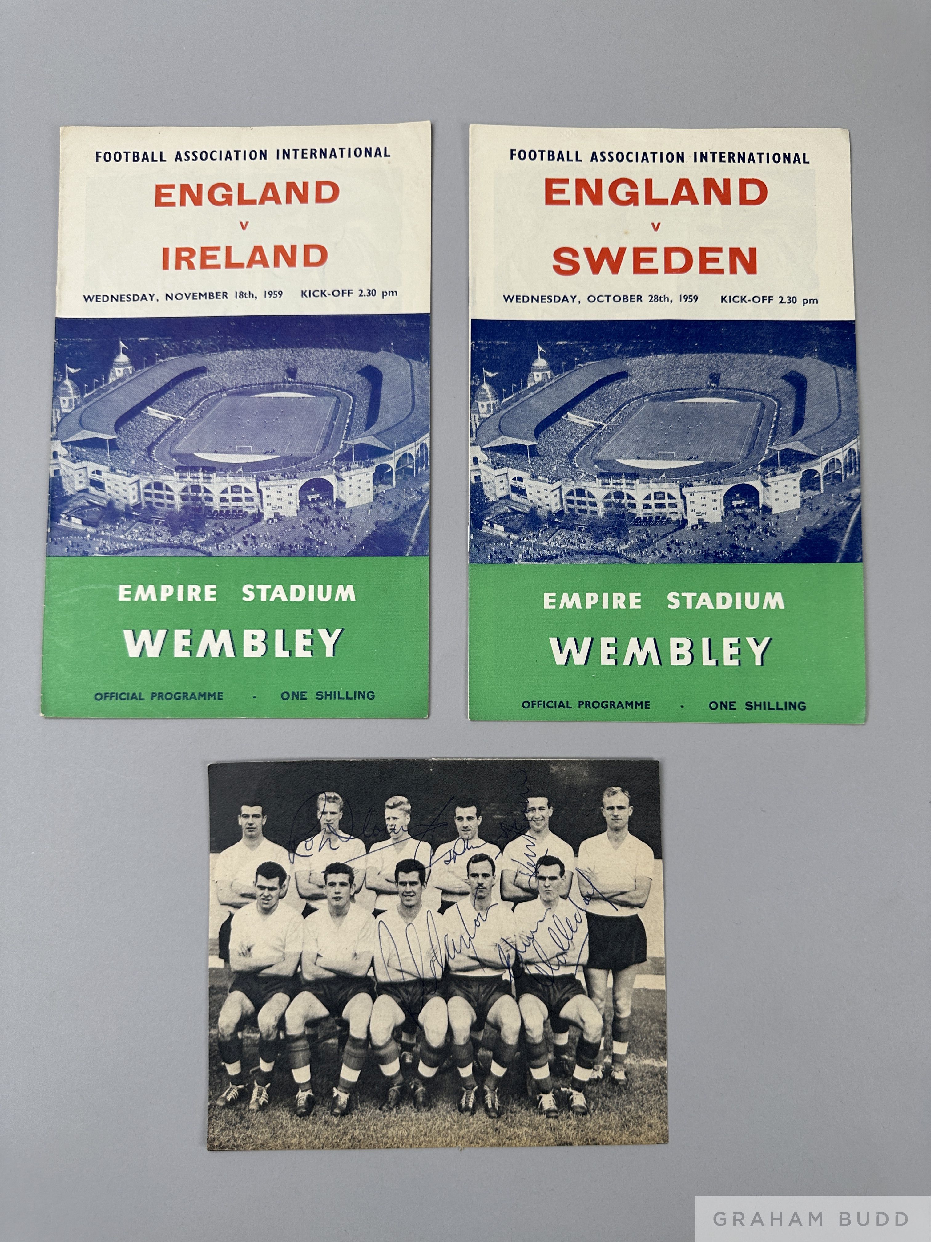 Programmes from the England v Sweden and England v Ireland matches, at Wembley Stadium in 1959, accompanied by a black and white team picture cut from a magazine signed by six England players including Ron Flowers and Ron Springett in blue pen, (3)