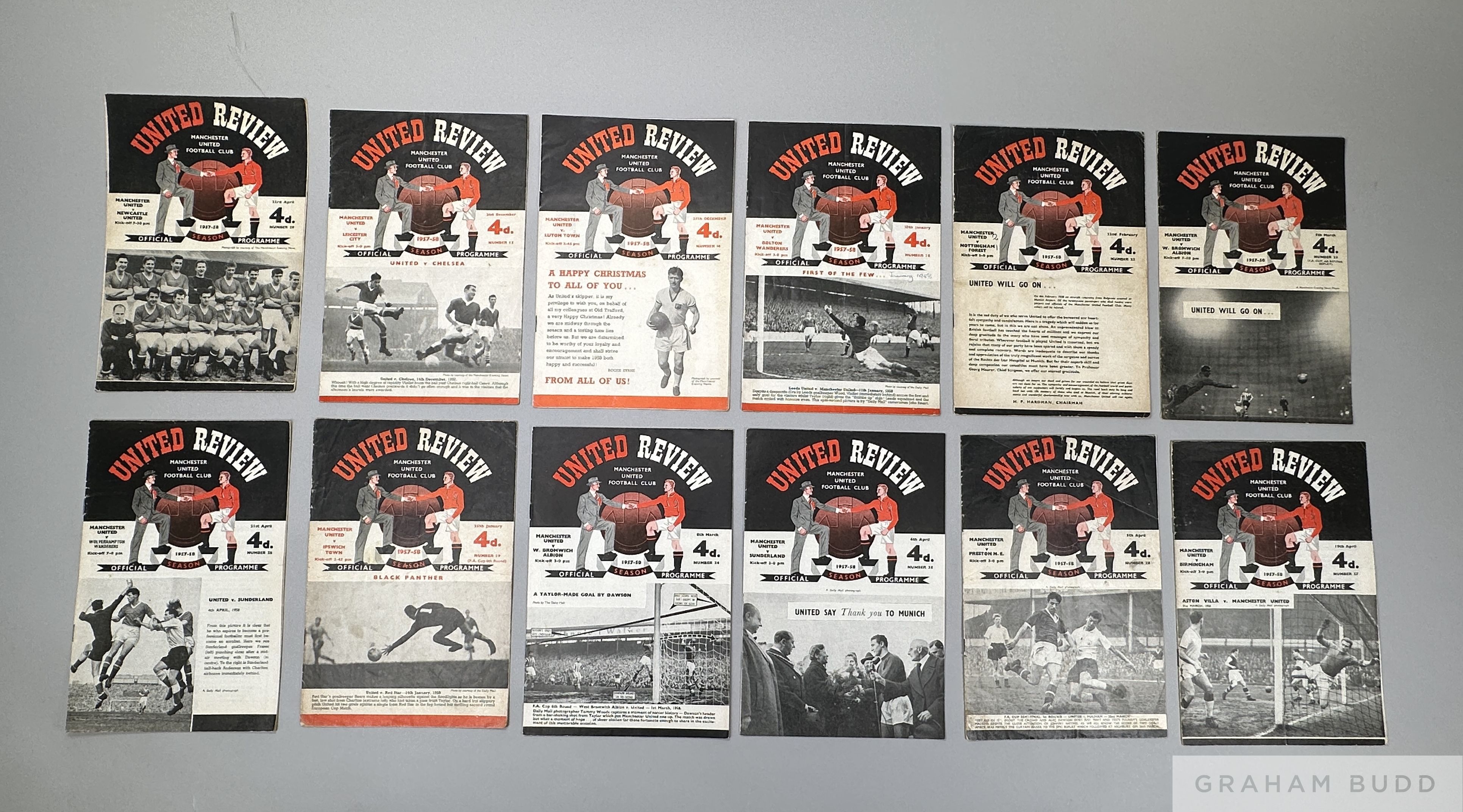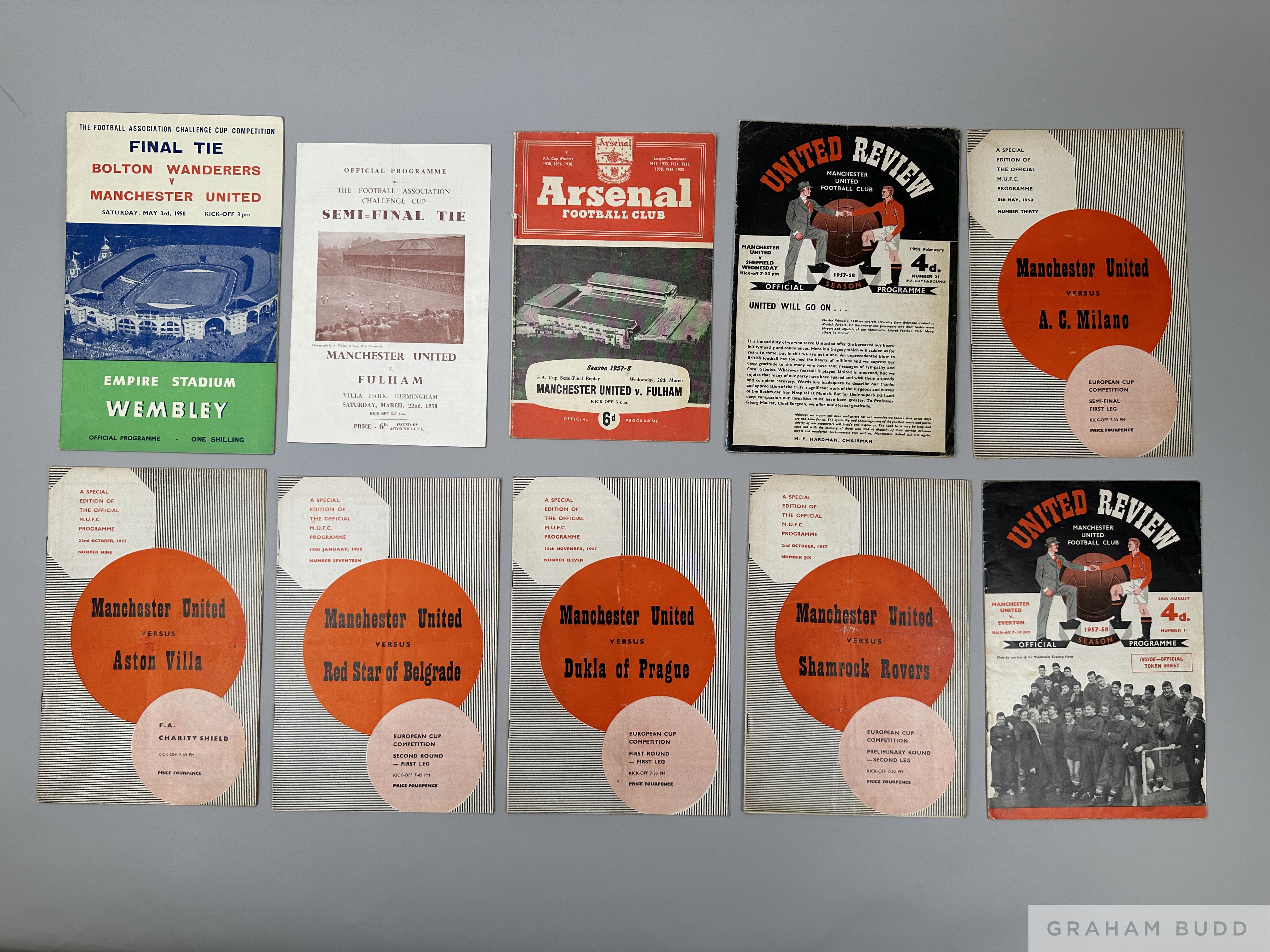 Complete run of Manchester United home league, cup and European programmes, 1957-58 including Shamrock Rovers, 2nd October 1957, Aston Villa, Charity Shield, 22nd October 1957, Dukla Prague, 13th November 1957, Red Star Belgrade, 14th January 1958, A.C. Milan 8th May 1958, Sheffield Wednesday, 19th February 1958, complete with tokens, Fulham, F.A.Cup Semi-Final, 22nd March at Villa Park, Fulham Semi-Final replay 26th March at Highbury and 1958 F.A.Cup final, 3rd May 1958 (32)