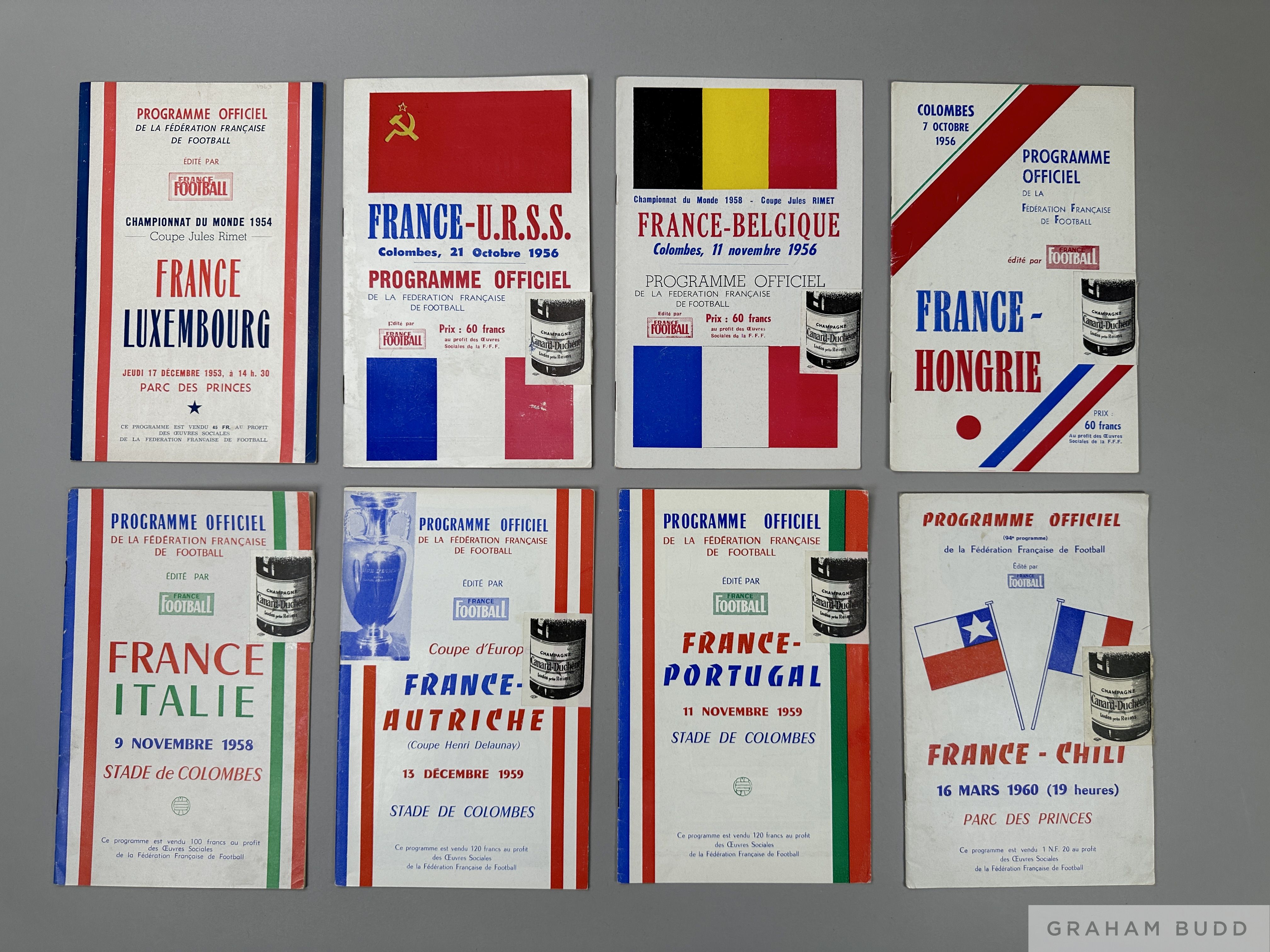 Excellent collection of French international programmes, circa 1950s, including 1953-54 v Luxemburg World Cup; 1956-57 v Russia; v Belgium World Cup; v Hungary, last match played by the great Hungarian team before Hungarian revolution broke team up; 1958-59 v Italy; 1959-60 v Austria; v Portugal; v Chile, (8)