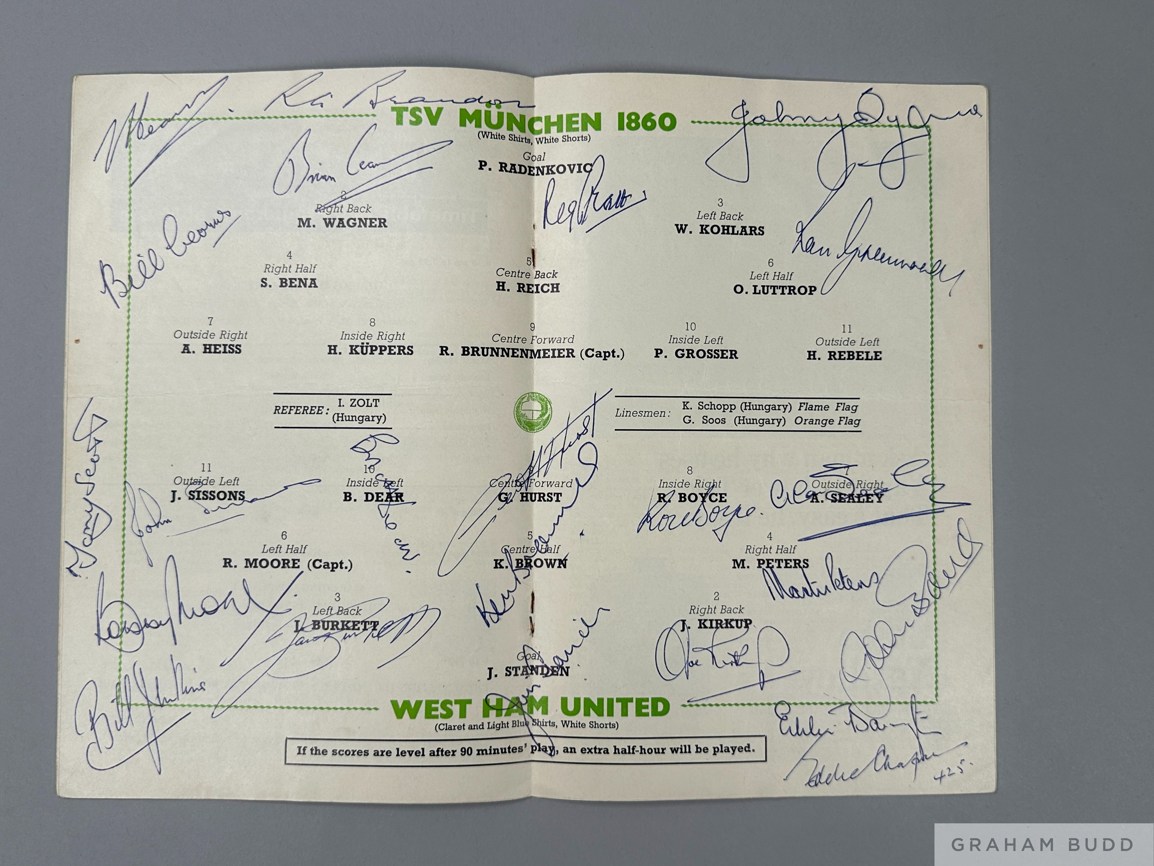 West Ham United v TSV 1860 Munchen European Cup Winners Cup Final signed programme, on 19th May 1965, signed to team page by team including, Standen