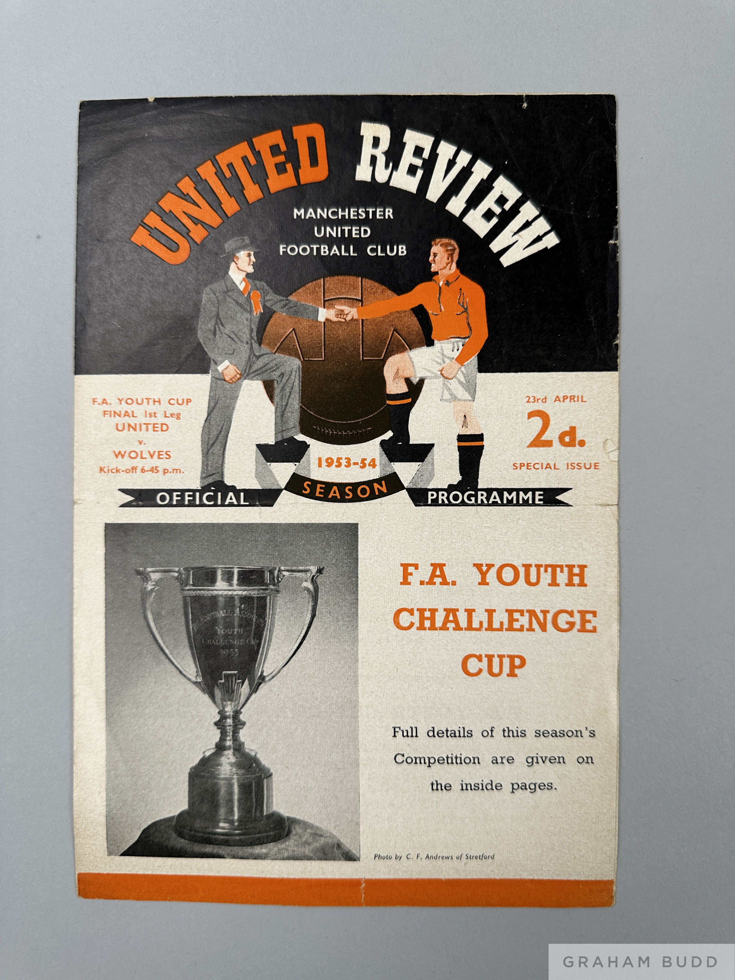 Manchester United Youth v Wolverhampton Youth 1953-54 Youth Cup Final programme, 1st leg, special issue 4-page edition for match, played on 23rd April 1954, the Manchester United team included Edwards, Charlton, Pegg, Scanlon, Colman, etc.