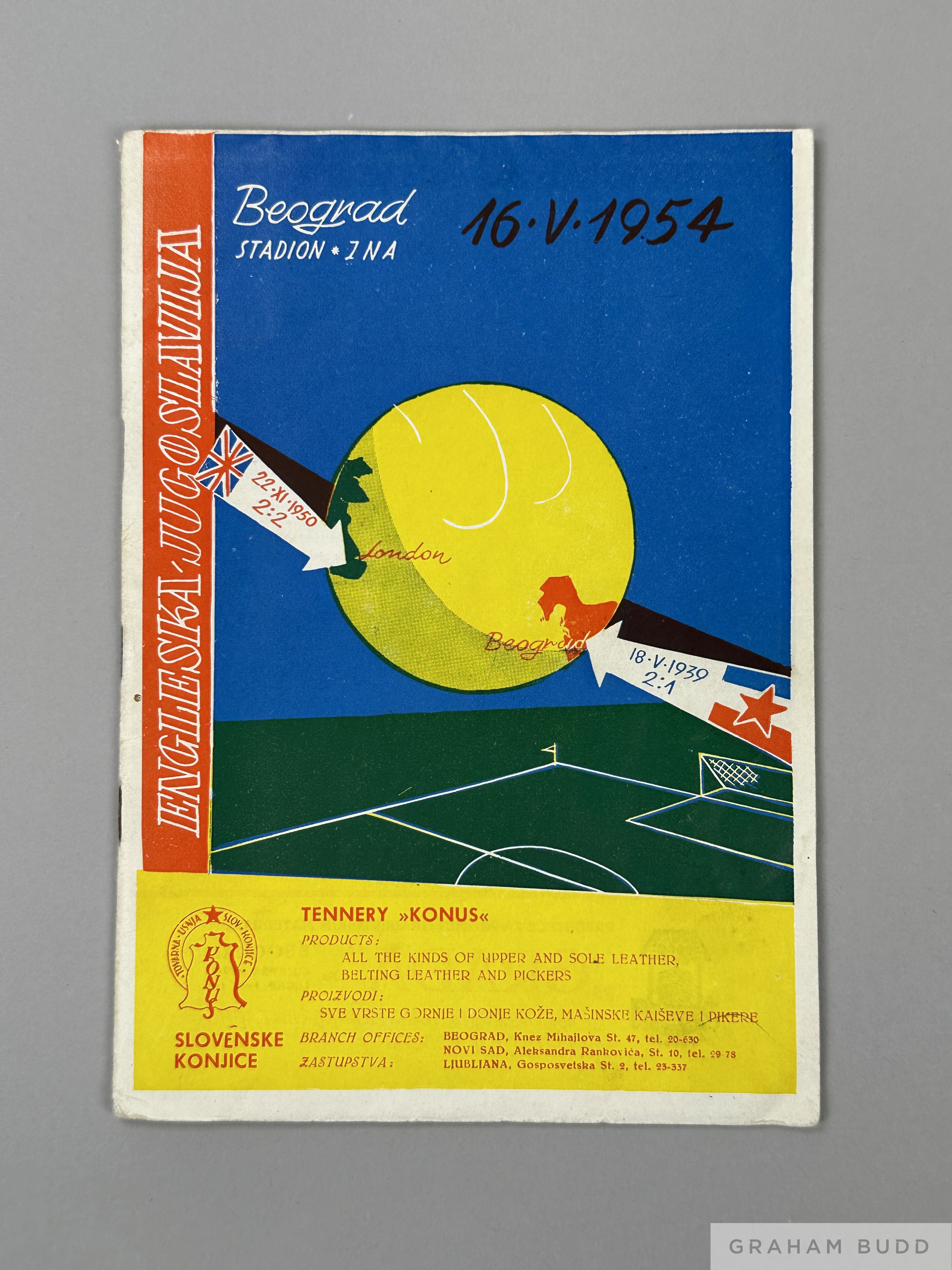 Yugoslavia v England programme for match played in Belgrade on 16th May 1954, this is the official stadium edition issued by the Yugoslav Football Federation with welcome in two languages. The programme is in three parts, a 20-page profile of players from both sides and editorial and two colour supplements attached. A 16-page pink supplement and a 8-page grey supplement. The team line-ups are in grey supplement and have been identified in ink above name. The English team has been written as spoken Birn (Byrne), Fini (Finney), Nikols (Nicholls), etc.; also the programme covers pre-match game Partizan v Red Star Juniors and four athletic events which proceeded match. Yugoslavia won 1-0.