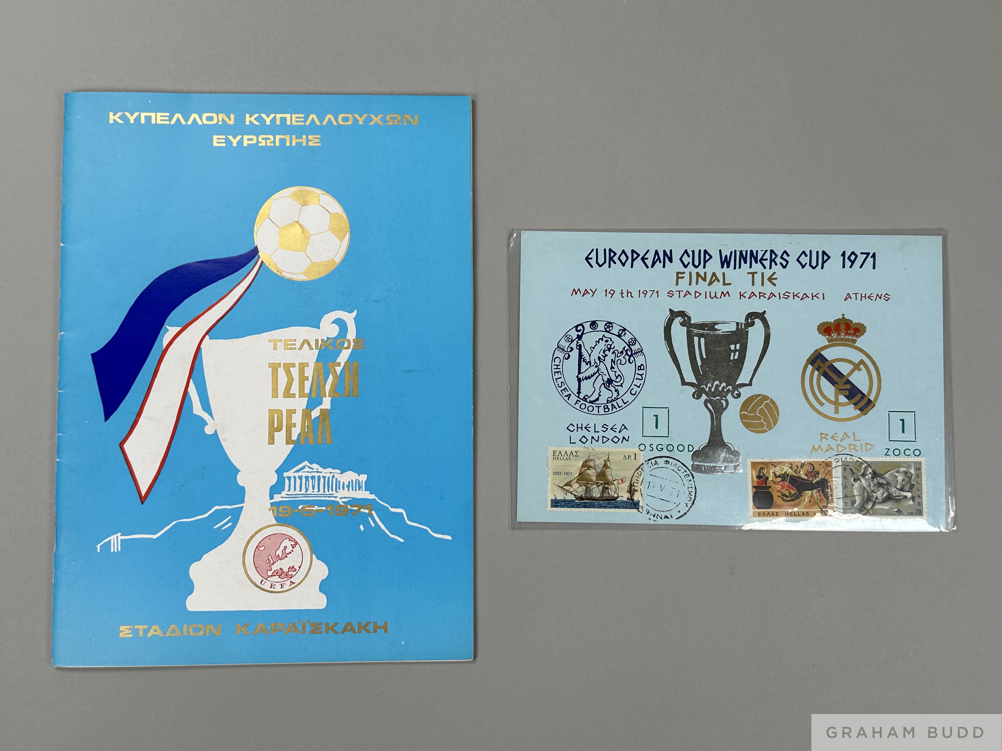 European Cup Winners Cup Final Chelsea v Real Madrid programme, played in Athens, on 19th May 1971, Greek edition, 36-page; sold with unusual FDC wh