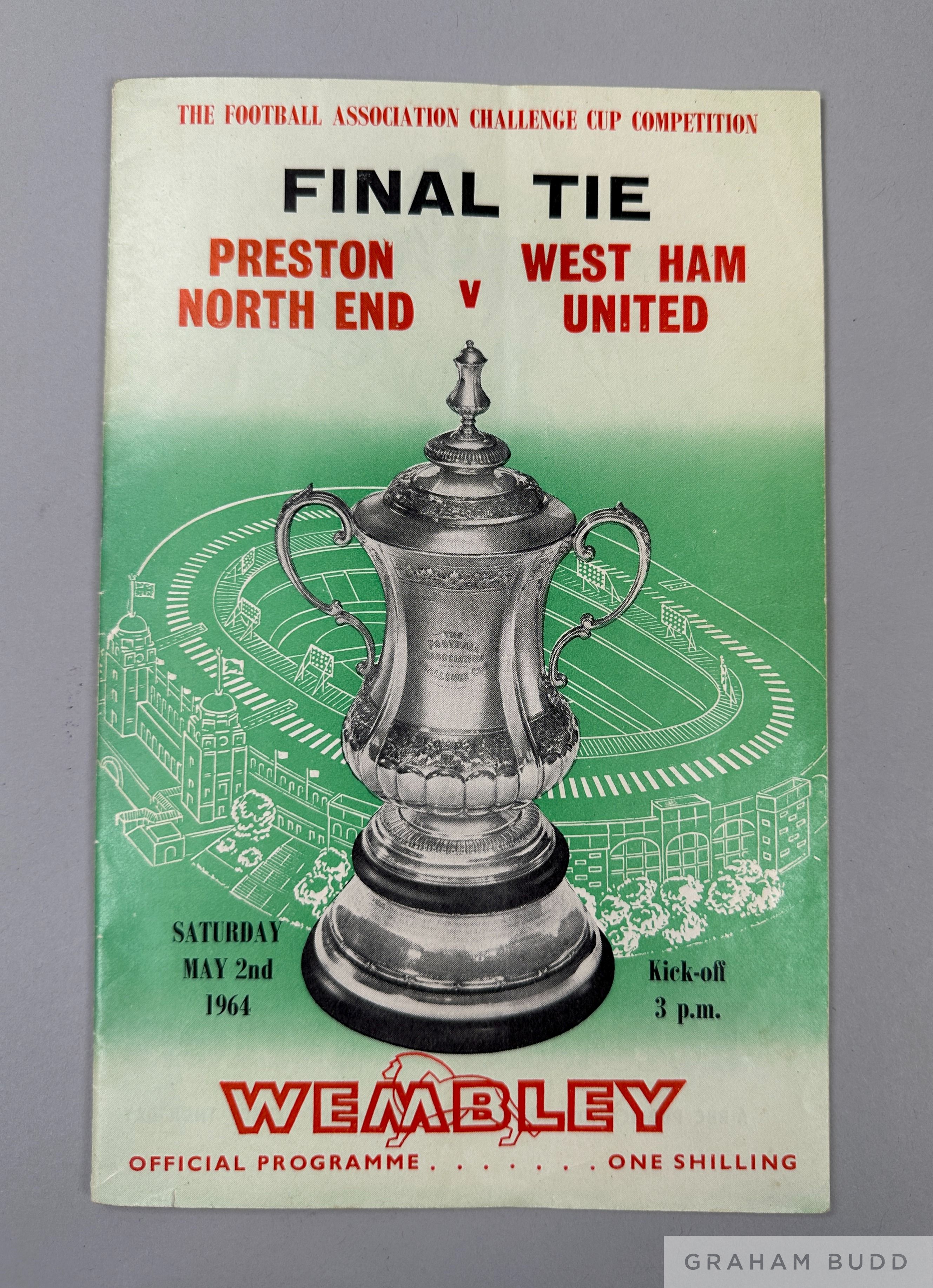 Programme fully autographed in ink by both Preston North End v West Ham United FAC F, 1964, played on 2nd May 1964, clearly signed with no overlapping signatures to team line-up page. Preston North End 11 players and reserves include Dawson, Kendall, Lawton, Kelly, etc., West Ham United 11 players include Moore, Hurst, Byrne, Standen, etc.