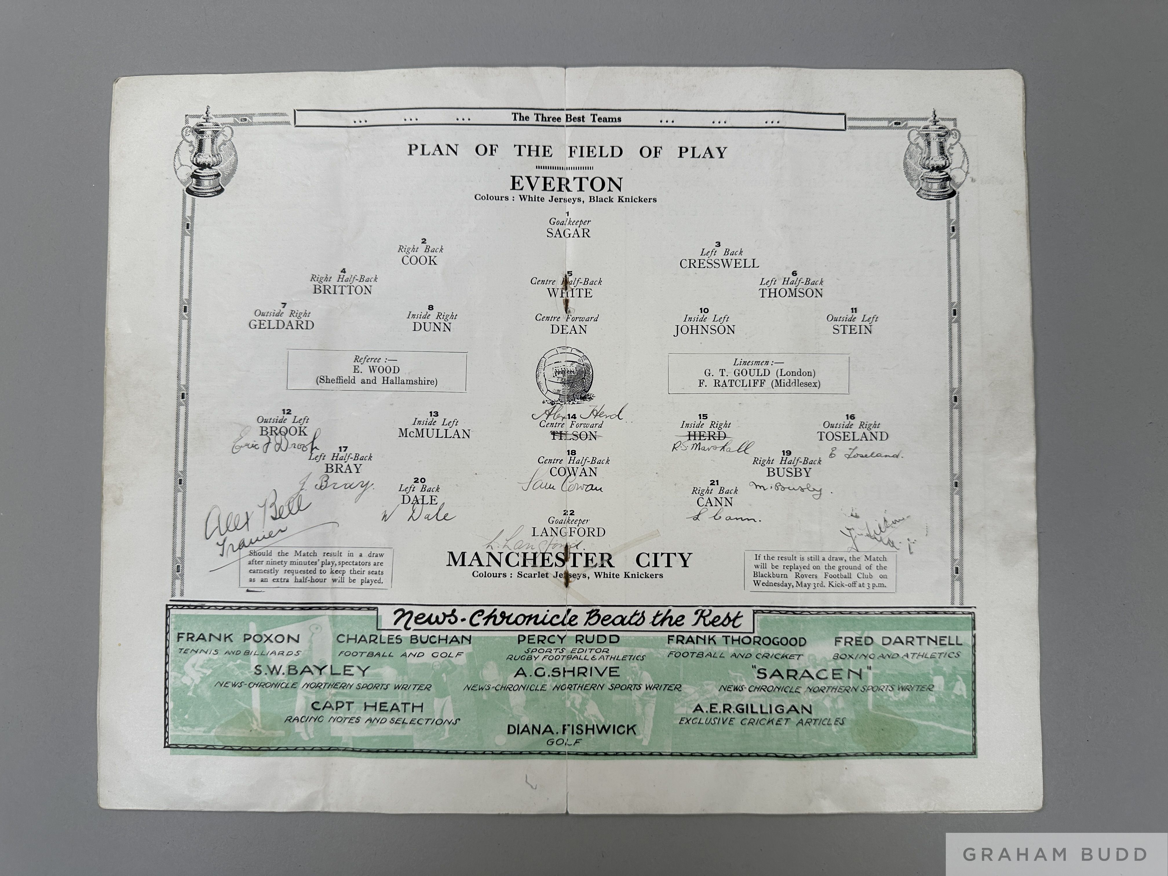 Programme fully autographed in ink by Manchester City 1933 FAC / F, Manchester City v Everton, played on 29th April 1933, clearly signed with no overlapping signatures to team line-up page, includes Busby, Toseland, Langford, Brook (11) and trainer Alex bell