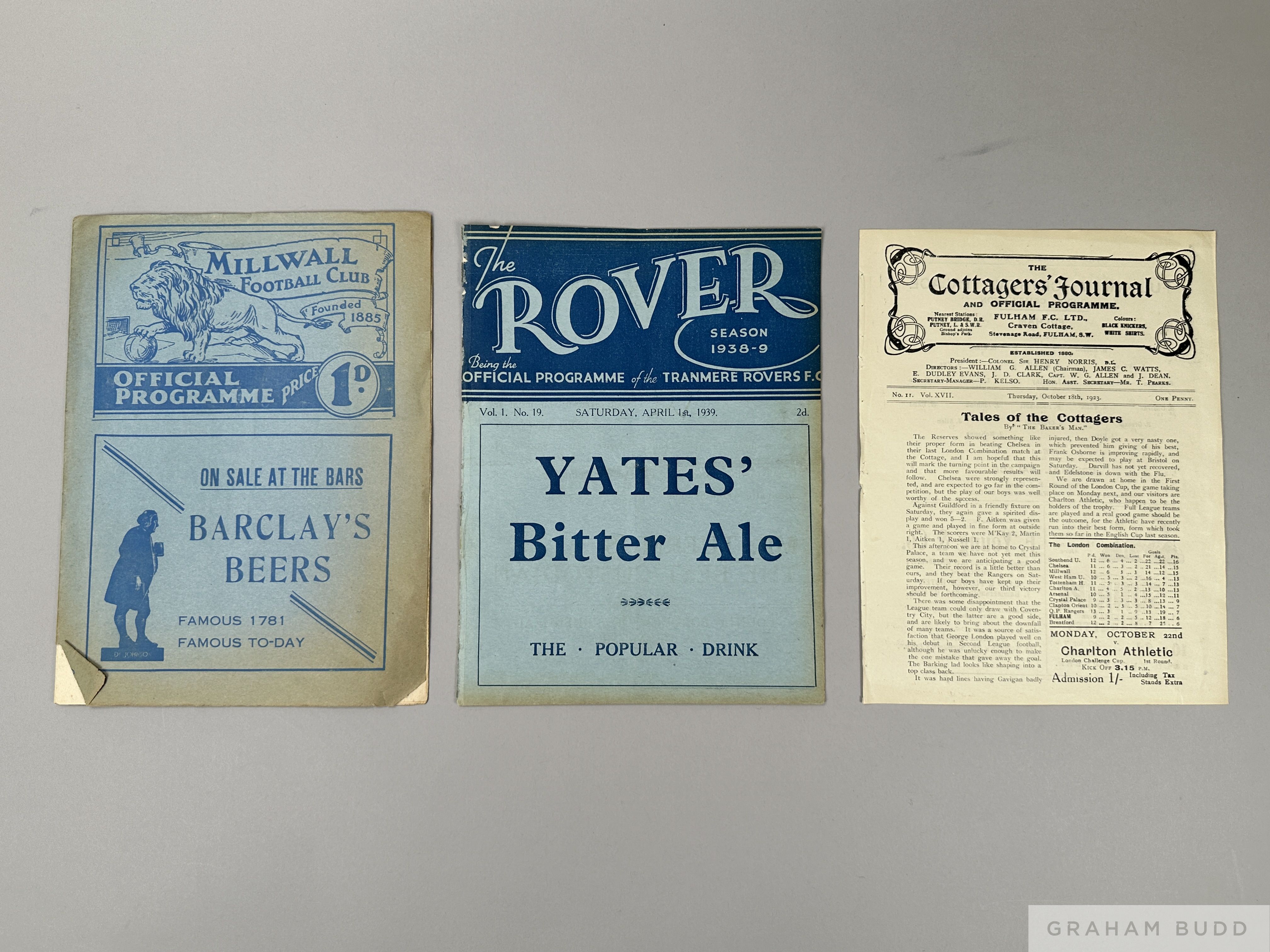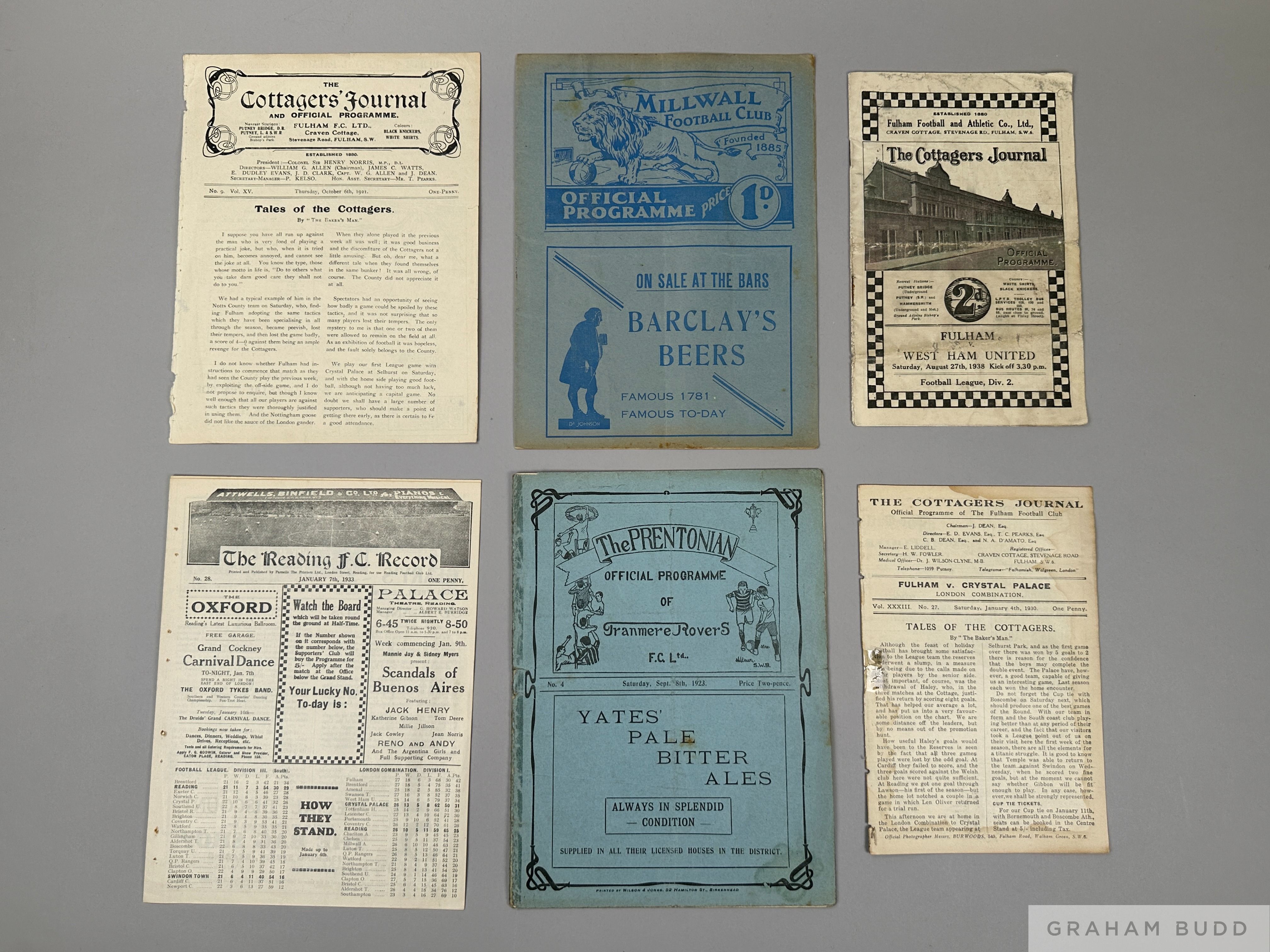 Interesting collection of football programmes dating from 1908-09 to 1938-39, Ilford v London Caledonians 16/12/1912 S/F London Charity Cup; Chester v Tranmere Rovers 1908-09; Norwich v Arsenal 6/5/1935; Norfolk v Norwich Hospital Cup; Chelmsford v Grimsby Town (F) 20/6/1939; Bury v Tottenham Hotspur 1938-39; Crystal Palace v QPR 1938-39; Fulham Res. v Crystal Palace res. single sheet 1921-22; Millwall v Clapton Orient 1936-37; Fulham v West Ham United 1938-39; Reading v Swindon 1932-33; Tranmere Rovers v Southport 1923-24; Fulham Res. v Crystal Palace Res. 1929-30; Millwall v Fulham FAC 1936-37 with press cuttings; Tranmere Rovers v Burnley 1938-39; Fulham Res. v Crystal Palace Res. 1923-24 single sheet, (15 approx.)