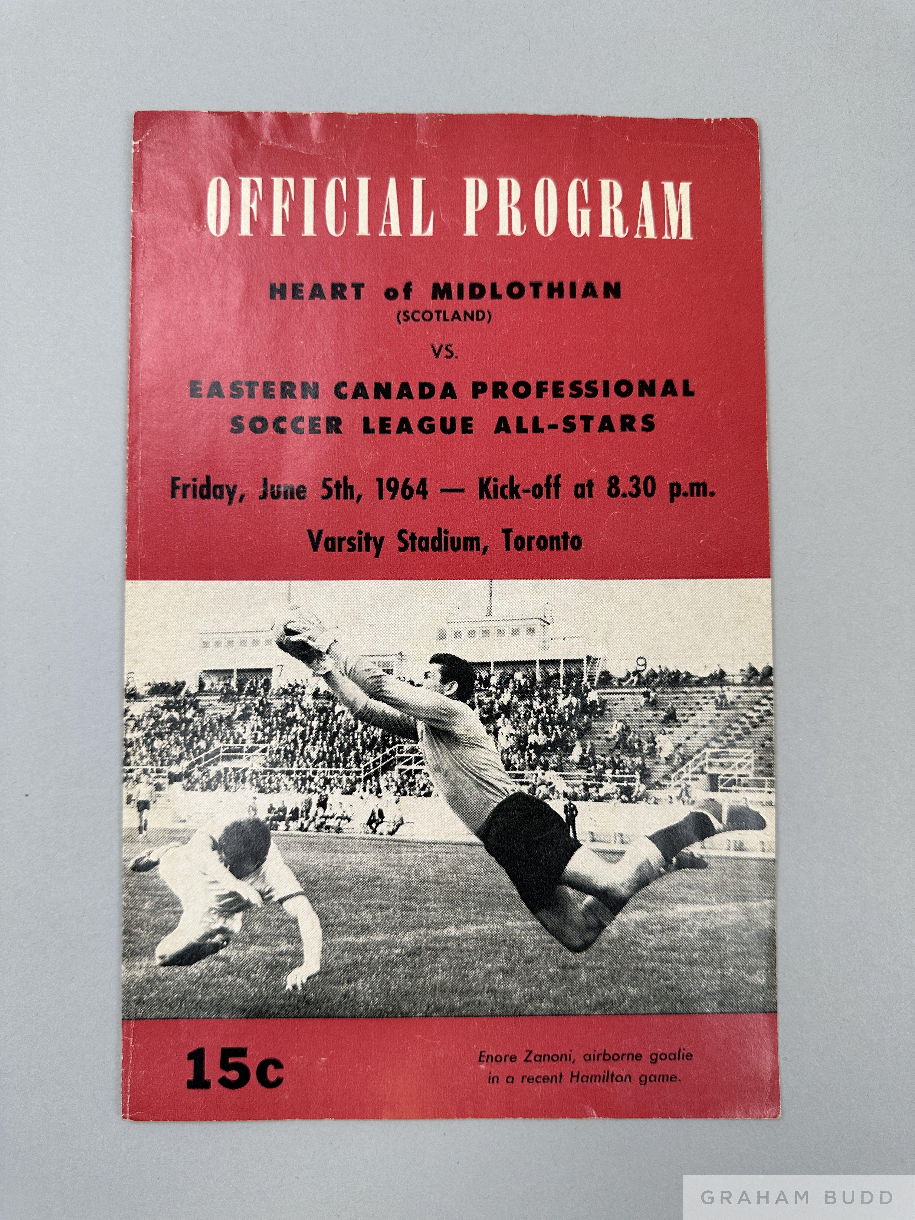 Football programme Heart of Midlothian tour to North America 1964, for match Hearts of Midlothian v Eastern Canada Professionals Soccer League All stars, played at Varsity Stadium, Toronto on 5th June 1964, 8-page edition with profiles of each team