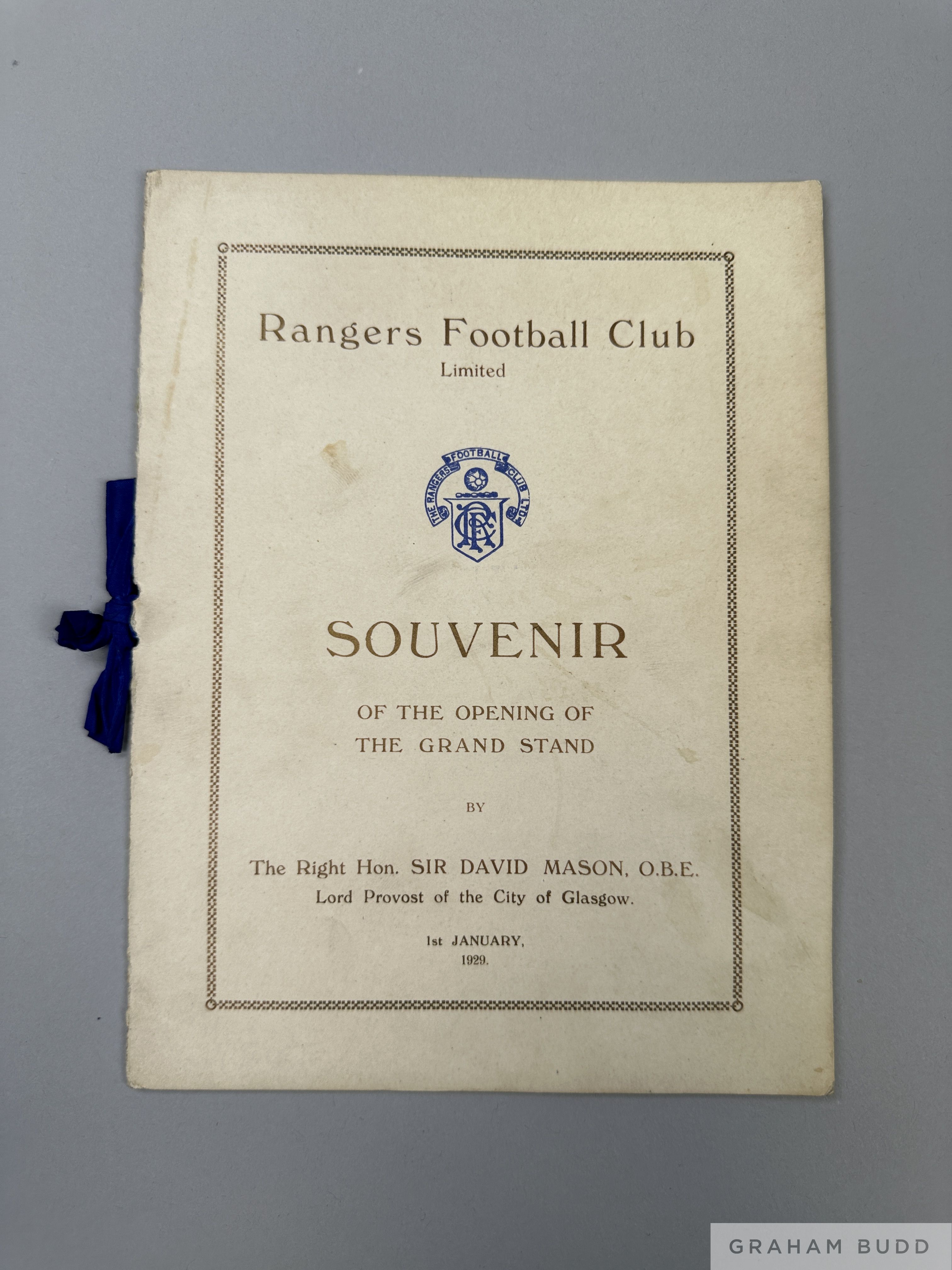 Rangers FC 1929 VIP souvenir of the opening of the Grand Stand on 1st January 1929 by Sir David Mason, with blue ribbon spine, it also incorporates a programme for Rangers v Celtic Scottish League 1st January 1929, kick off at 2pm, 12-pages, giving full details of epic features of the new grand stand, history of previous Rangers ground and club history. Exceedingly rare.