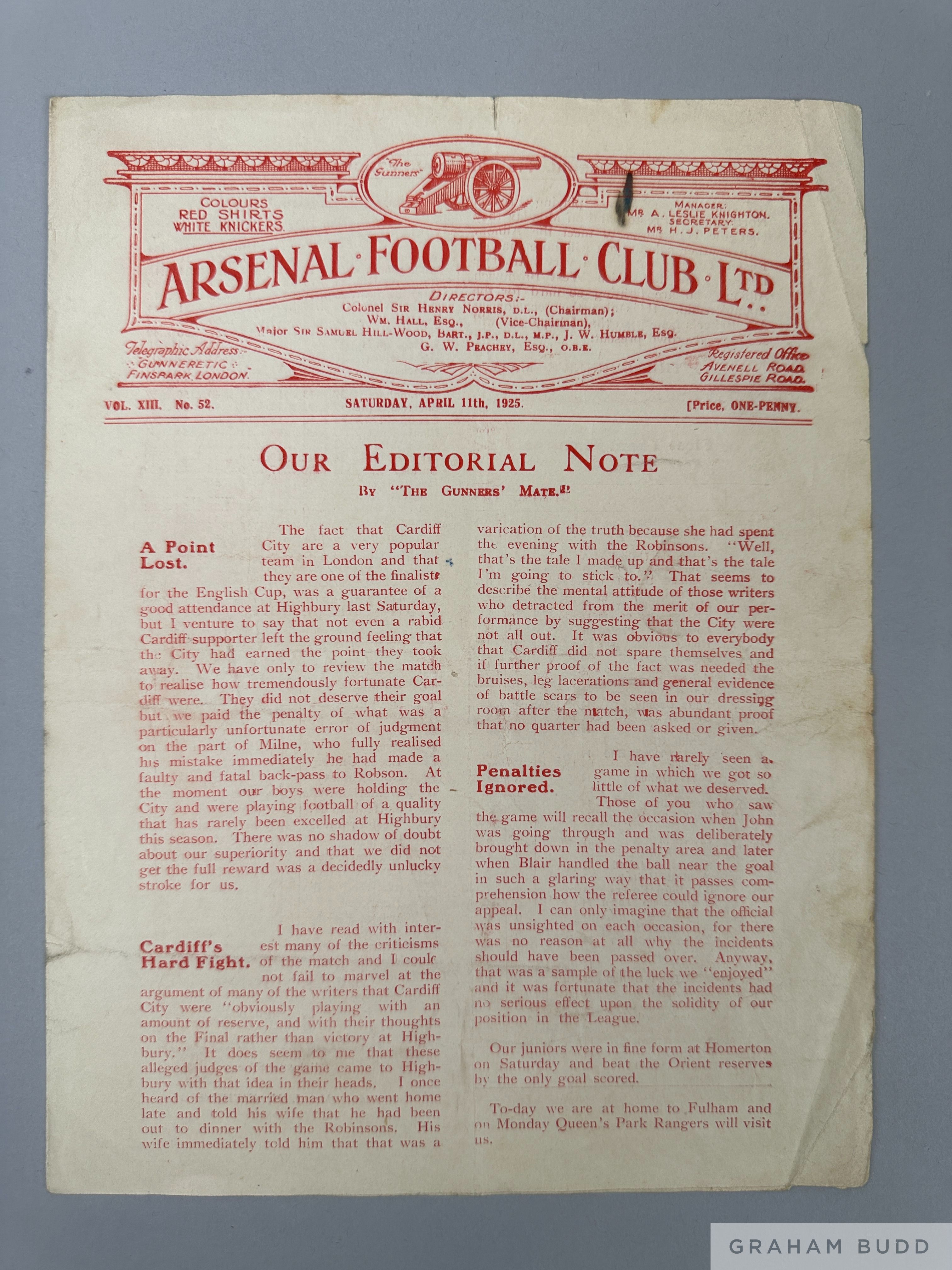 Arsenal v. Fulham reserve home match programme, 11th April 1925 large format, signs of folds