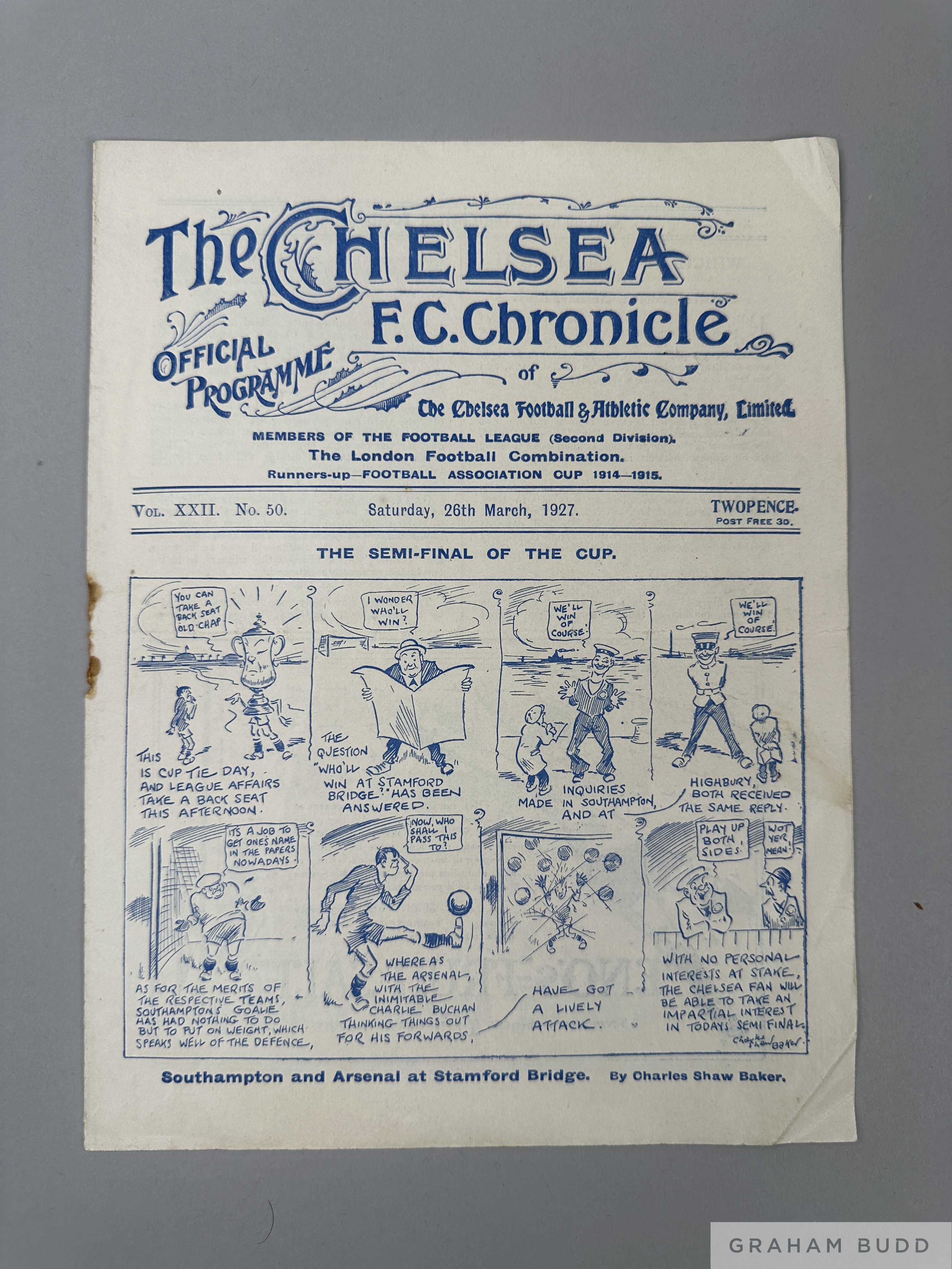 Southampton v. Arsenal, F.A. Cup Semi-Final match programme, 26th March 1927 match played at Stamford Bridge, signs of folds, lacking staple