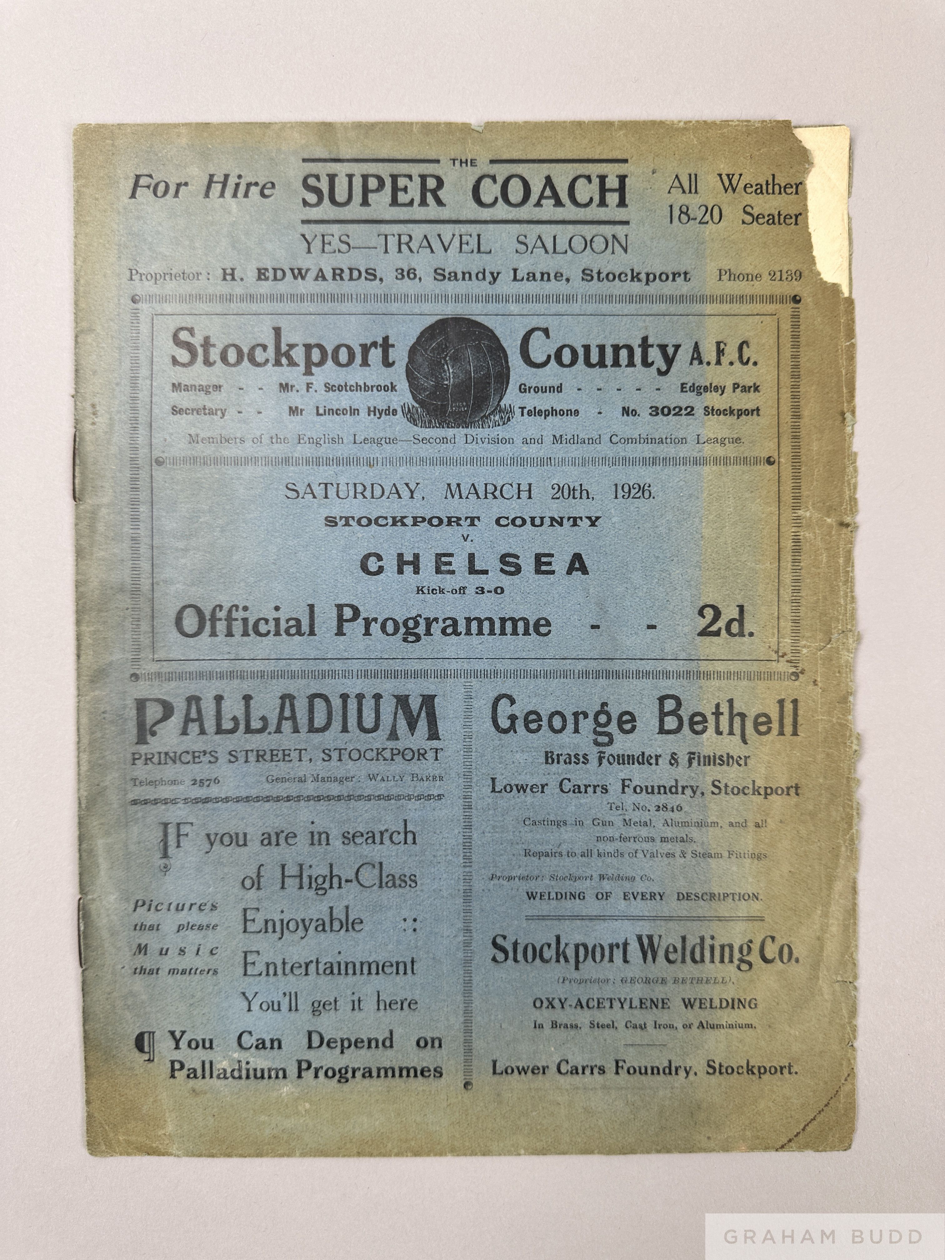 Rare Stockport County v Chelsea match programme, 20th March 1926 rusty staples, discolouration to covers, small section missing top right