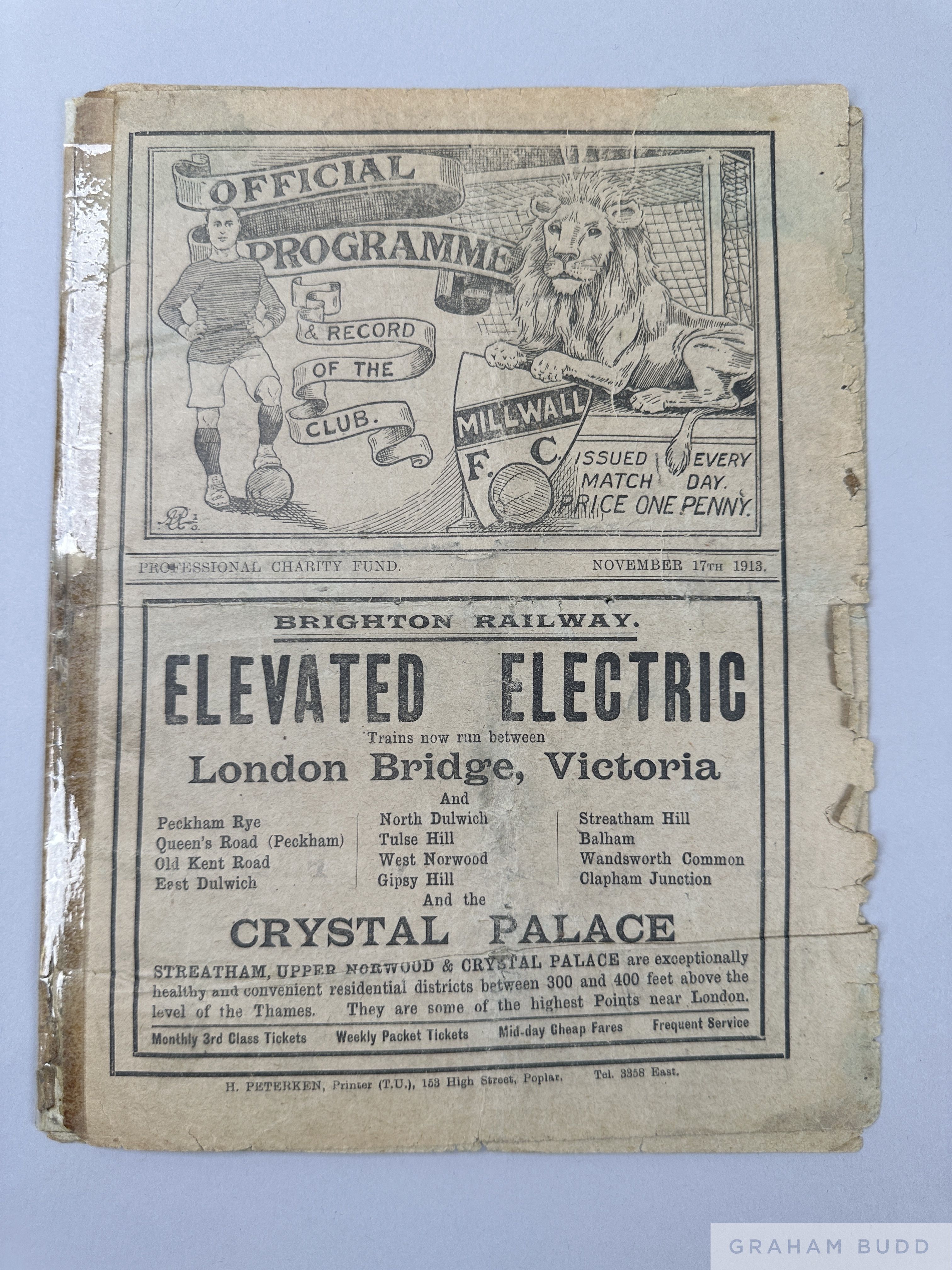 Millwall v. Chelsea Professional Charity Fund match programme, 17th November 1913 spine taped, signs of folds, edges rough, interior poor, section mi