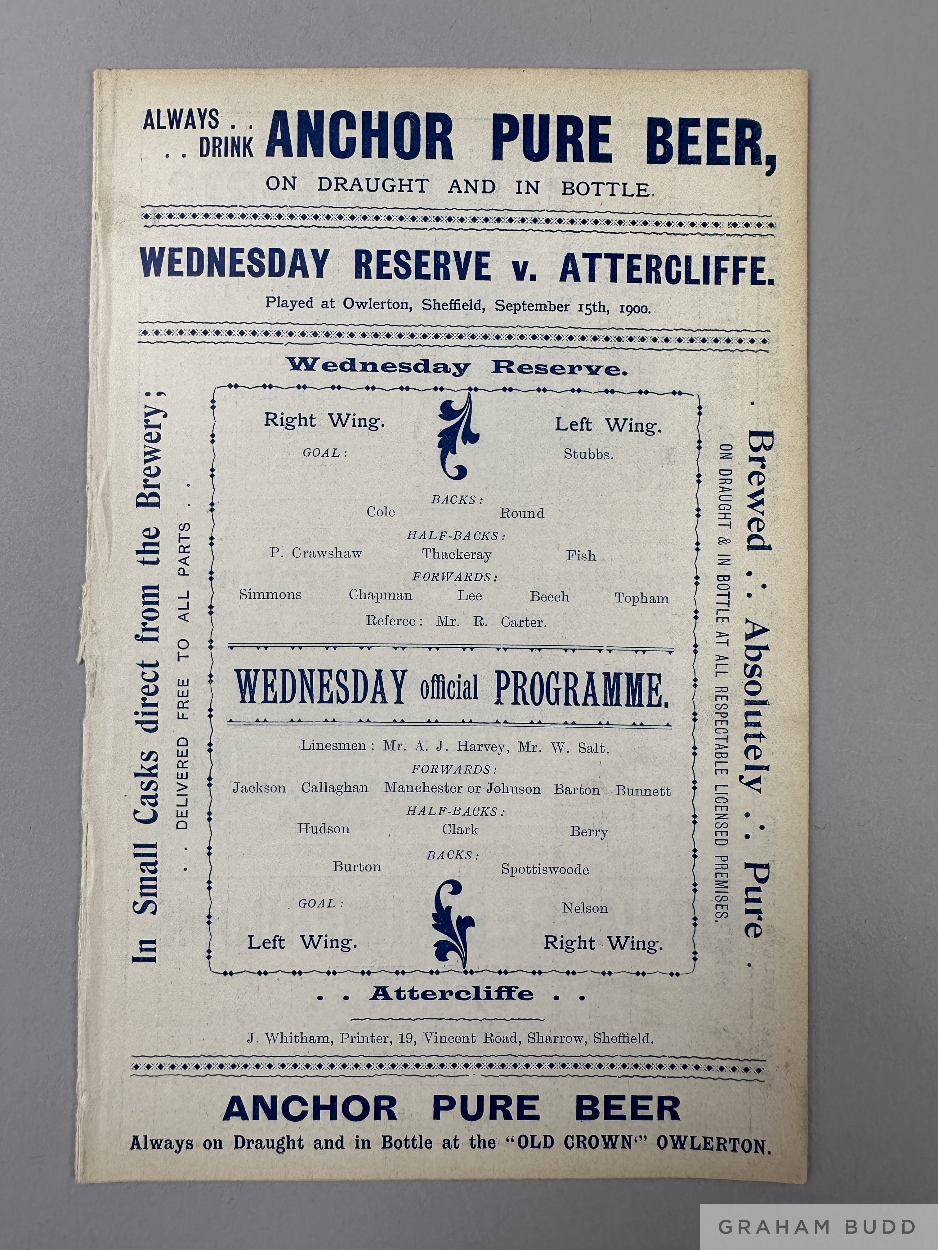 Sheffield Wednesday Reserves v. Attercliffe match programme, 15th September 1900 Ex bound volume