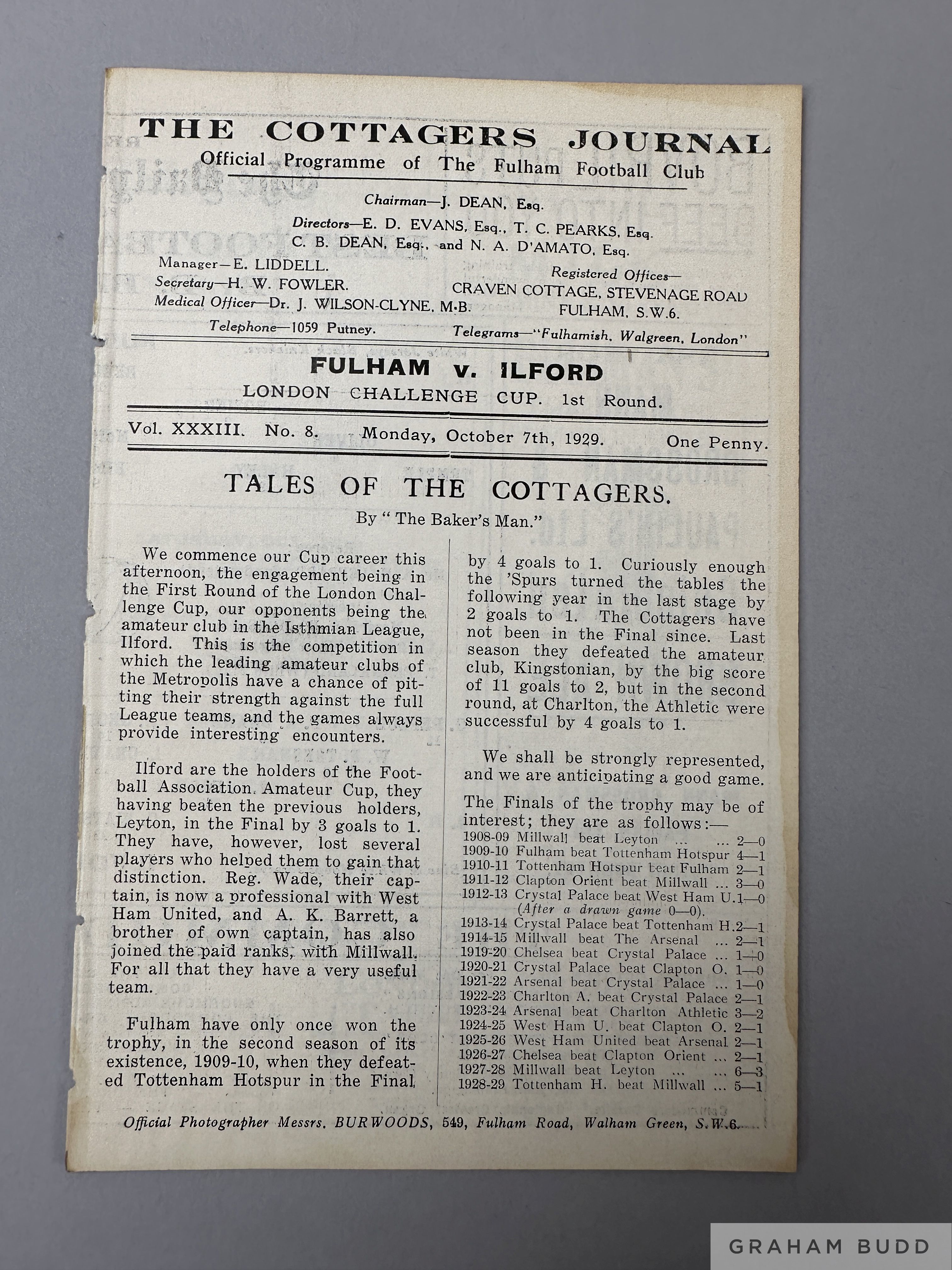 Fulham v. Ilford London Challenge Cup, 1st Round match programme, 7th October 1929 Ex bound volume
