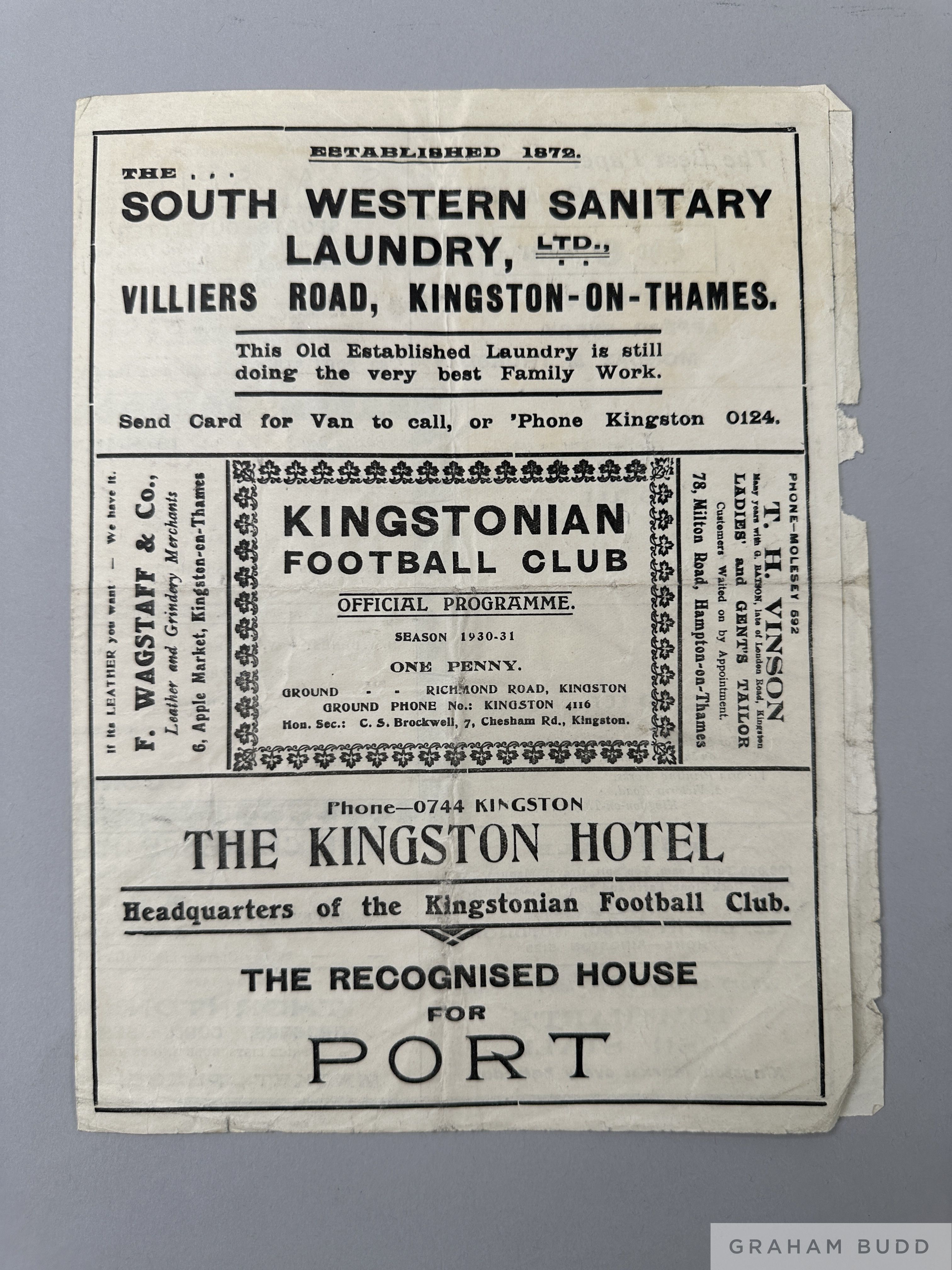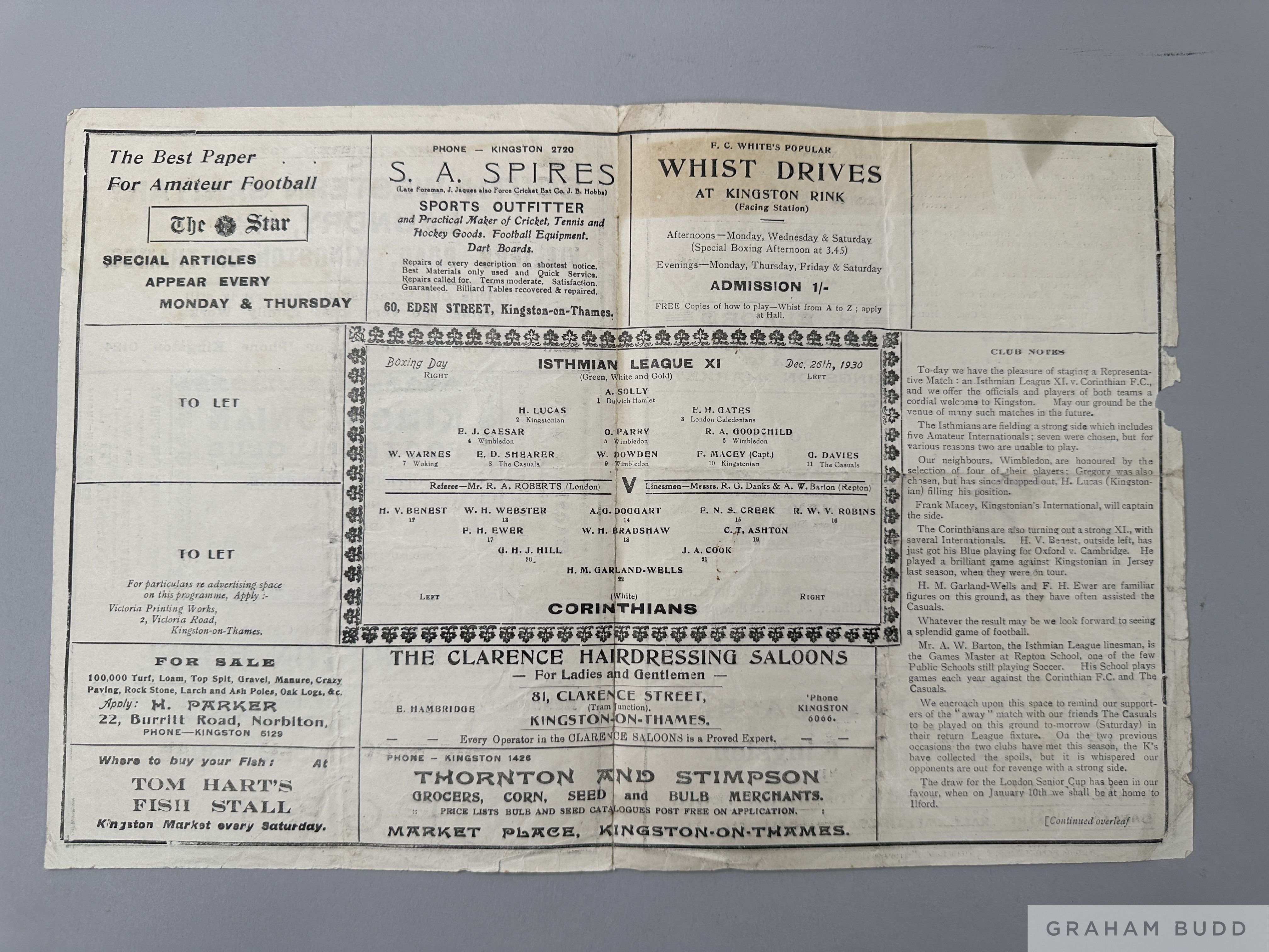 Isthmian League XI v. Corinthians match programme, 26th December 1930 played at Kingstonian Football Club Signs of folds