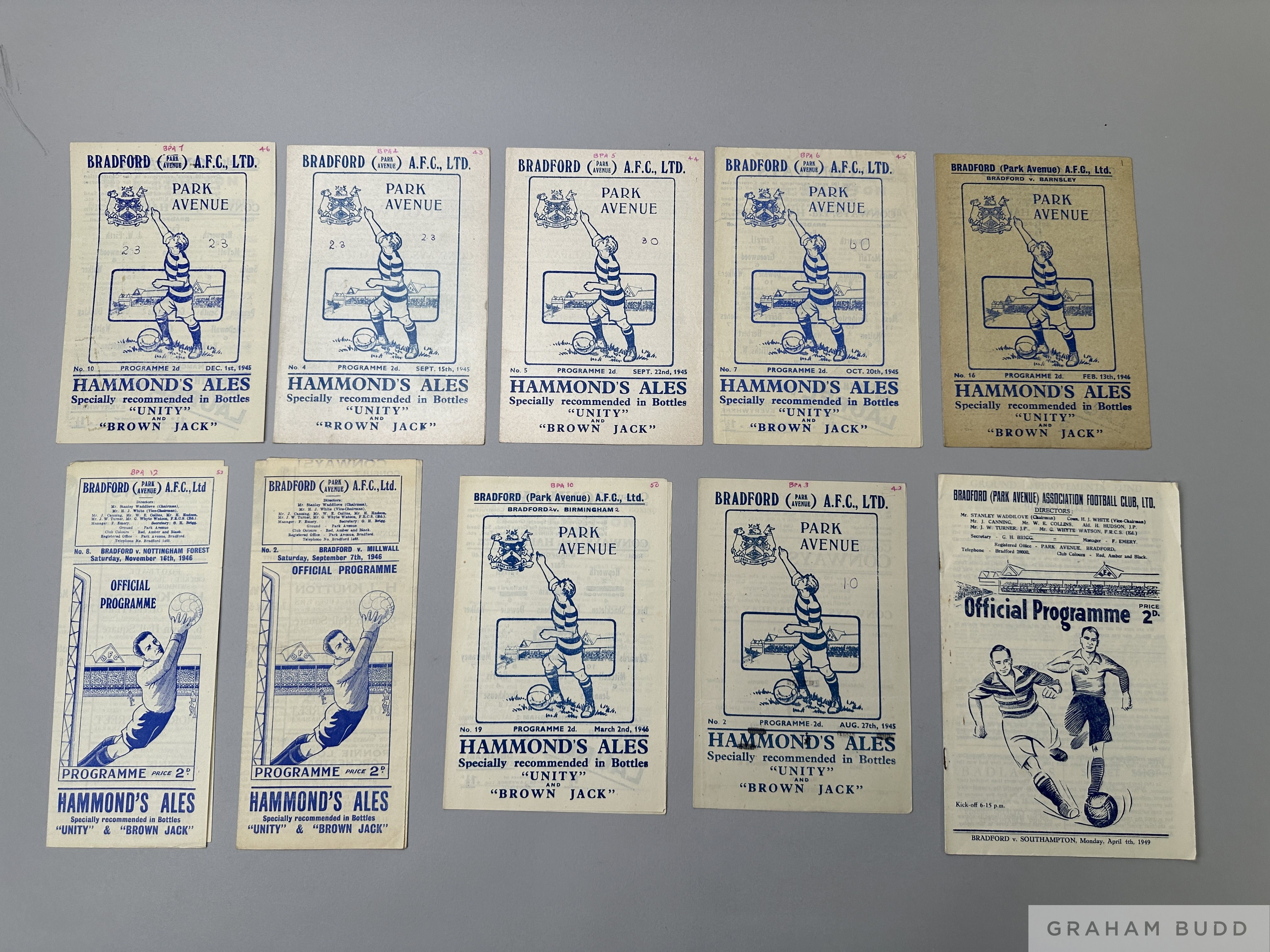 Bradford Park Avenue v. Manchester City, match programme, 1st December 1945 and nine Bradford Park Avenue home match programmes, including Chesterfield, 27th August 1945, Grimsby Town, 15th September 1945, Blackpool, 22nd September 1945, Bury, 20th October 1945, Barnsley, 13th February 1946, Birmingham, 2nd March 1946, Millwall, 7th September 1946, Nottingham Forest, 16th November 1946, Southampton 4th April 1949 (10) Majority with ink text on team pages and/or cover