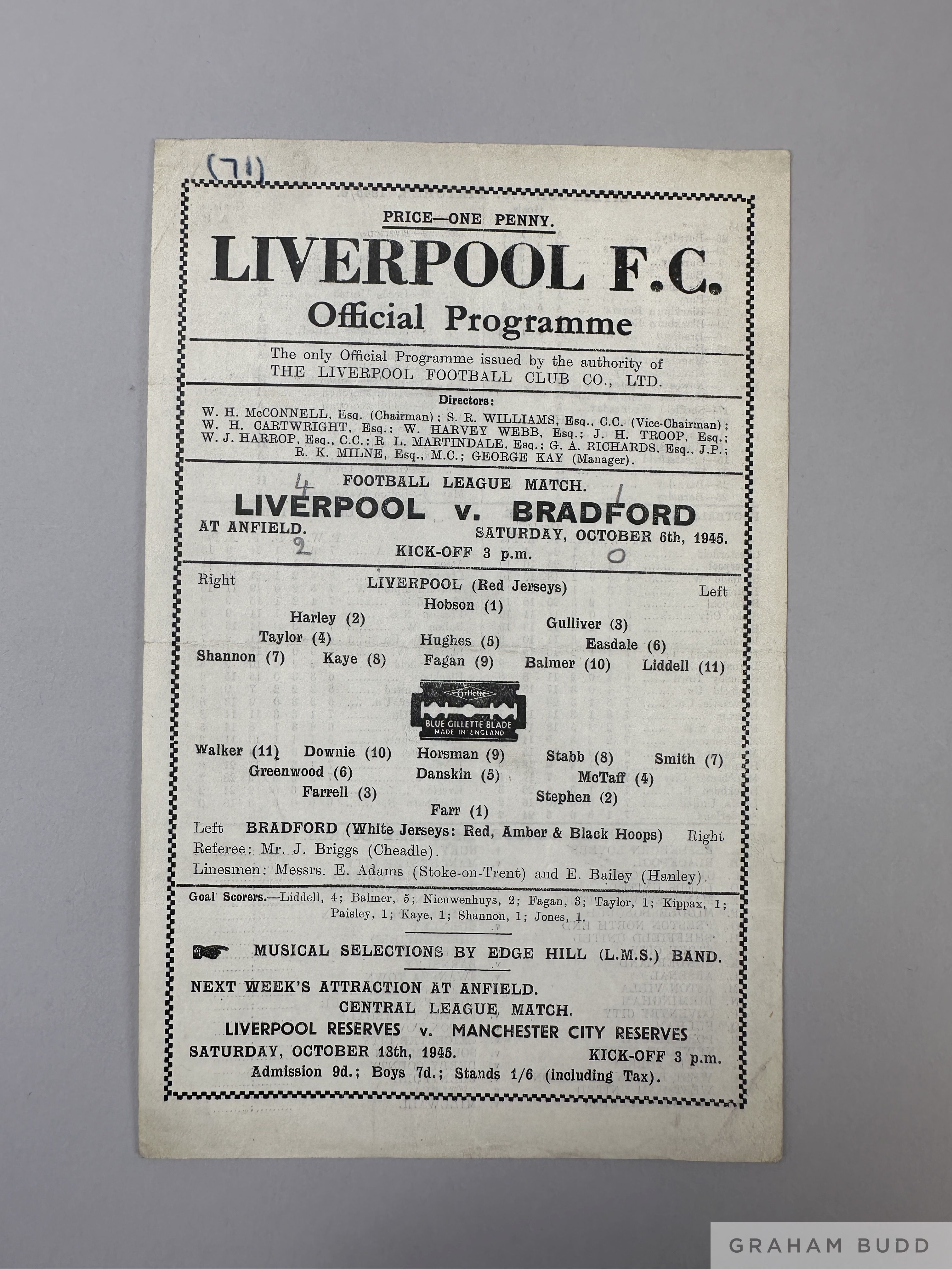 Liverpool v. Bradford Park Avenue single-sheet match programme, 6th October 1945 pencil scores
