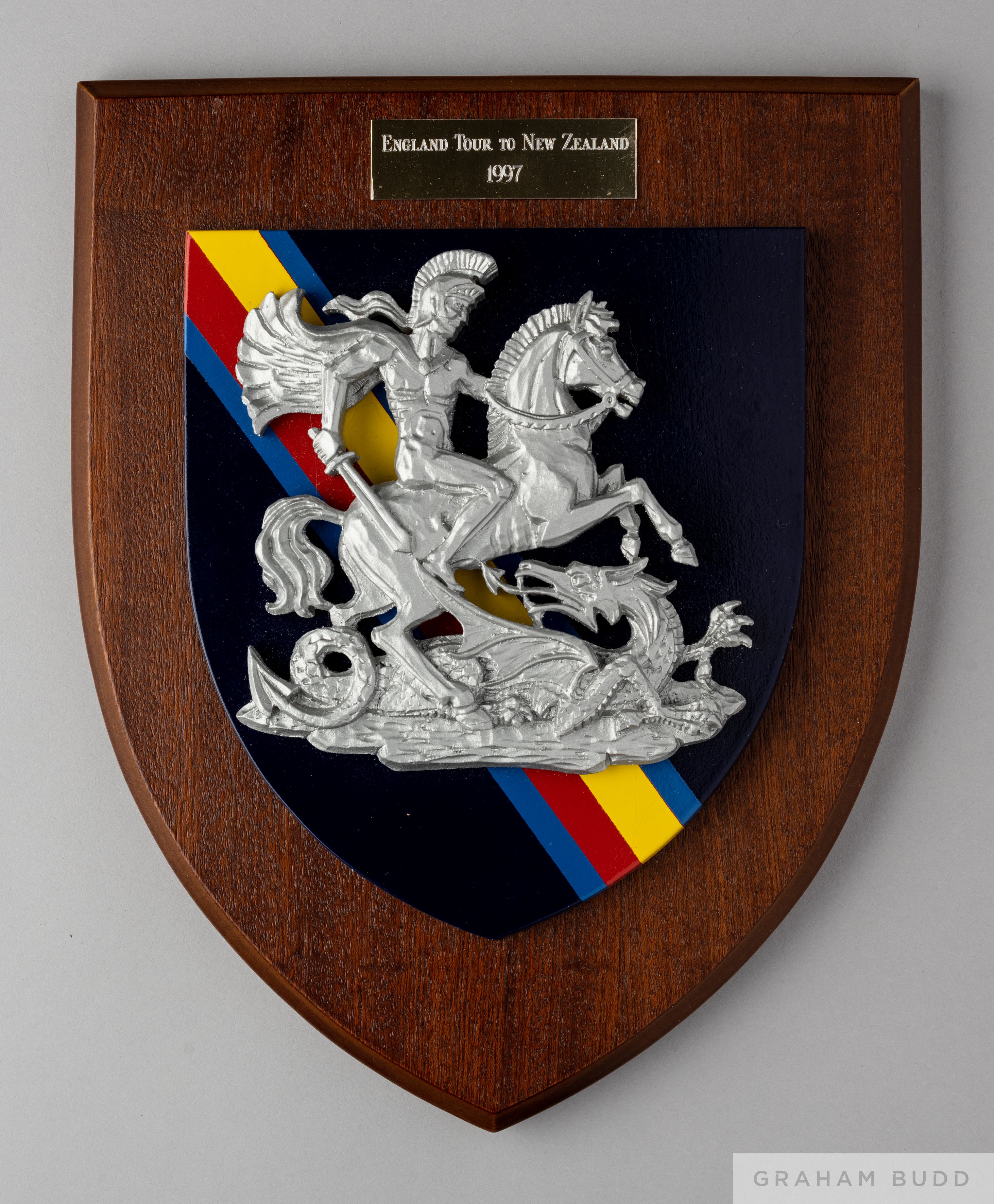 David Lloyd, England Tour to v. New Zealand plaque with brass plaque inscribed England Tour to New Zealand 1997 on hardwood shield-shaped plaque, 25c