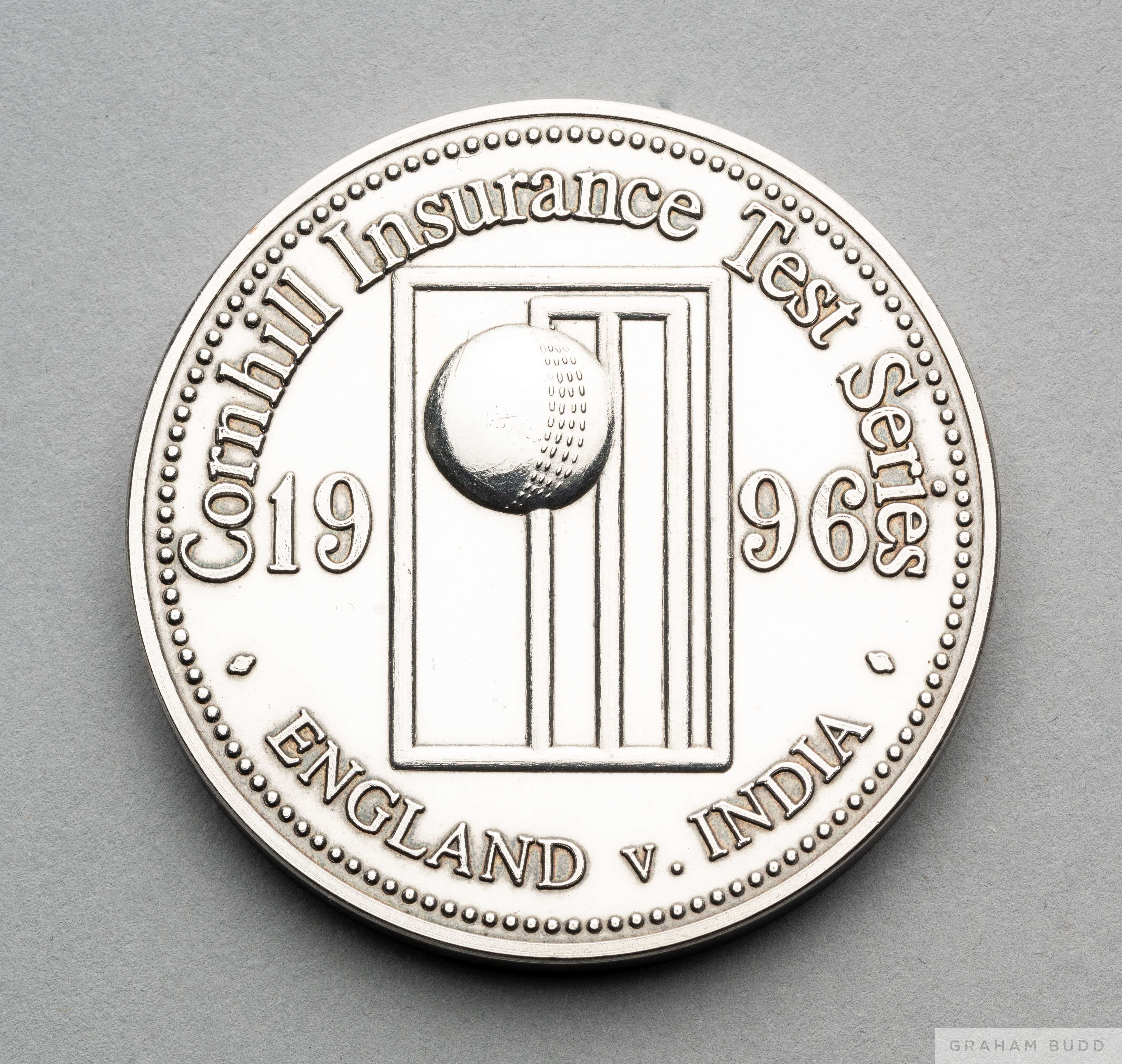 David Lloyd white-metal 1996 Cornhill Insurance Test Series medal the obverse inscribed Cornhill Insurance Test Series, 1996, ENGLAND V. INDIA, the r