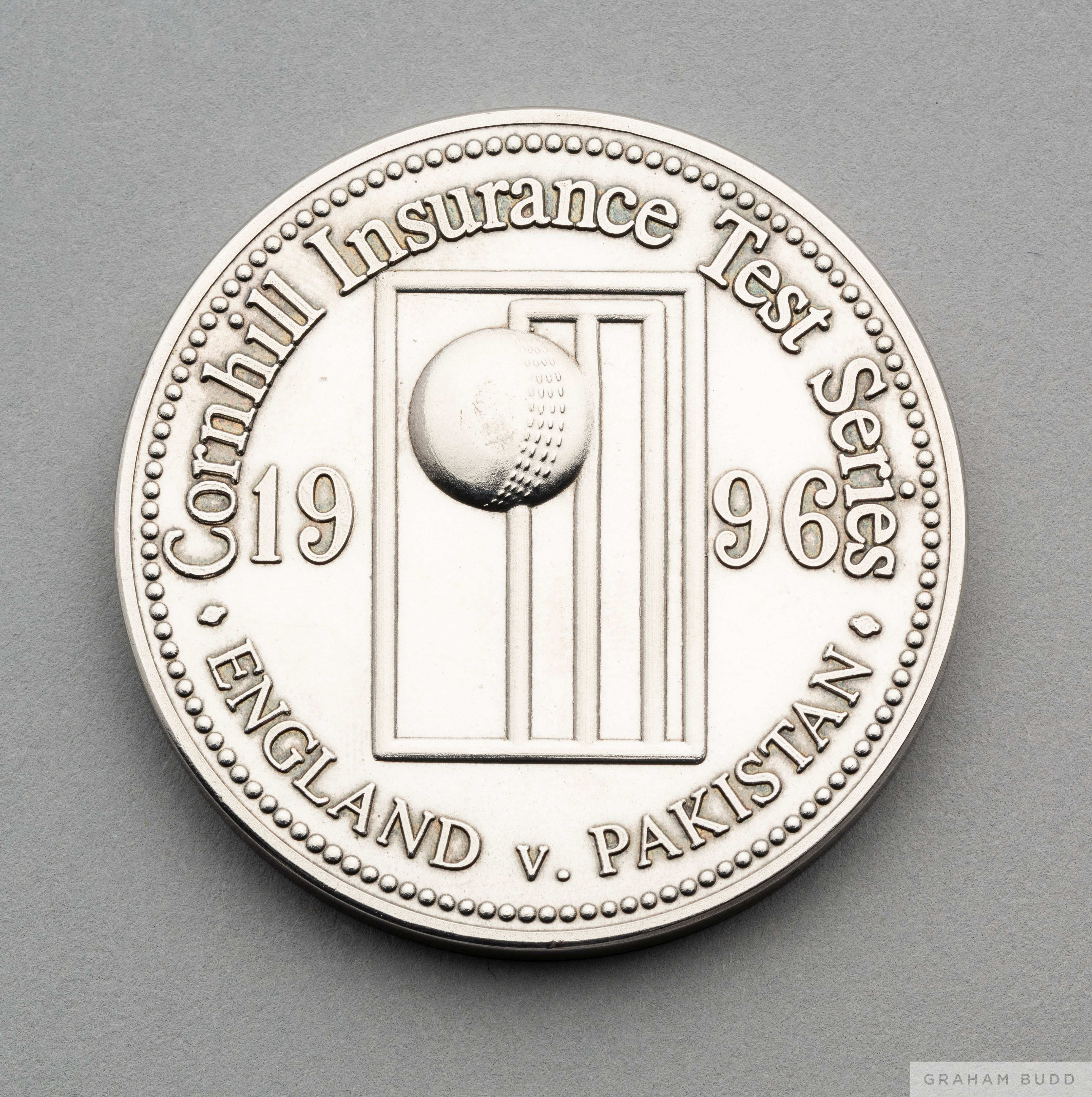 David Lloyd white-metal 1996 Cornhill Insurance Test Series medal the obverse inscribed Cornhill Insurance Test Series, 1996, ENGLAND V. PAKISTAN, th