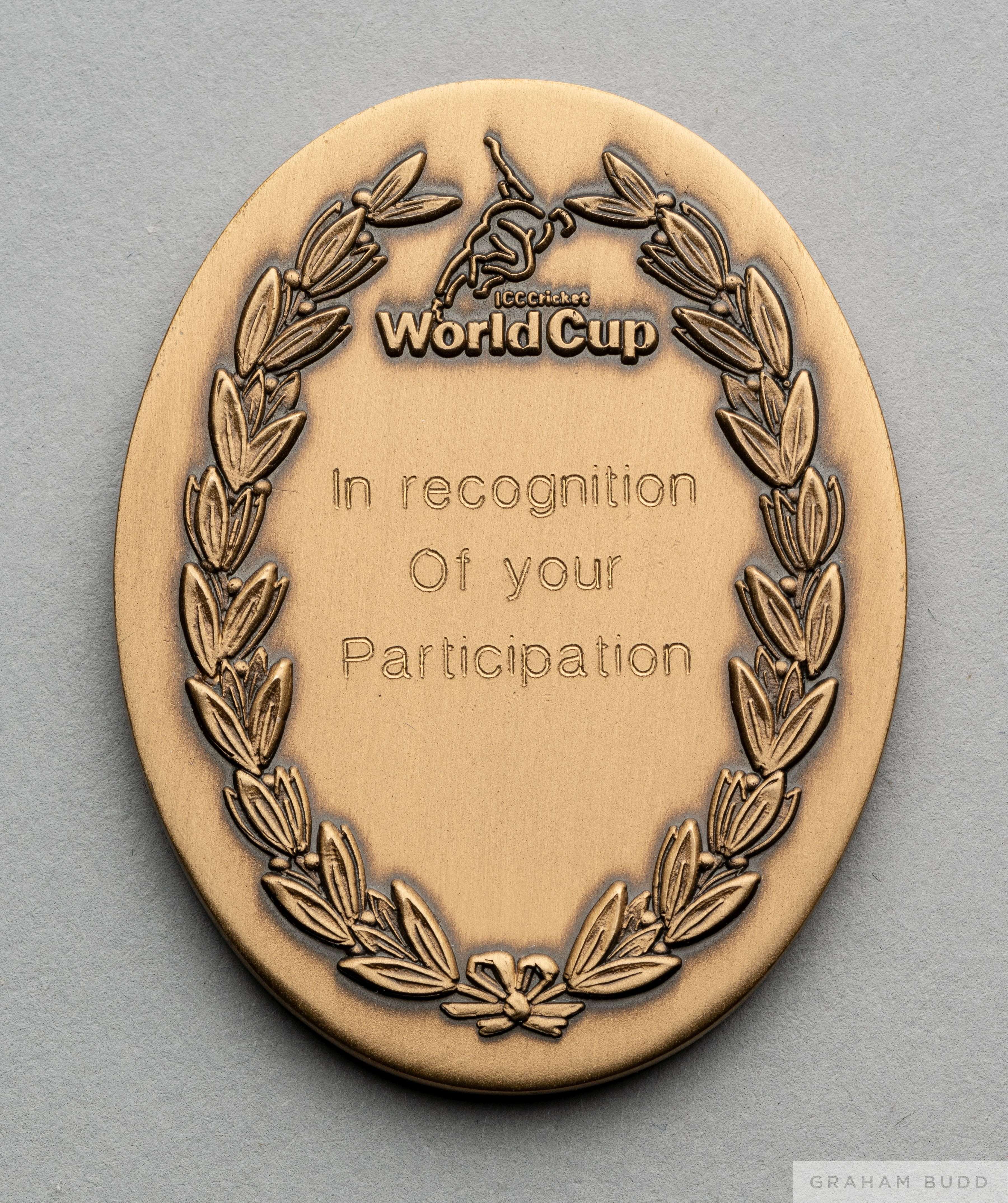 David Lloyd bronze 1999 Cricket World Cup medallion the obverse inscribed 1999 CRICKET WORLD CUP and listing the nations participating, the reverse inscribed World Cup, In recognition of your Participation The following Lots 187 to 221 relate to the cricket career of David "Bumble" Lloyd. See player bio at foot of description for Lot 187 Provenance: David Lloyd