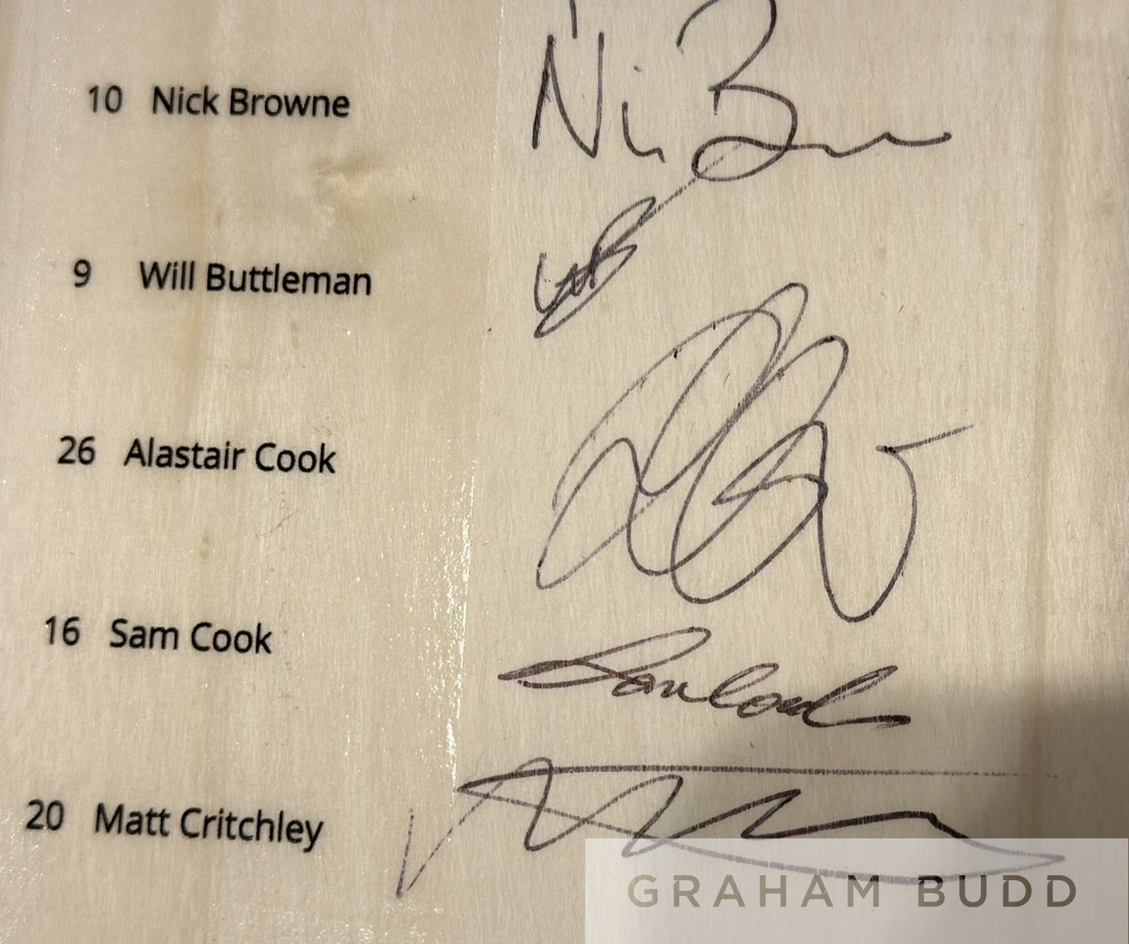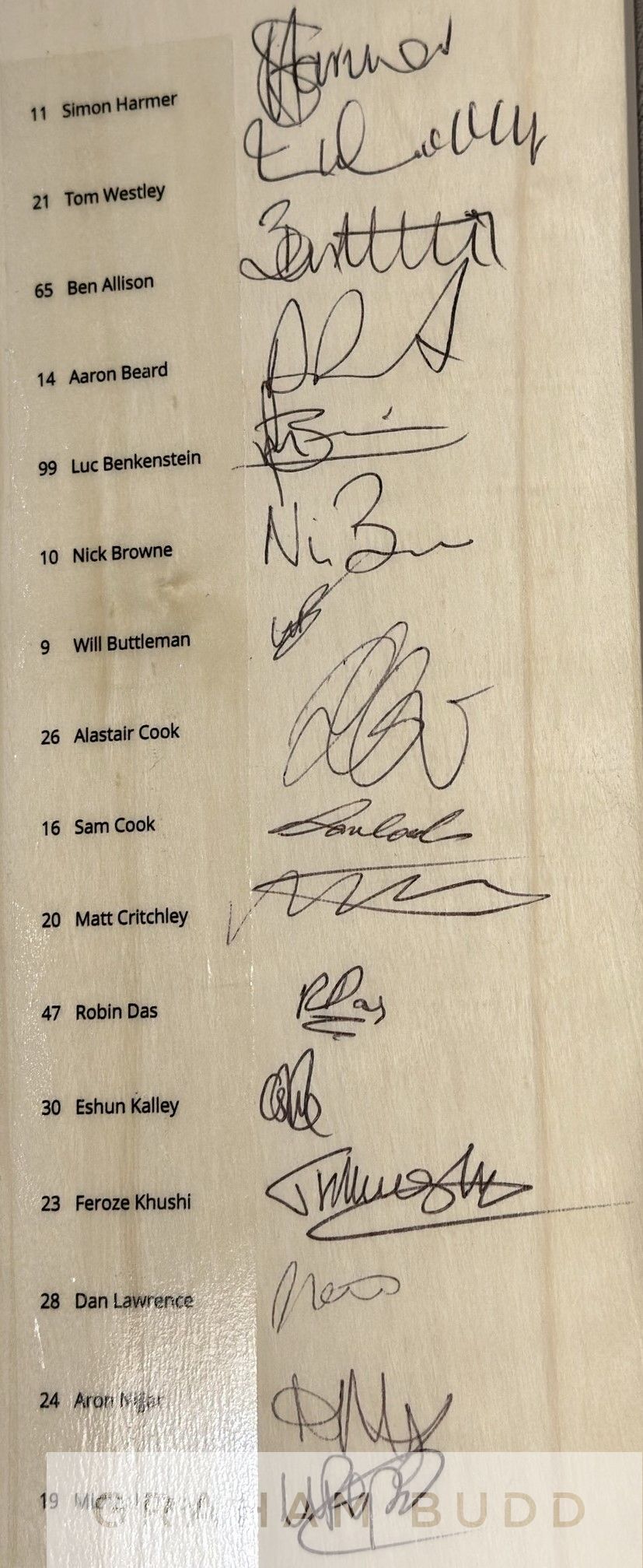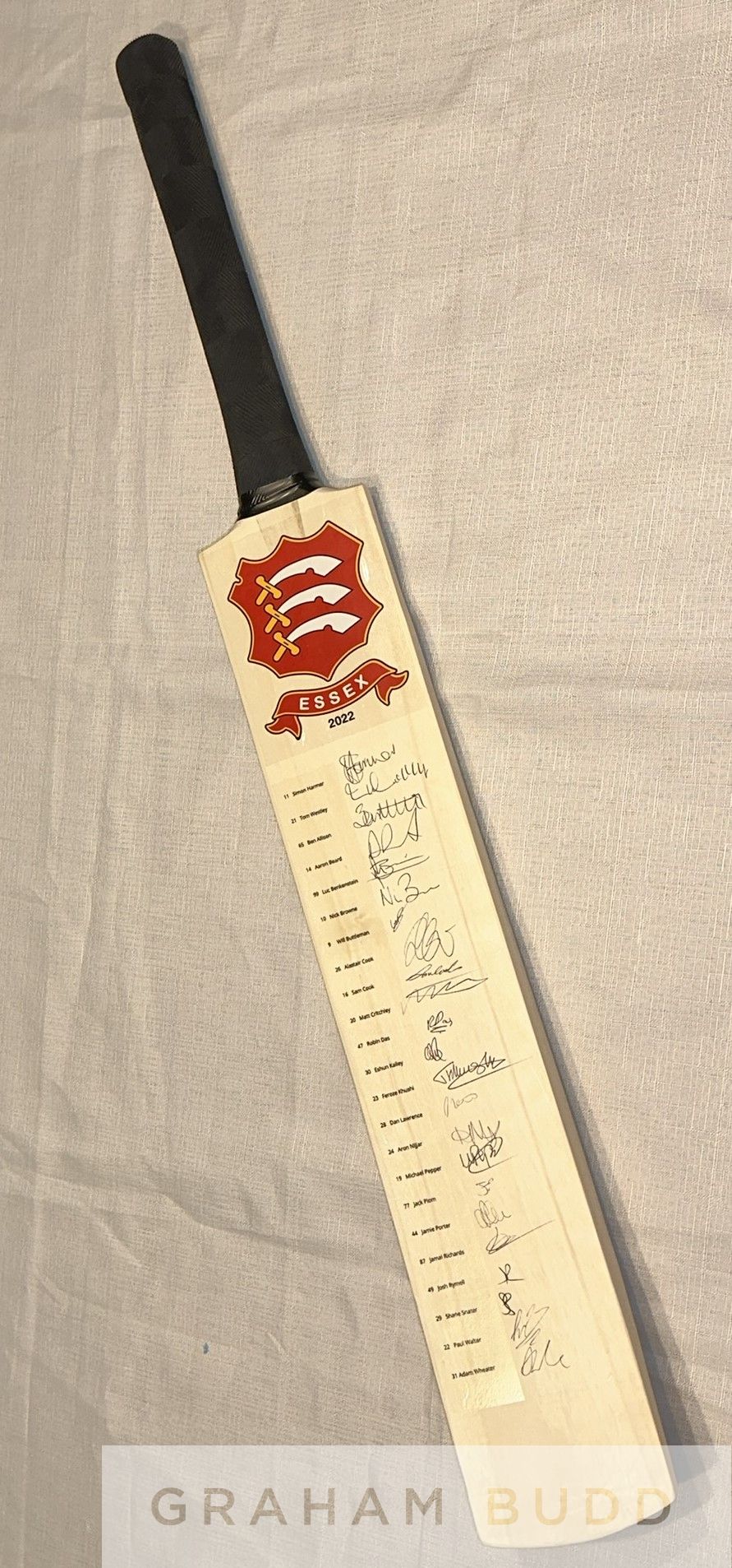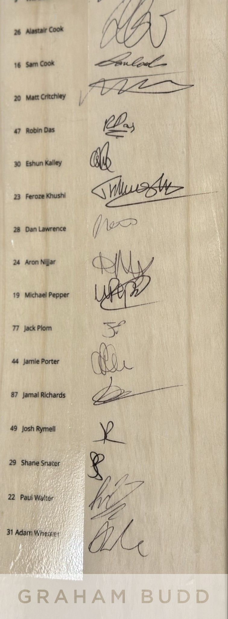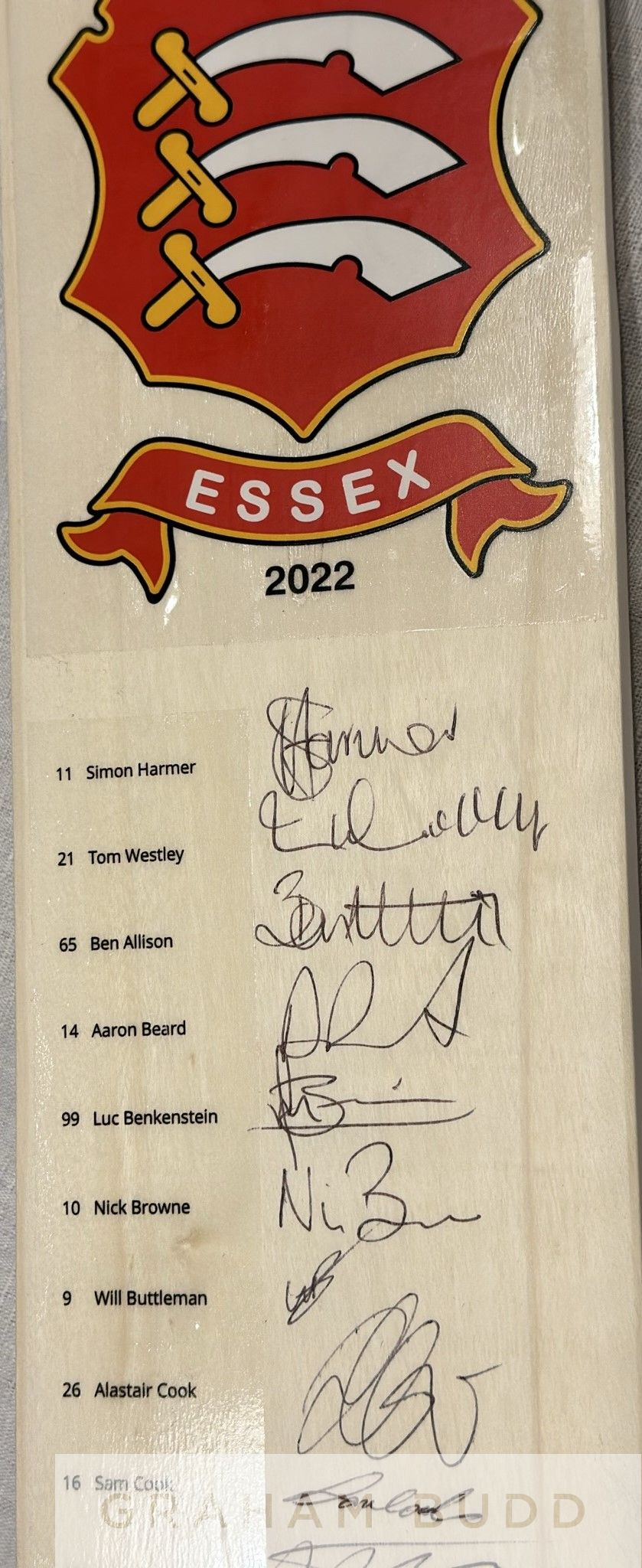 England: Essex County Cricket Club signed full size cricket bat, 2022 season team signed cricket bat, This cricket bat is official Essex CCC licensed product and has been signed by all members of the squad including former England test captain Sir Alastair Cook & current England ODI / T20 player Dan Lawrence. The list of Essex CCC players who have also signed the bat include (and player #) 11 Simon Harmer, 21 Tom Westley, 65 Ben Allison, 1 Aaron Beard, 99 Luc Benkenstein, 10 Nick Brown, 9 Will Buttleman, 26 Sir Alastair Cook, 16 Sam Cook, 20 Matt Crichley, 47 Robin Das, 30 Eshun Kalley, 23 Feroze Khushi, 28 Dan Lawrence, 24 Aaron Nijiar, 19 Michael Pepper, 77 Jack Plom, 44 Jamie Porter, 87 Jamal Richards, 49 Josh Rymell, 29 Shane Snater, 22 Paul Walter and 31 Adam Weater. Bat comes in official Surridge bat cover. Comes with Certificate of Authenticity and photograph proof of signing, (2)