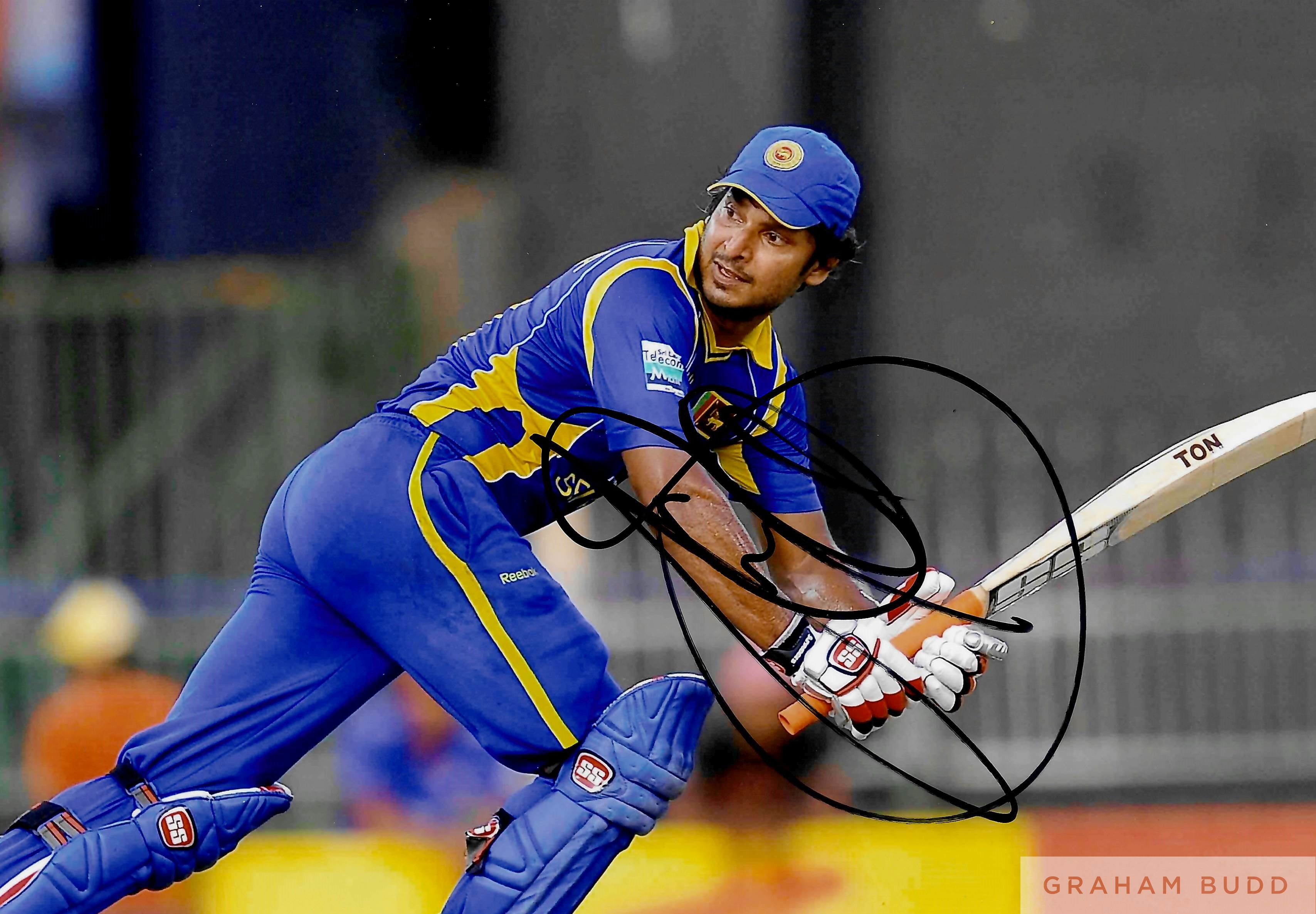 Sri Lanka: Kumar Sangakkara signed collection, Sri Lanka’s Greatest ever ODI and Test match cricketer, signed “SS Ton” mini bat, same brand as he used, signed with black sharpie; signed red 156g official leather cricket ball signed with black sharpie to middle of ball and signed 8 by 12in. action Sri Lankan ODI photograph, signed with black sharpie on middle of photograph. Comes with Certificate of Authenticity and photograph proof of signing, (4)