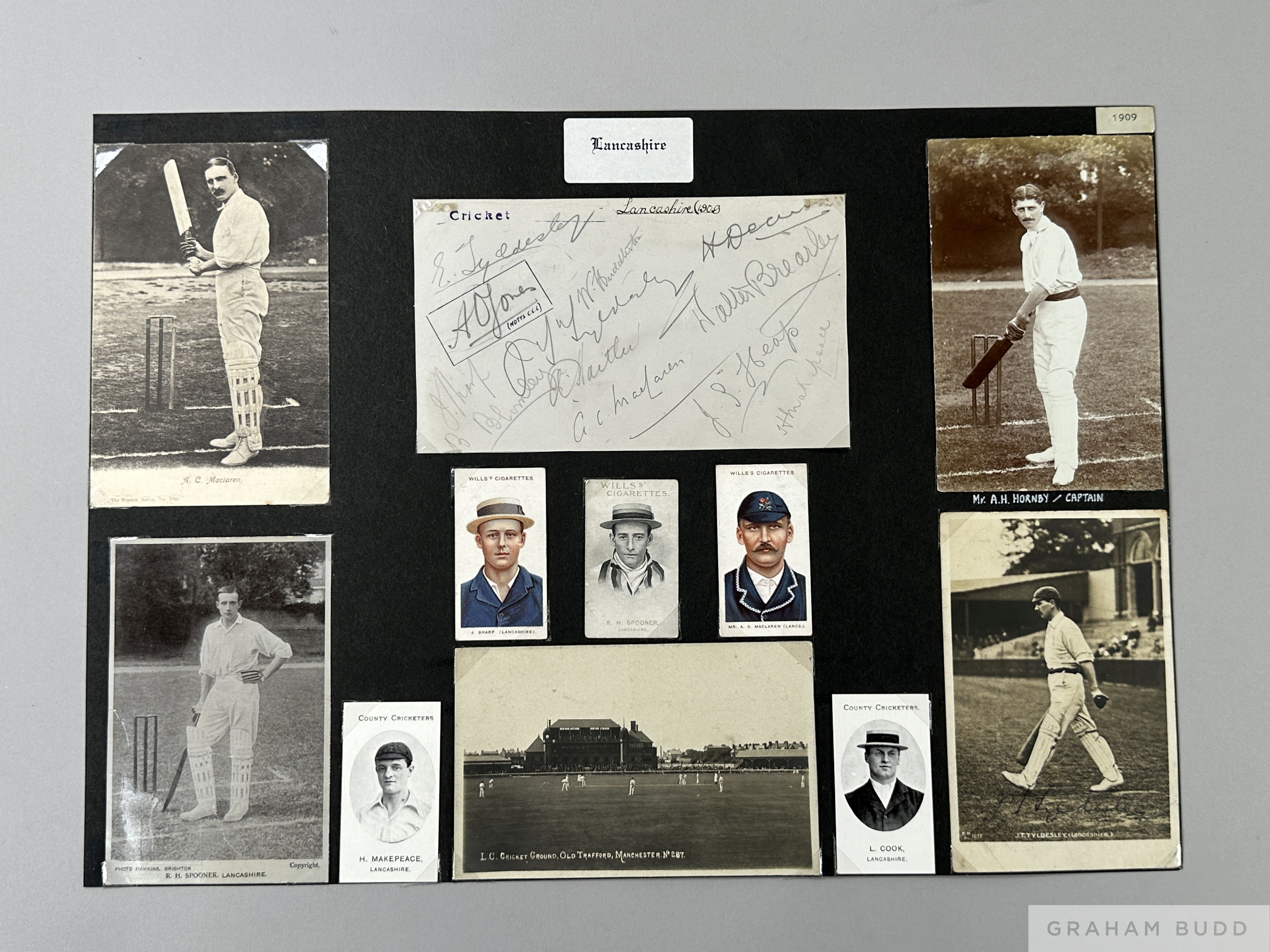 Cricket unique collage of Lancashire cricket Club, 1909, on black page 18 x 12in., included signed album page 11 players include Sharp, Makepeace, JT Tyldesley, MacLaren, etc., original sepia images of players included four post cards, one signed by JT Tyldesley post card, image of Old Trafford Cricket Ground and cigarette cards of period, nicely presented