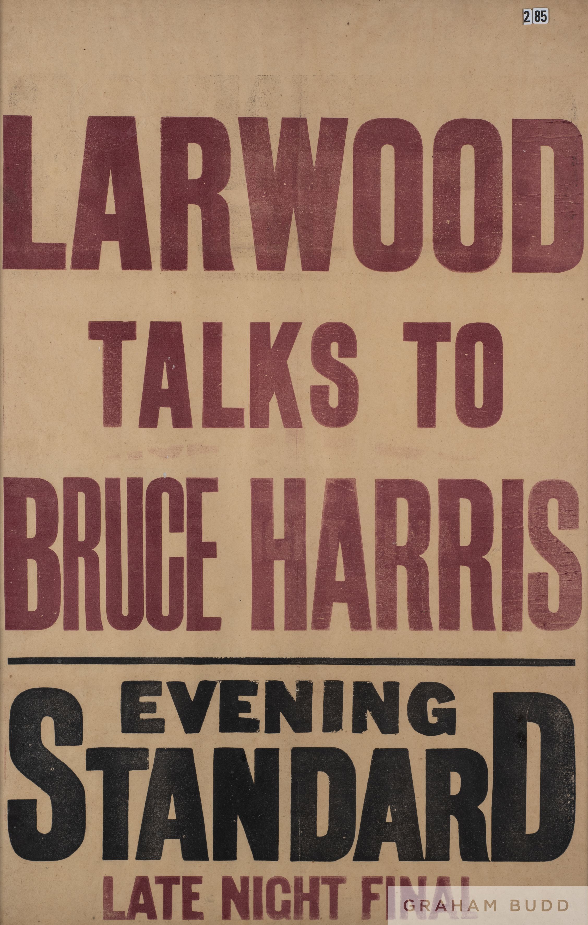 Larwood talks to Bruce Harris Evening Standard cricket poster, late night final, glazed and framed, 80 by 54cm. Poster bears wear and rippling, possible water damage on upper right side.
