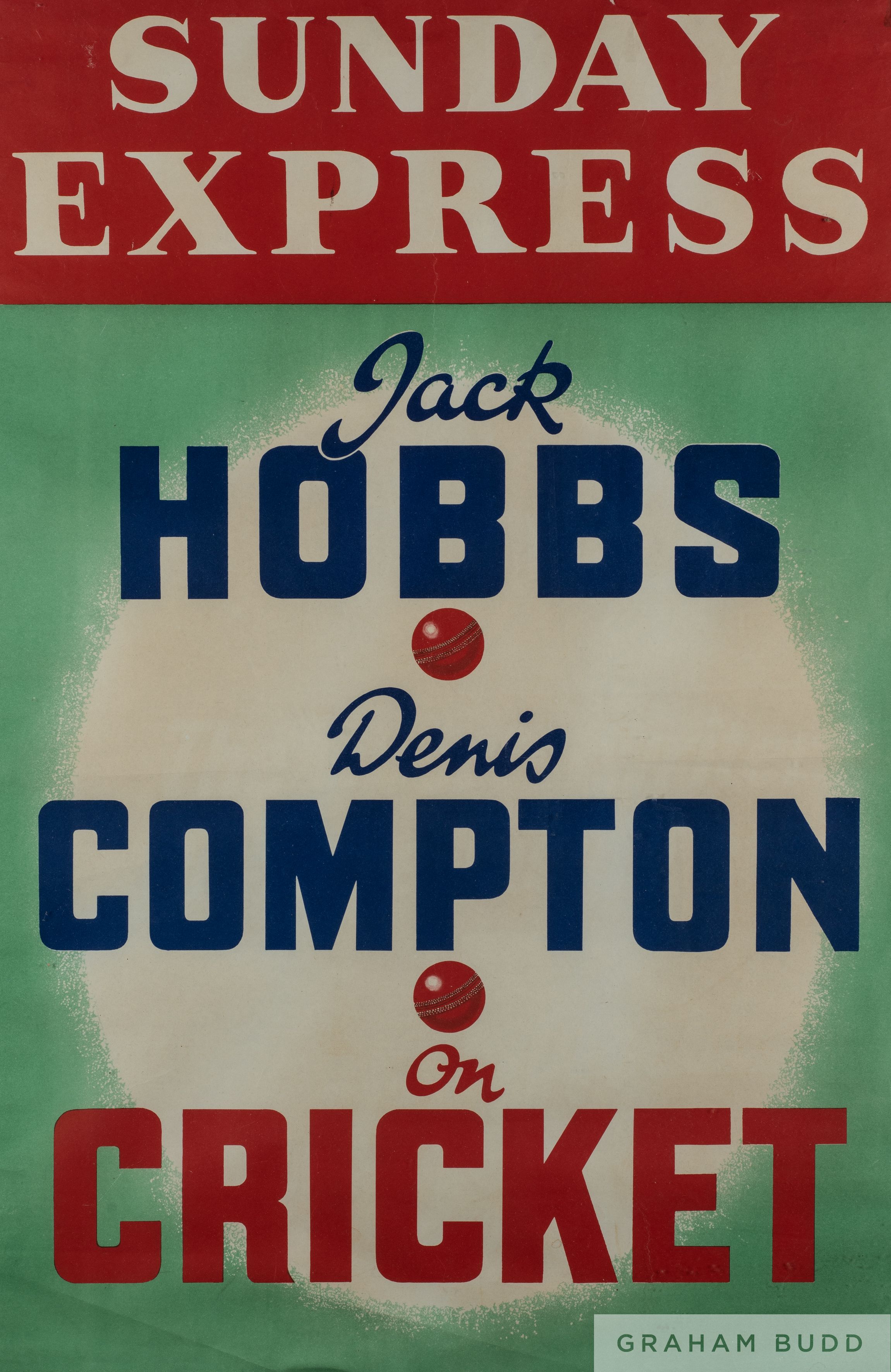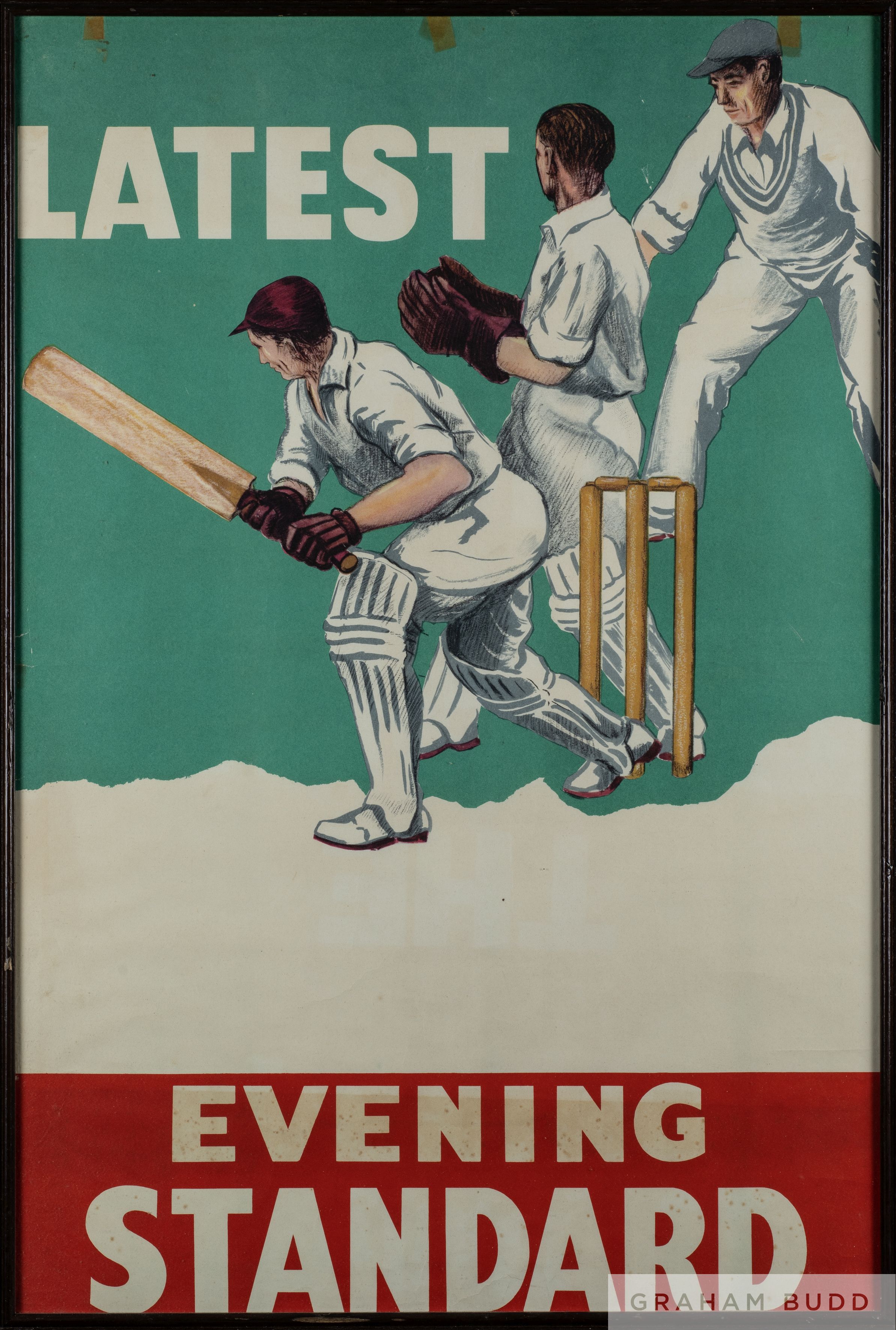 Two Cricket advertising posters, comprising Latest Evening Standard, featuring cricketers, glazed and framed, 79 by 55cm.; Jack Nobbs Denis Compton Sunday Express on Cricket poster, glazed and framed, 91 by 65cm. (2) Condition fair with foxing and signs of cellotape, folds and creases, crack to glass on second poster.