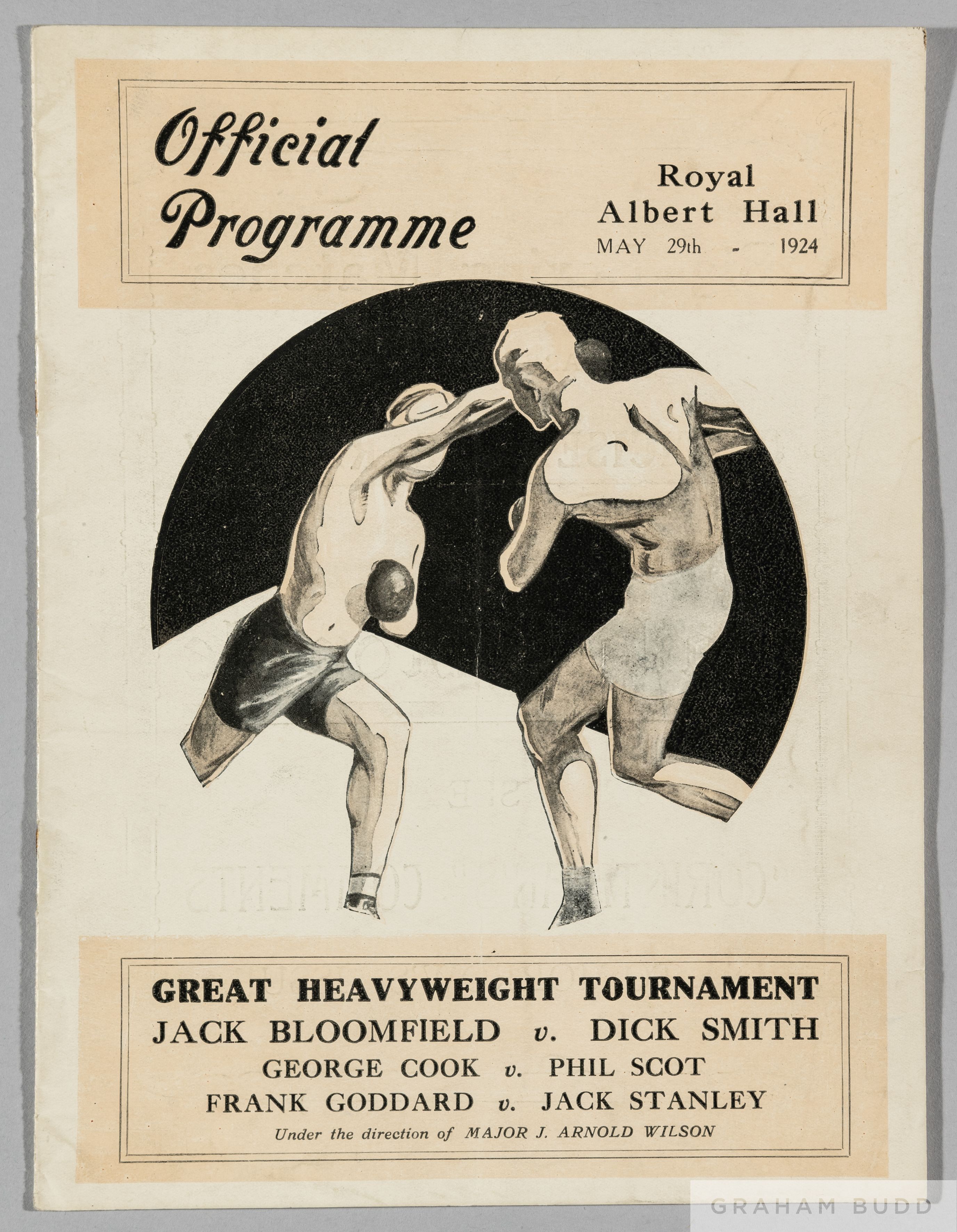 Jack Bloomfield v. Dick Smith Great Heavyweight Tournament boxing programme, also George Cook v. Phil Scot and Frank Goddard v. Jack Stanley, 29th May 1924 at the Royal Albert Hall Signs of fold, some cover staining