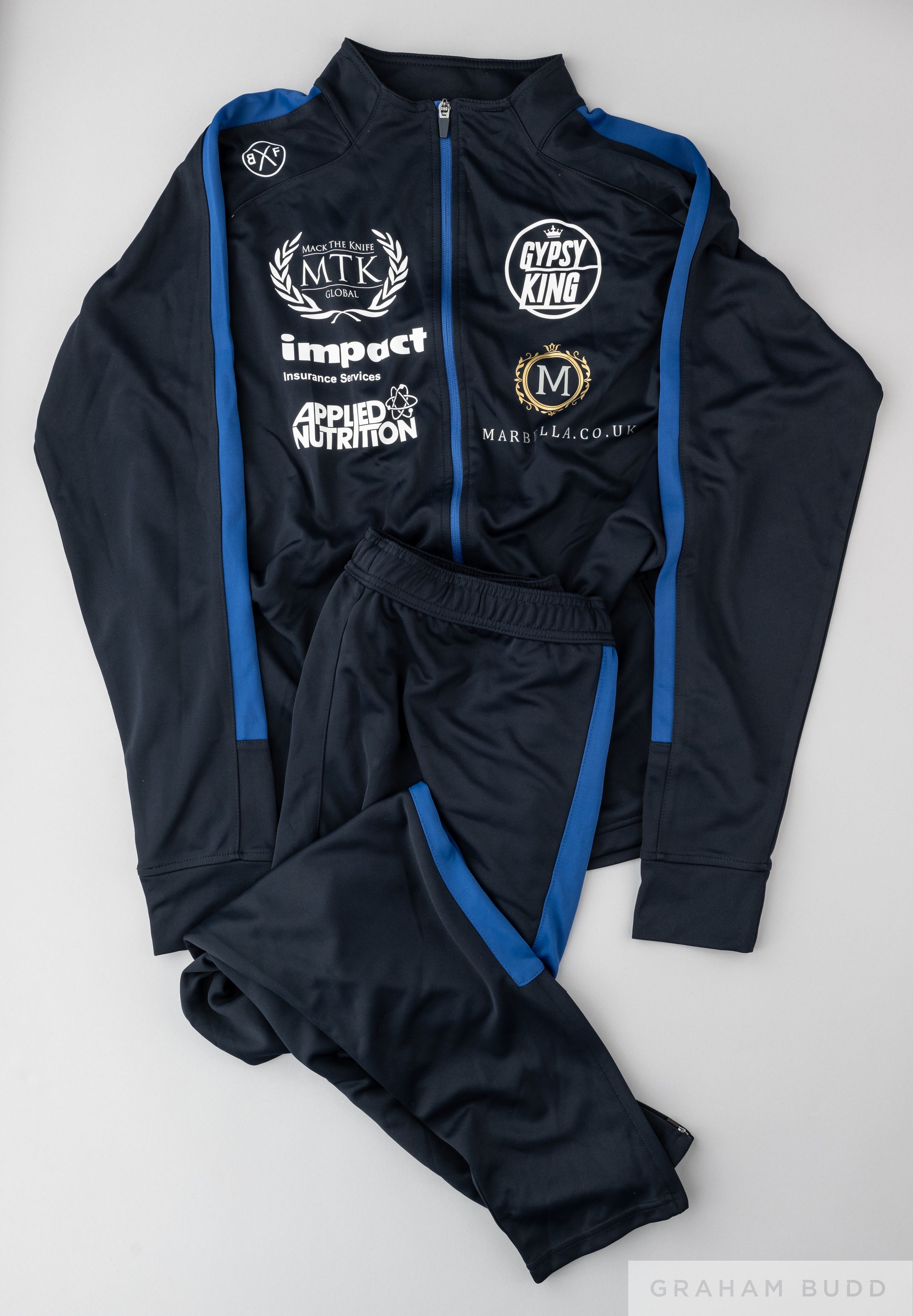 Tyson Fury navy & blue pre-fight tracksuit worn for the Deontay Wilder I fight held at Staples Center, Los Angeles,1st December 2018, Finden Hales two piece tracksuit comprising of a zipped jacket with two zipped pockets, bearing GYPSY KING, MARBELLA.CO.UK, APPLIED NUTRITION, IMPACT INSURANCE SERVICES, BXF, MACK THE KNIFE GLOBAL logos, reverse bearing TYSON FURY GYSPY KING, MARBELLA.CO.UK, WOVV HYDRATE, LUND GROUP, BXF logo's, no size label, the matching pants with two zipped pockets, no size label, unwashed, this tracksuit was not commercially available, (2) Undefeated defending WBC heavyweight champions Deontay Wilder faced undefeated challenger and former unified heavyweight champion Tyson Fury. This bout resulted in a draw by split decision. Provenance: Team Fury training squad.