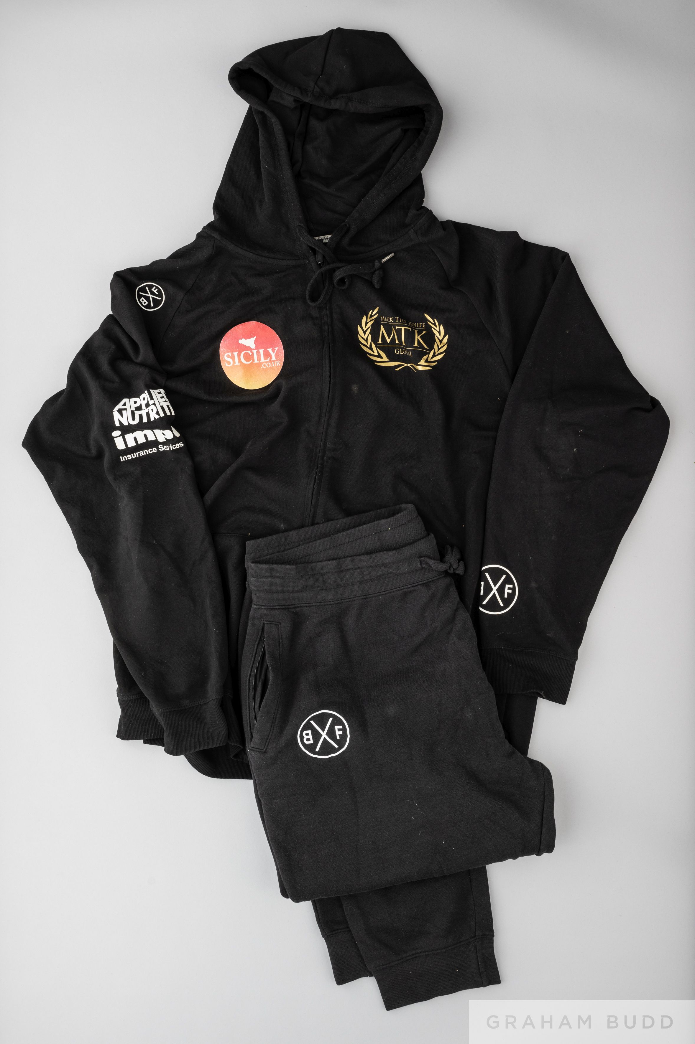 Tyson Fury black pre-fight tracksuit worn for the Deontay Wilder II fight held at MGM Grand Garden Arena, Paradise, Nevada, 22nd February 2020, Russell two piece tracksuit comprising of a hooded zipped jacket with two pockets, bearing SILICY.CO.UK, MACK THE KNIFE GLOBAL, BXF, APPLIED NUTRITION, IMPACT INSURANCE SERVICES logos on the front and sleeves, reverse bearing TYSON FURY GYPSY KING, LUND GROUP BXF logos, size XXXL, the matching pants with two pockets, bearing GYPSY KING, BXF logos, size XXXL, unwashed, this tracksuit was not commercially available, (2) This heavyweight rematch between undefeated and reigning WBC Champion Wilder and the undefeated former unified heavyweight champion Fury for the WBC and vacant The Ring heavyweight titles, resulted in Fury winning the bout in the seventh round on a technical knockout. Provenance: Team Fury training squad.