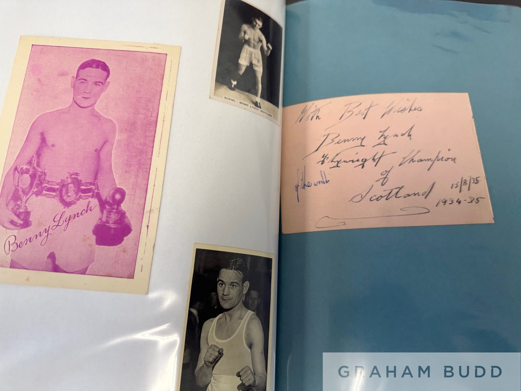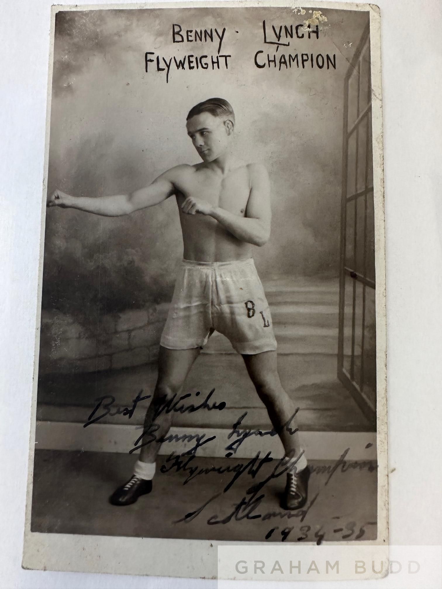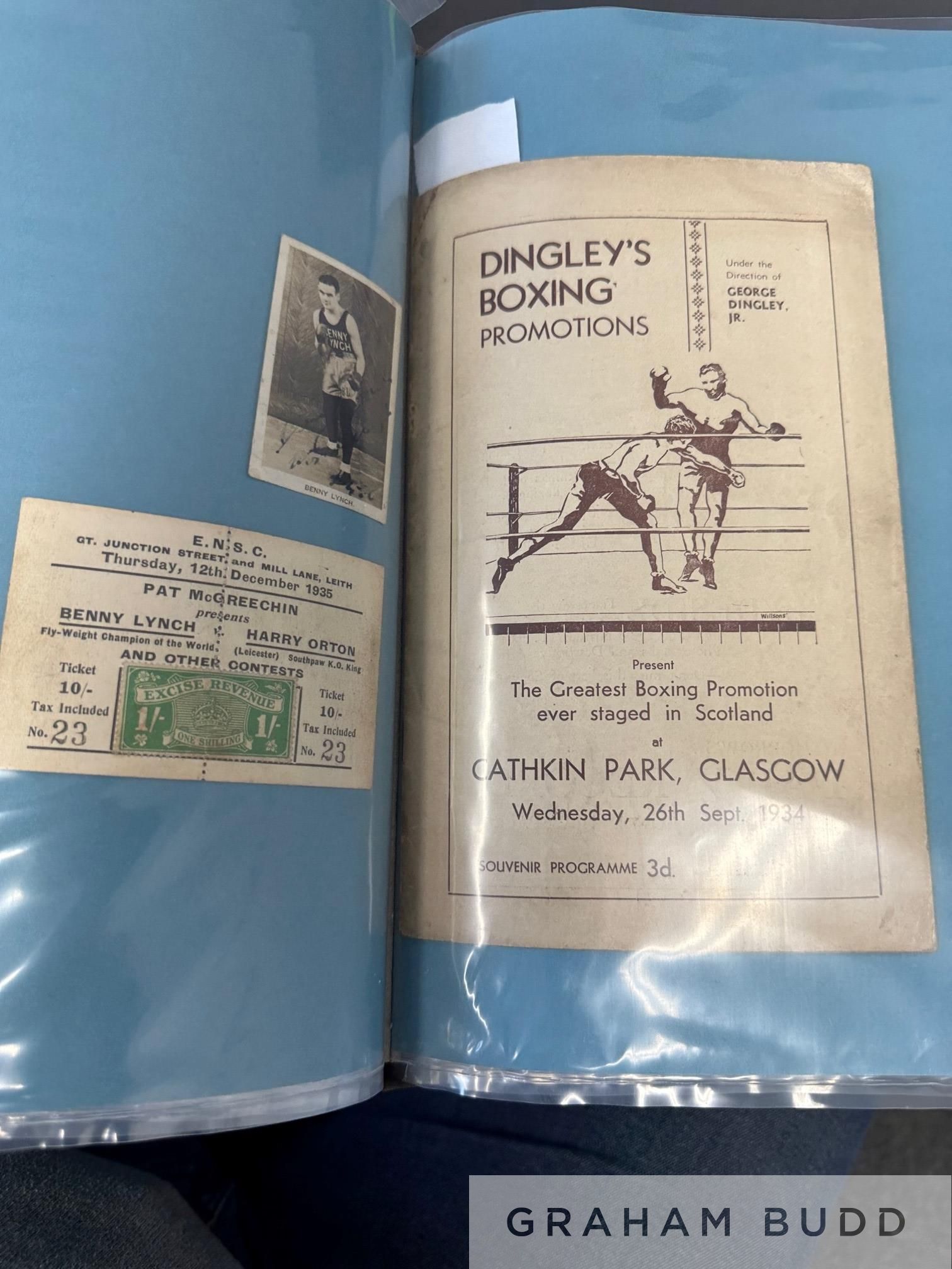 A rare and collector's Lifetime collection of Benny Lynch ephemera, comprising sixteen boxing programmes, six autographed photographs, five ticket stubs, mini fight poster and flyer Programmes: H.B. Promotion Boxing Programme, Benny Lynch v Willie Vogan,10th October 1933 at the Music Hall, George Street, Carlo Cavagnoli v. Benny Lynch, 21st March 1934 at the Kelvin Hall, Glasgow, Jimmy Campbell v. Benny Lynch, Flyweight Championship of Scotland, 16th May 1934 Evan Evans v. Benny Lynch, 29th May at the City Hall, Valentin Angelmann v. Benny Lynch, Virtually an Eliminating Contest for the Fly-Weight Championship of the World, 26th September 1934 at Cathkin Park, Glasgow Benny Lynch v. Jimmy Warnock, 11th March 1936 at King's Hall, Balmoral, Northern Ireland Benny Lynch v. Pat Warburton, 28th May 1936 at The Stadium Club Benny Lynch v. Phil Milligan, 16th November 1936 at Kings Hall Benny Lynch v. Small Montana, Fly-Weight Championship of the World, 19th January 1937, flyer and ticket stub at Empire Pool & Sports Arena, this fight saw Lynch defeat Montana and thus unified the World Fly-weight Championship Benny Lynch v. Nipper (Len) Hampston, 1st March 1937 at Kings Hall Benny Lynch v. Len Hampston, 22nd March 1937 at Leeds Town Hall Benny Lynch v. Roy Underwood, Flyweight Championship of Great Britain, Europe & the World, 13th October 1937 at Shawfield Park Benny Lynch v. Georges Bataille at The Granby Halls, Leicester, 13th December Benny Lynch v. Peter Kane, 24th March 1938 at Liverpool Football Ground Benny Lynch v. Kayo Morgan, International Bantam-Weight, 27th September 1938 at Shawfield Stadium Benny Lynch v. Aurel Toma, 3rd October 1938 at Empress Stadium, Earl's Court, programmes include multiple bouts taken place on same evening, ticket stubs other than mentioned above Benny Lynch v. Harry Orton, 12th December 1935, Benny Lynch v. Peter Kane, 13th October, Benny Lynch v. Jackie Jurich, 15th June 1938 and a copy of The Ring Magazine with Benny Lynch on the cover, 1937 etc, (2 green folders)