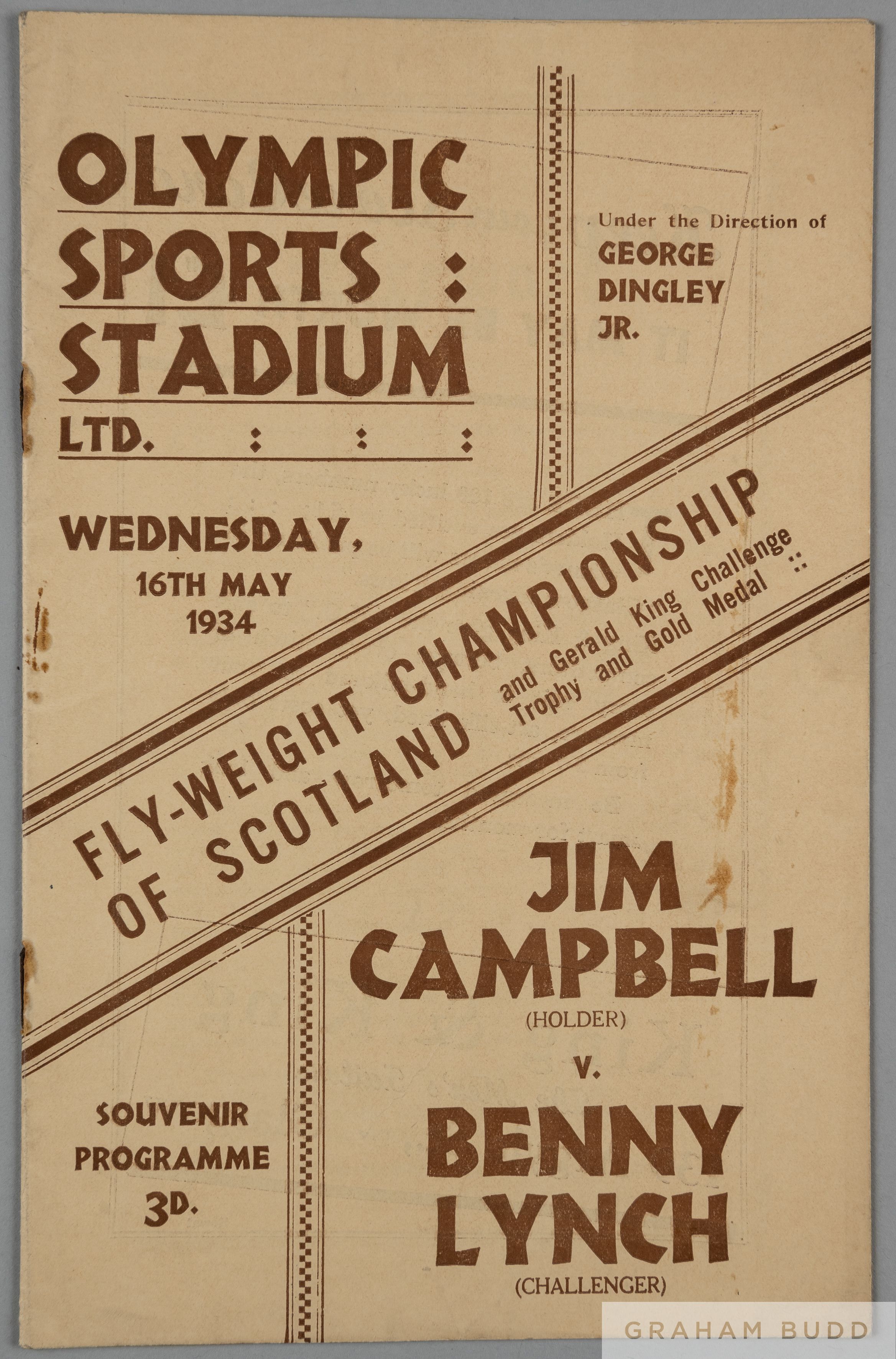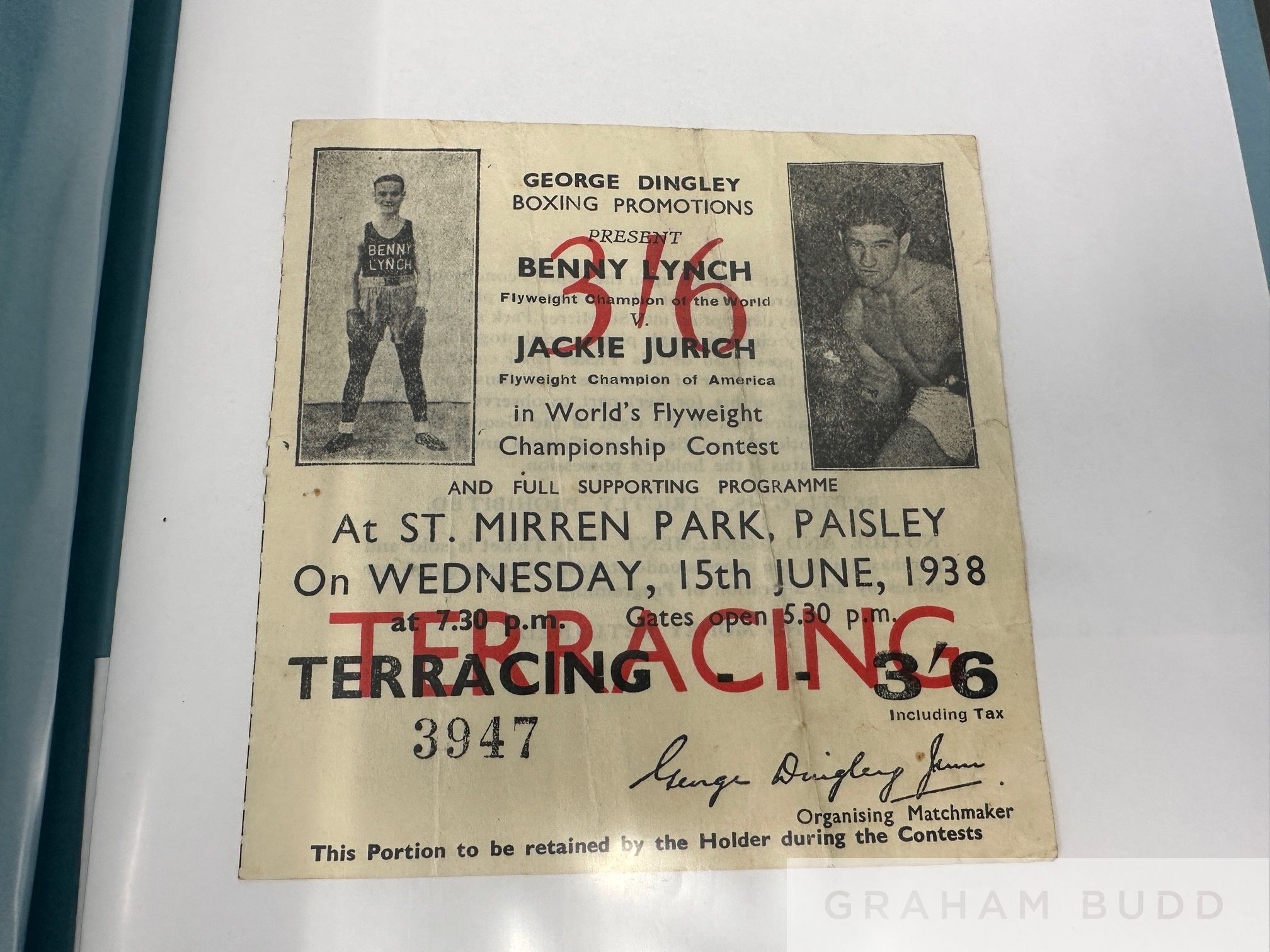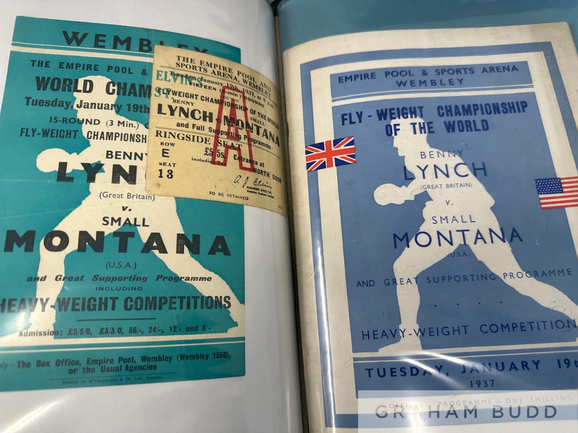 A rare and collector's Lifetime collection of Benny Lynch ephemera, comprising sixteen boxing programmes, six autographed photographs, five ticket stubs, mini fight poster and flyer Programmes: H.B. Promotion Boxing Programme, Benny Lynch v Willie Vogan,10th October 1933 at the Music Hall, George Street, Carlo Cavagnoli v. Benny Lynch, 21st March 1934 at the Kelvin Hall, Glasgow, Jimmy Campbell v. Benny Lynch, Flyweight Championship of Scotland, 16th May 1934 Evan Evans v. Benny Lynch, 29th May at the City Hall, Valentin Angelmann v. Benny Lynch, Virtually an Eliminating Contest for the Fly-Weight Championship of the World, 26th September 1934 at Cathkin Park, Glasgow Benny Lynch v. Jimmy Warnock, 11th March 1936 at King's Hall, Balmoral, Northern Ireland Benny Lynch v. Pat Warburton, 28th May 1936 at The Stadium Club Benny Lynch v. Phil Milligan, 16th November 1936 at Kings Hall Benny Lynch v. Small Montana, Fly-Weight Championship of the World, 19th January 1937, flyer and ticket stub at Empire Pool & Sports Arena, this fight saw Lynch defeat Montana and thus unified the World Fly-weight Championship Benny Lynch v. Nipper (Len) Hampston, 1st March 1937 at Kings Hall Benny Lynch v. Len Hampston, 22nd March 1937 at Leeds Town Hall Benny Lynch v. Roy Underwood, Flyweight Championship of Great Britain, Europe & the World, 13th October 1937 at Shawfield Park Benny Lynch v. Georges Bataille at The Granby Halls, Leicester, 13th December Benny Lynch v. Peter Kane, 24th March 1938 at Liverpool Football Ground Benny Lynch v. Kayo Morgan, International Bantam-Weight, 27th September 1938 at Shawfield Stadium Benny Lynch v. Aurel Toma, 3rd October 1938 at Empress Stadium, Earl's Court, programmes include multiple bouts taken place on same evening, ticket stubs other than mentioned above Benny Lynch v. Harry Orton, 12th December 1935, Benny Lynch v. Peter Kane, 13th October, Benny Lynch v. Jackie Jurich, 15th June 1938 and a copy of The Ring Magazine with Benny Lynch on the cover, 1937 etc, (2 green folders)