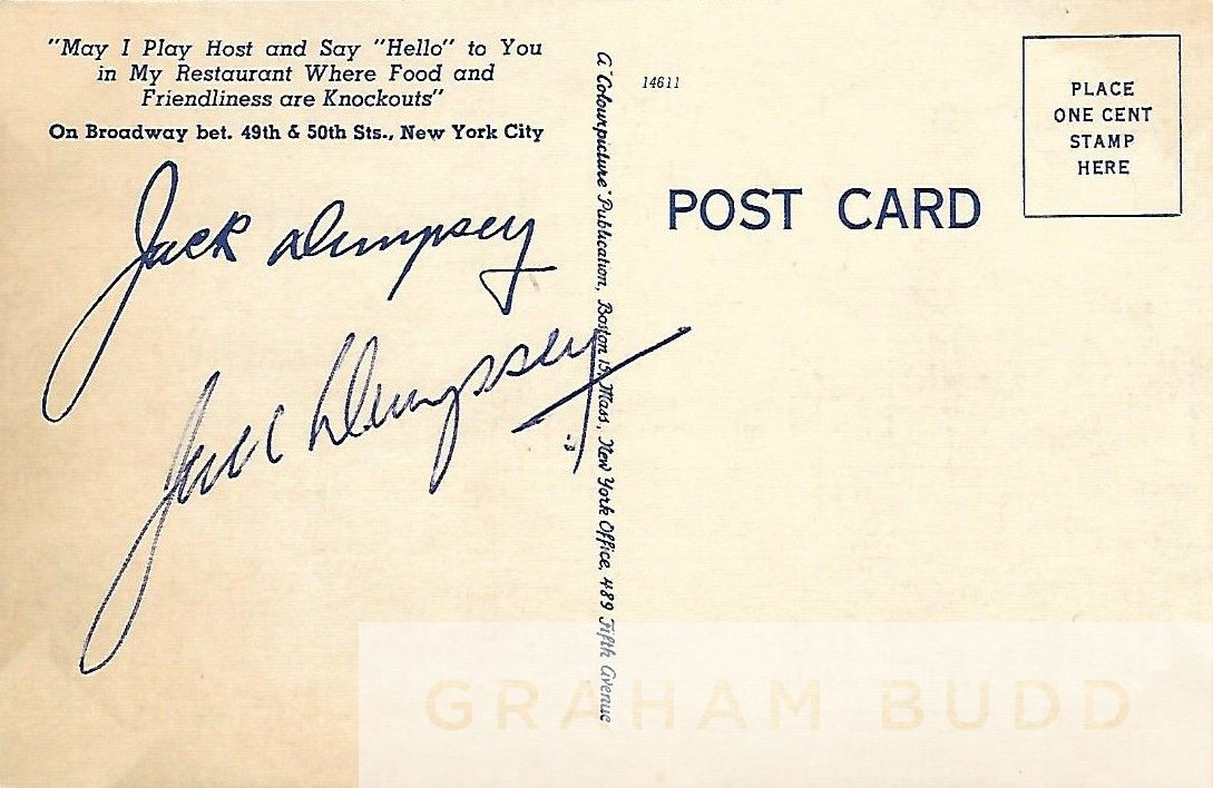 Boxing: Jack Dempsey signed 5.5 x 3.5in. postcard, front image shows Jack's “The Meeting Place of the World” Broadway restaurant with the reverse signed by Jack in blue biro beneath his printed autograph and restaurant text, in near mint condition