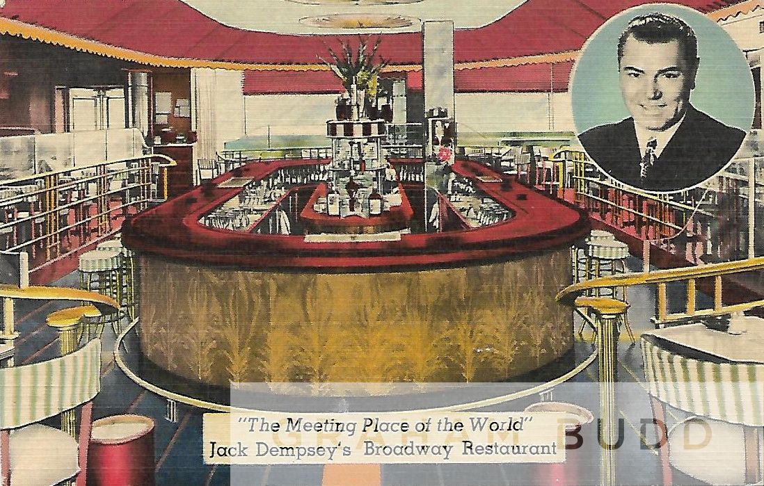 Boxing: Jack Dempsey signed 5.5 x 3.5in. postcard, front image shows Jack's “The Meeting Place of the World” Broadway restaurant with the reverse sig