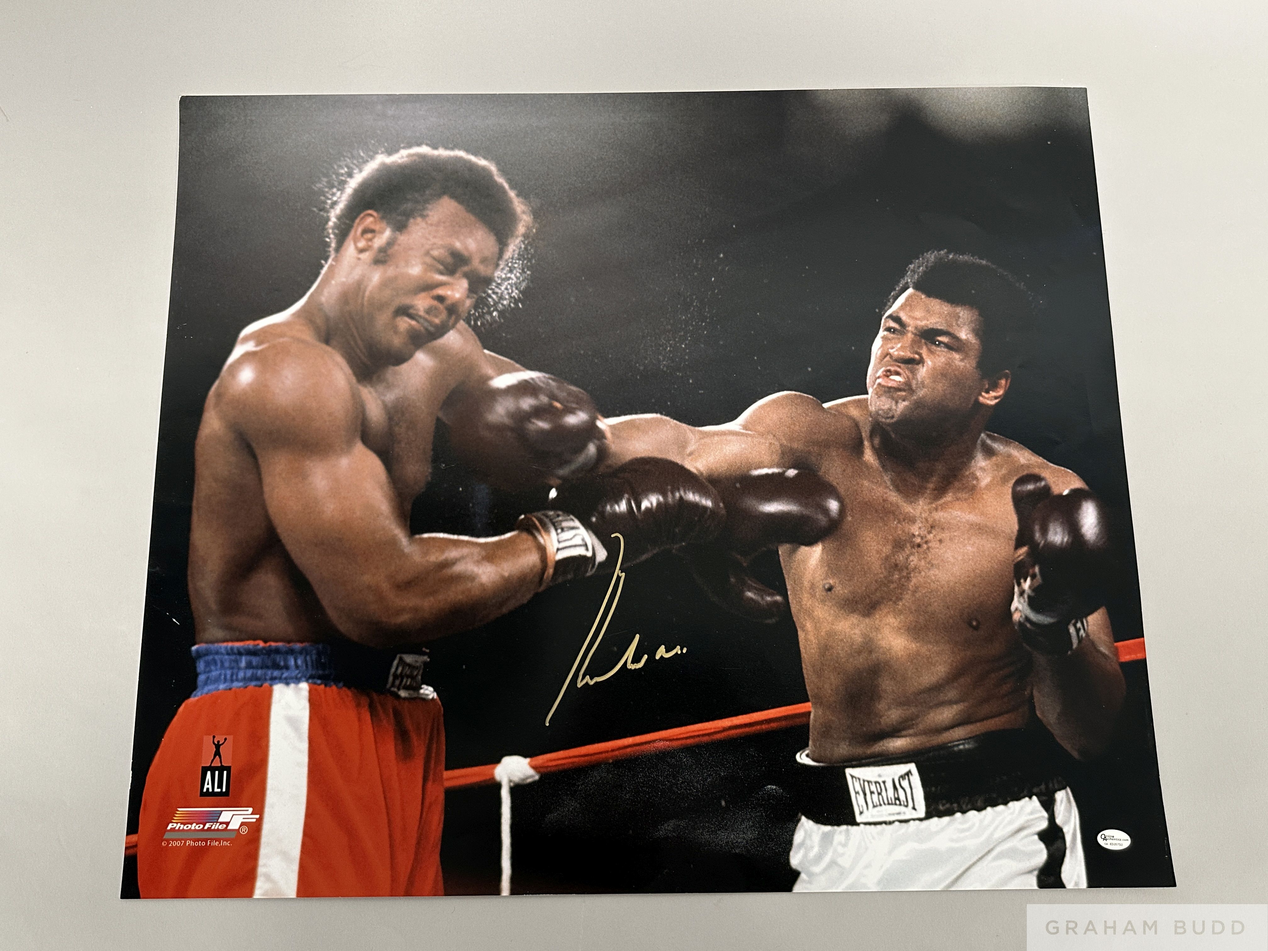 Rumble in the Jungle fight action photographed autographed by Muhammad Ali, marker authenticated by Online Authentics.com. OA-8305730, 50 by 60cm. unframed