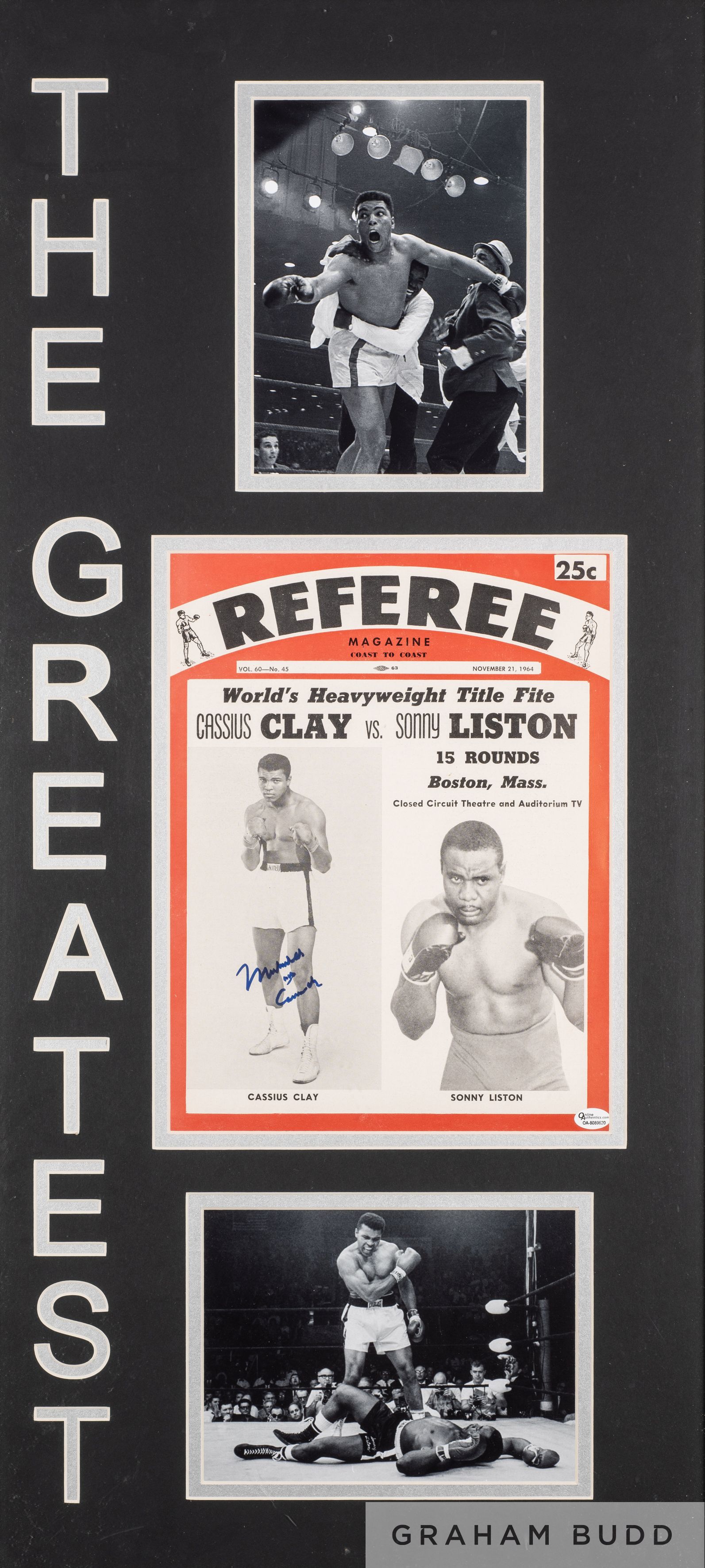 Referee Magazine of world heavyweight title fight of Cassius Clay v Sonny Liston signed by Muhammad Ali aka Cassius Clay on the front cover authenticated by Online Authentics.com. OA-8089620, framed and glazed, 96 by 51cm overall