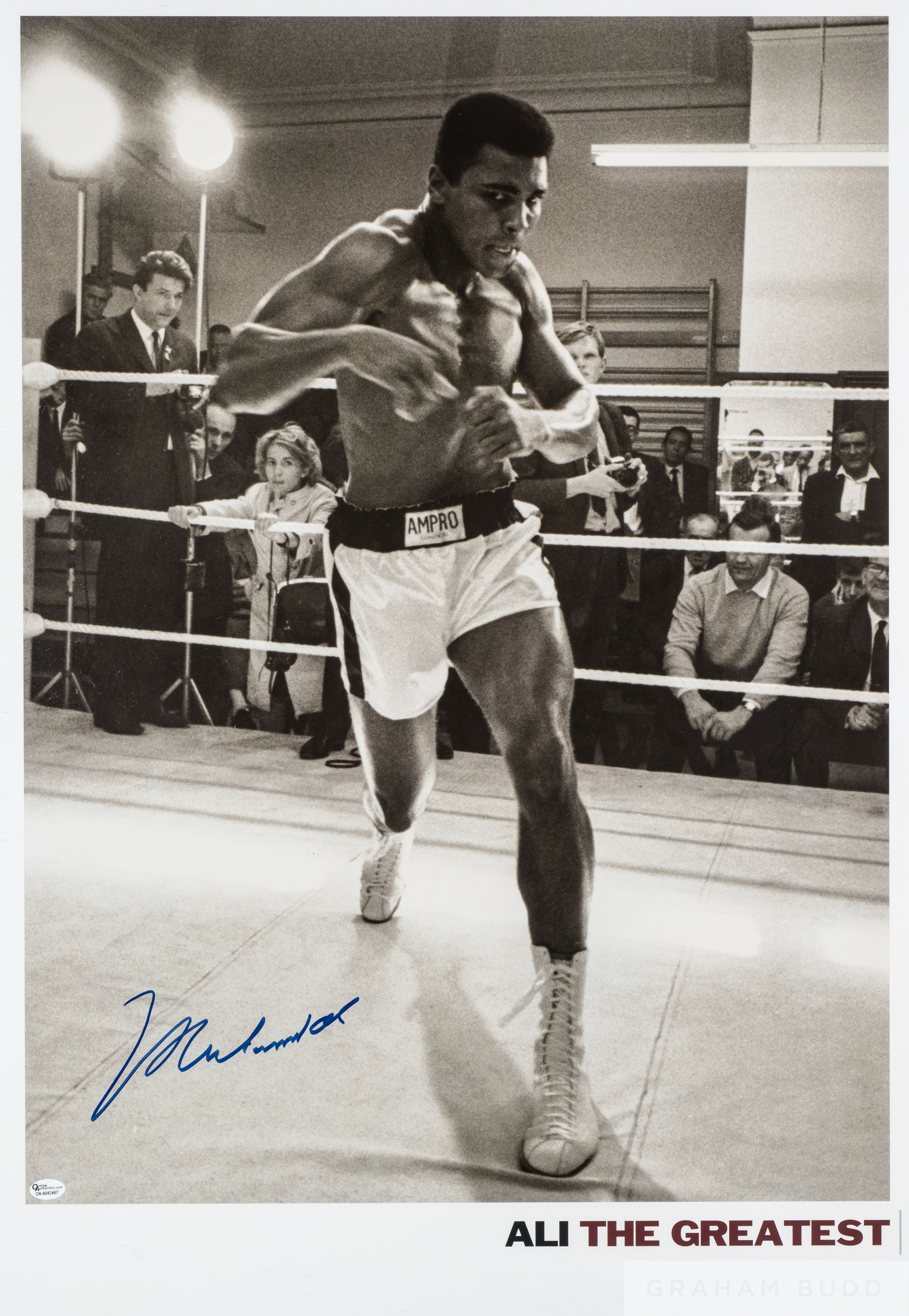 Muhammad Ali “The Greatest”, signed photograph authenticated by Online Authentics.com, OA-8042467, framed and glazed, 85 by 65cm overall