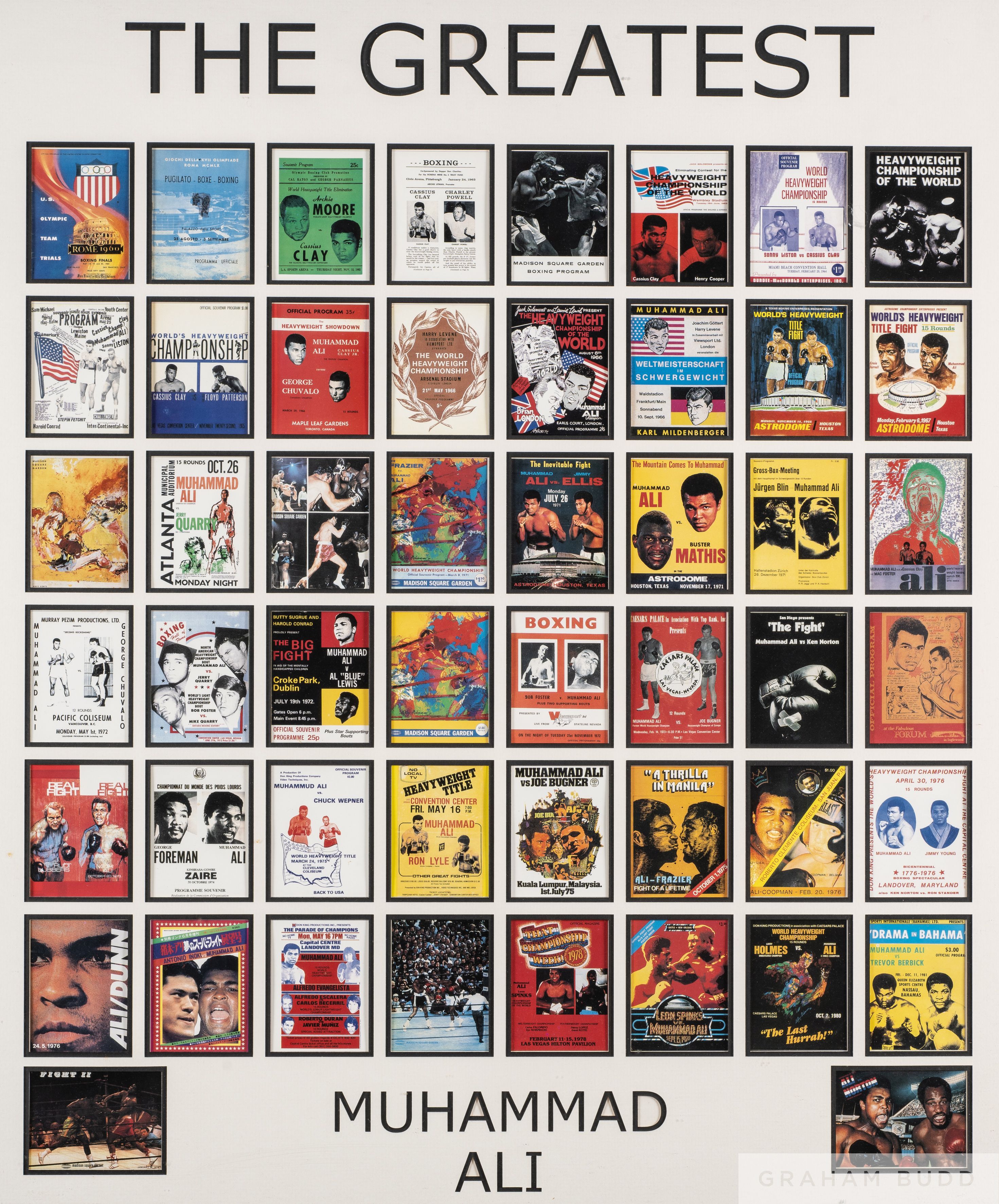 Display of fifty reproduction fight picture cards of Muhammad Ali The Greatest, in common-mount, framed and glazed, 81 by 73cm overall